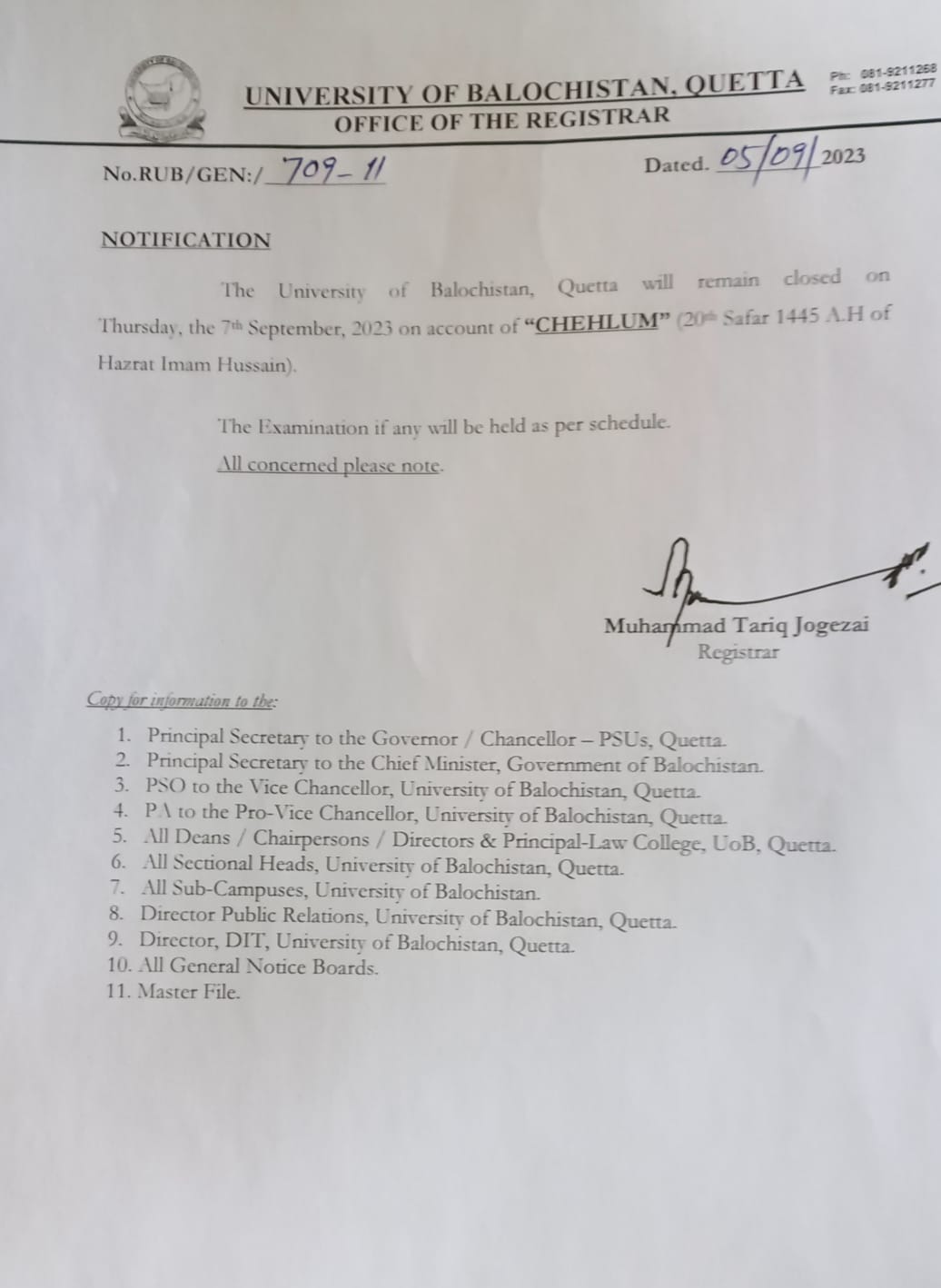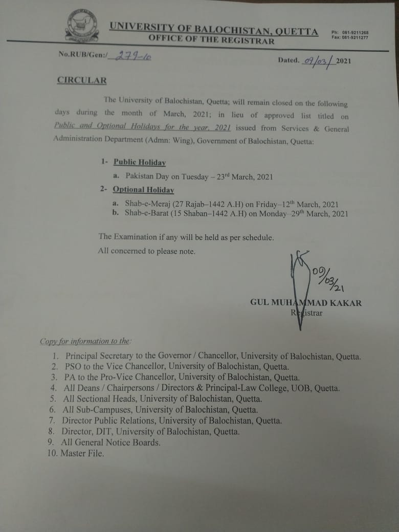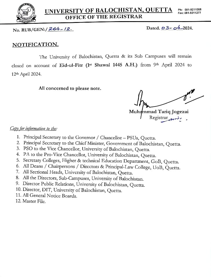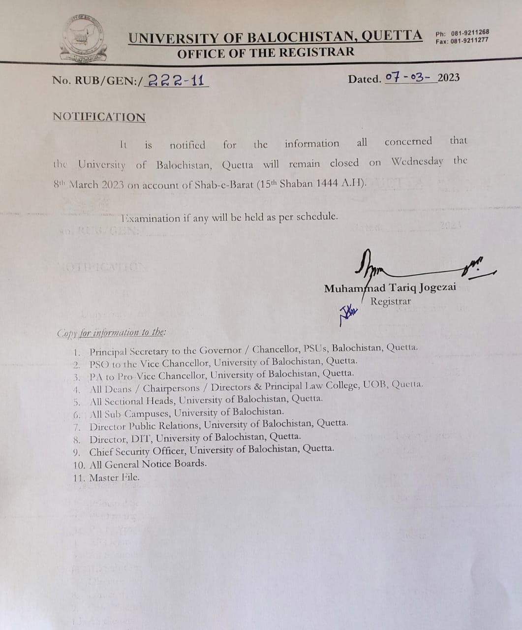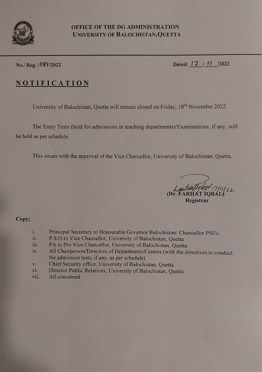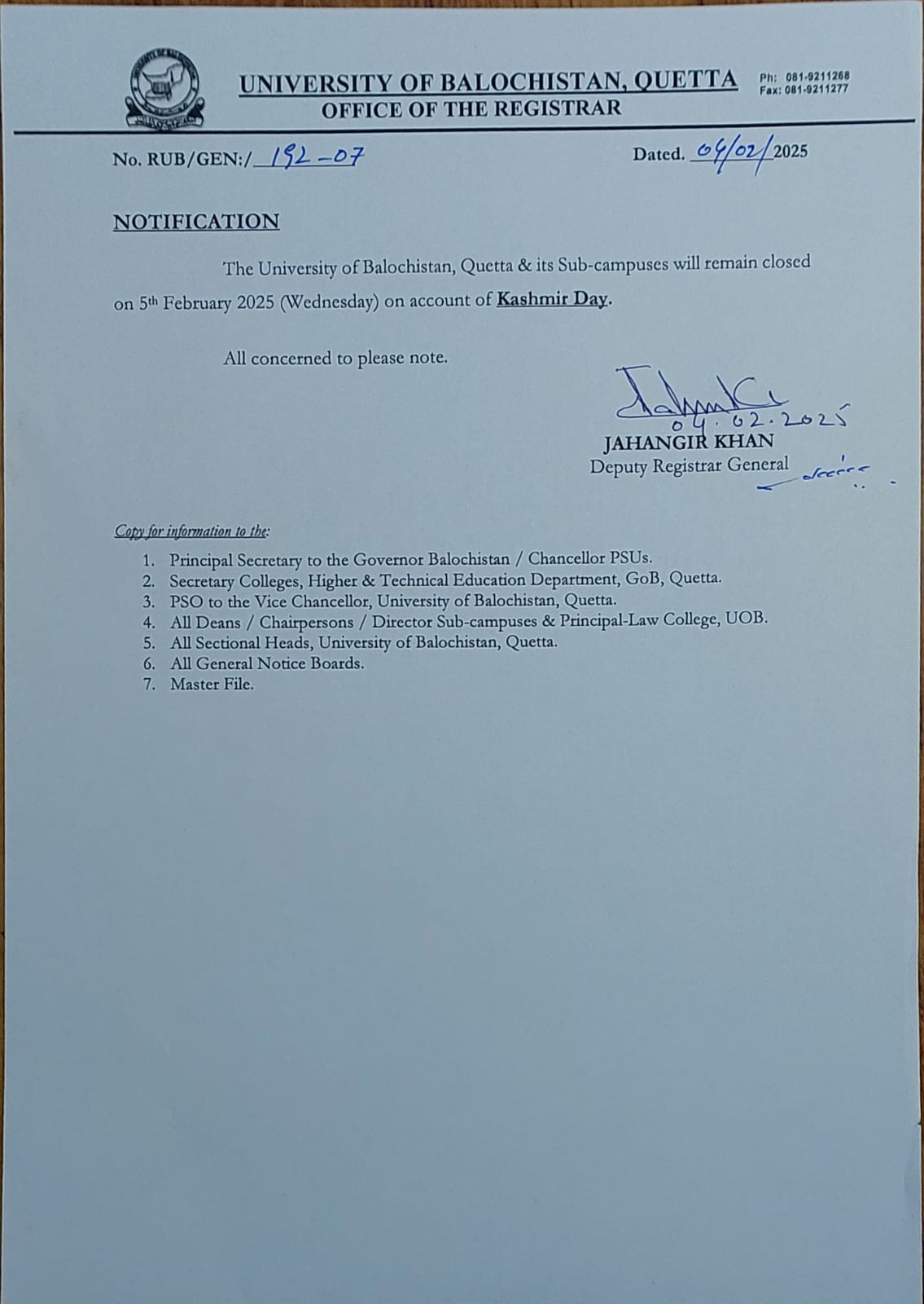 University of Balochistan Quetta & its Sub-Campuses will remain closed on account of