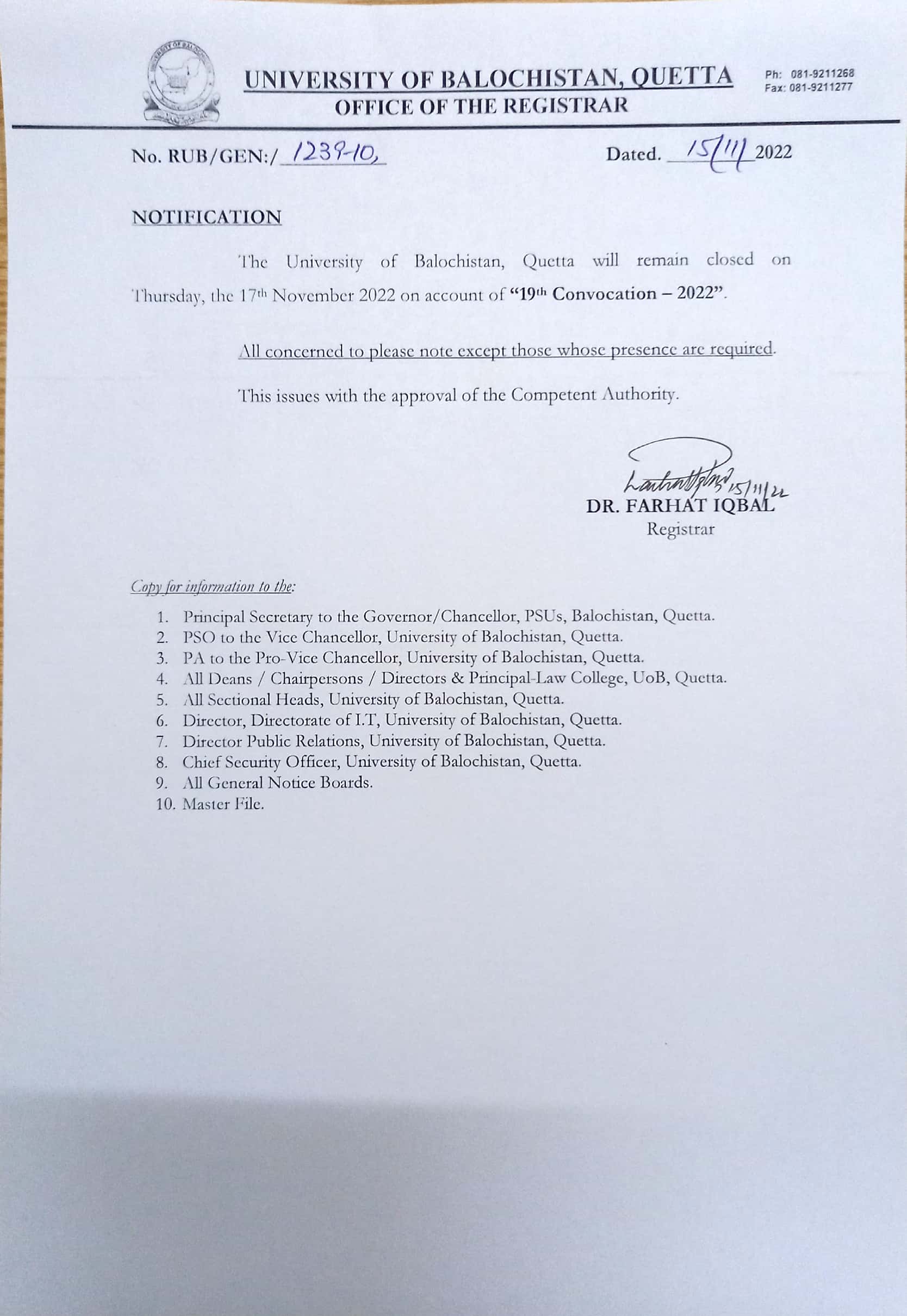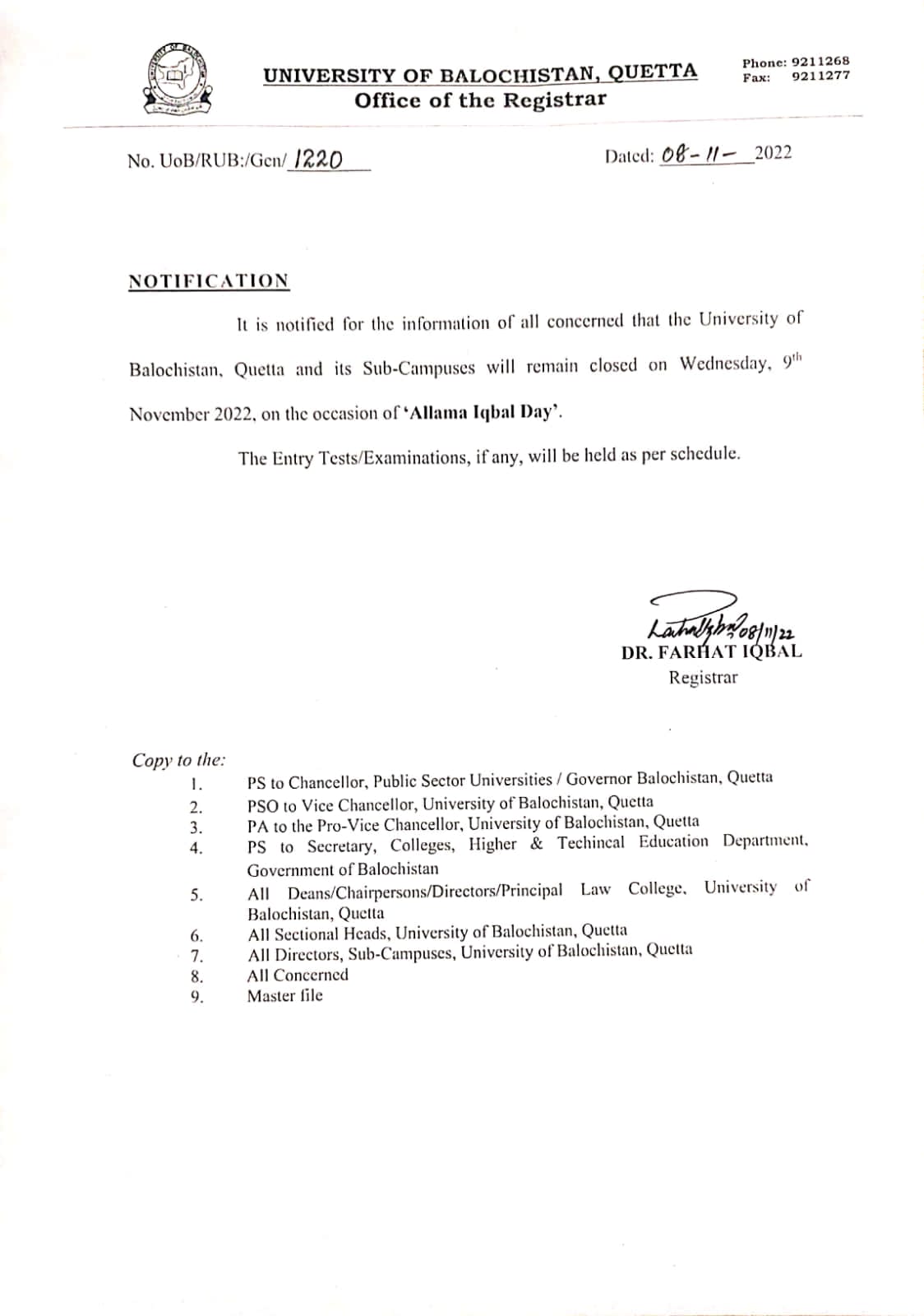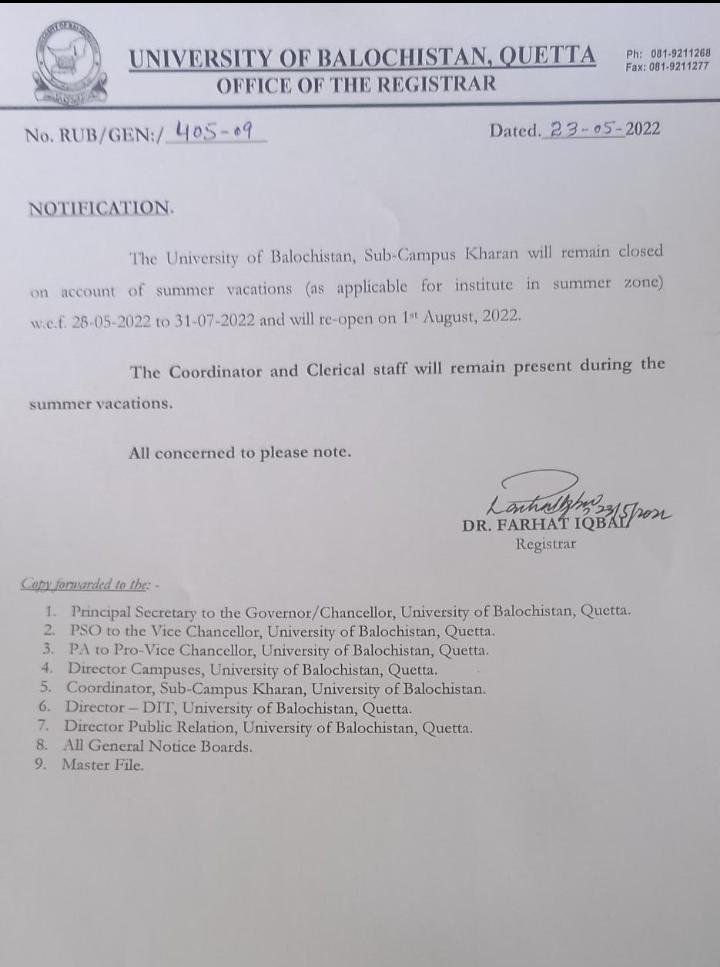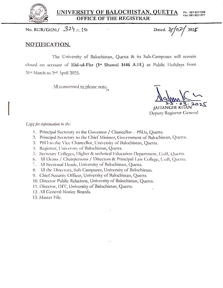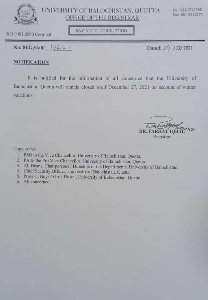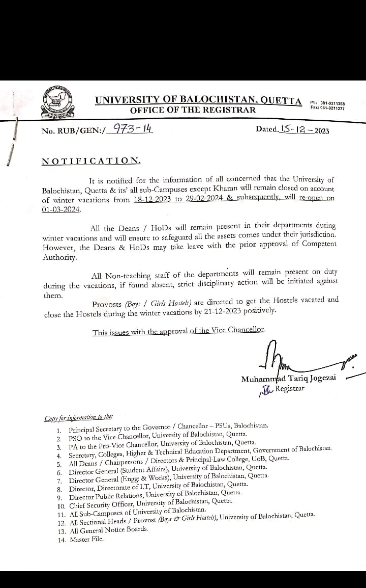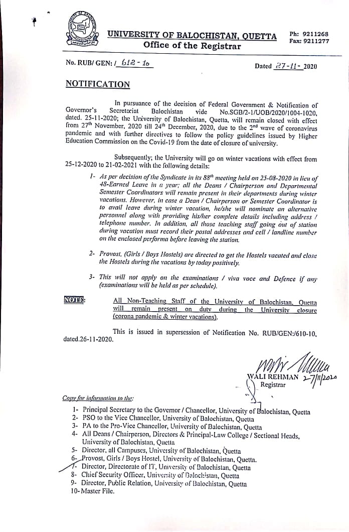 University of Balochistan Quetta & its Sub-Campuses will remain closed on account of