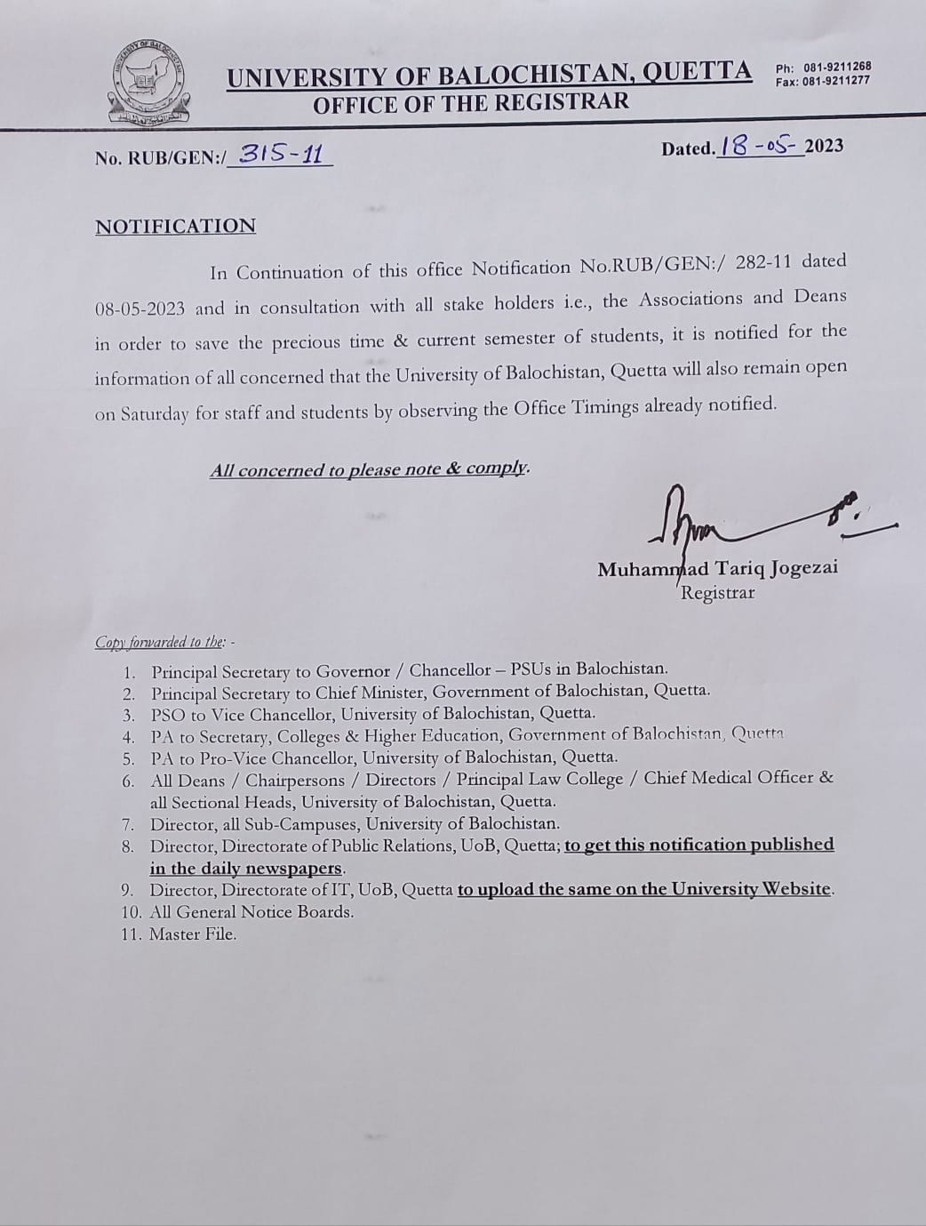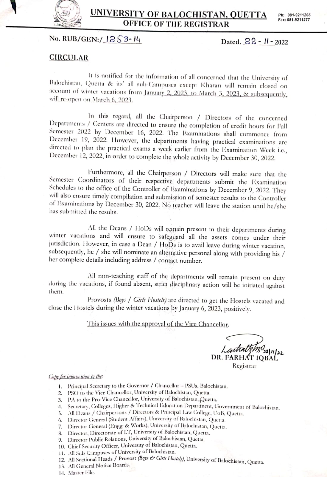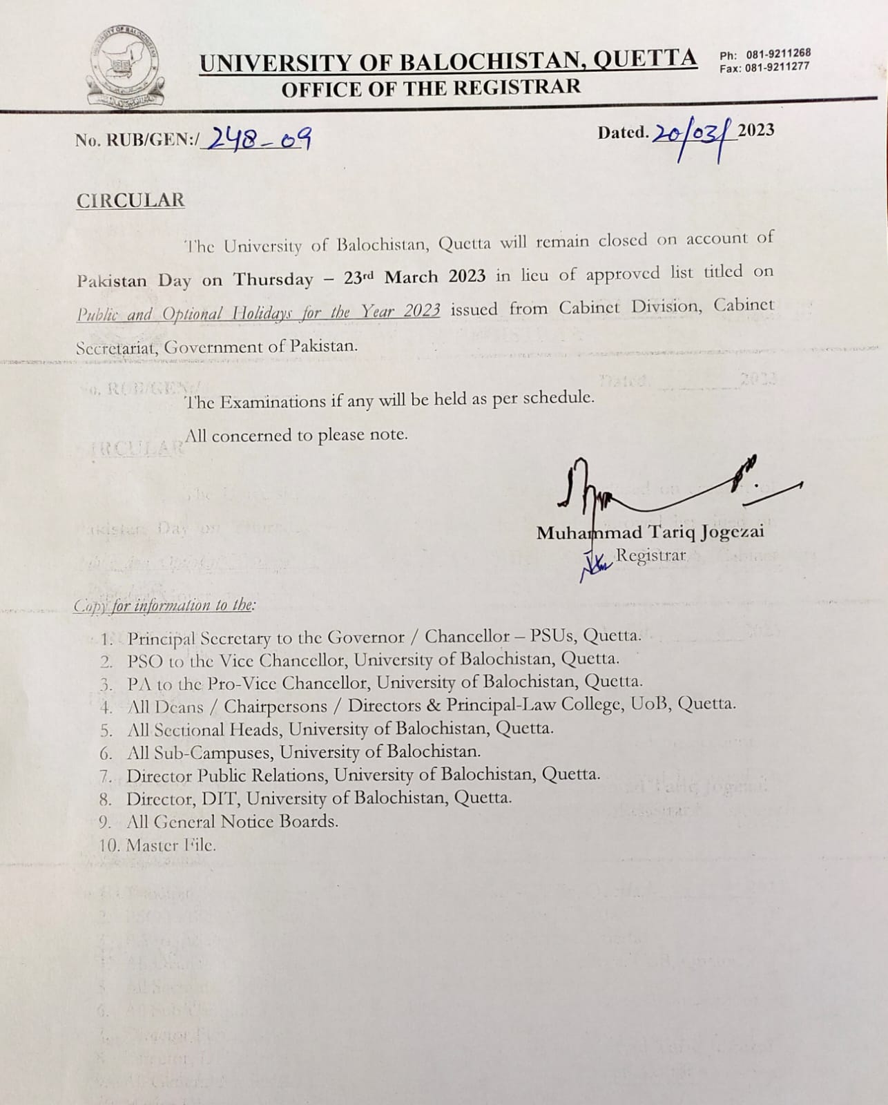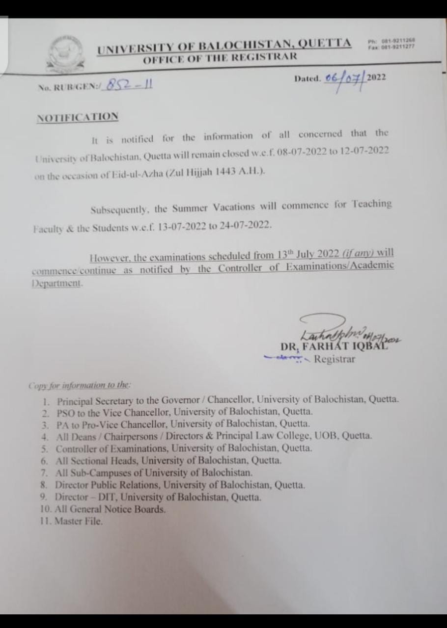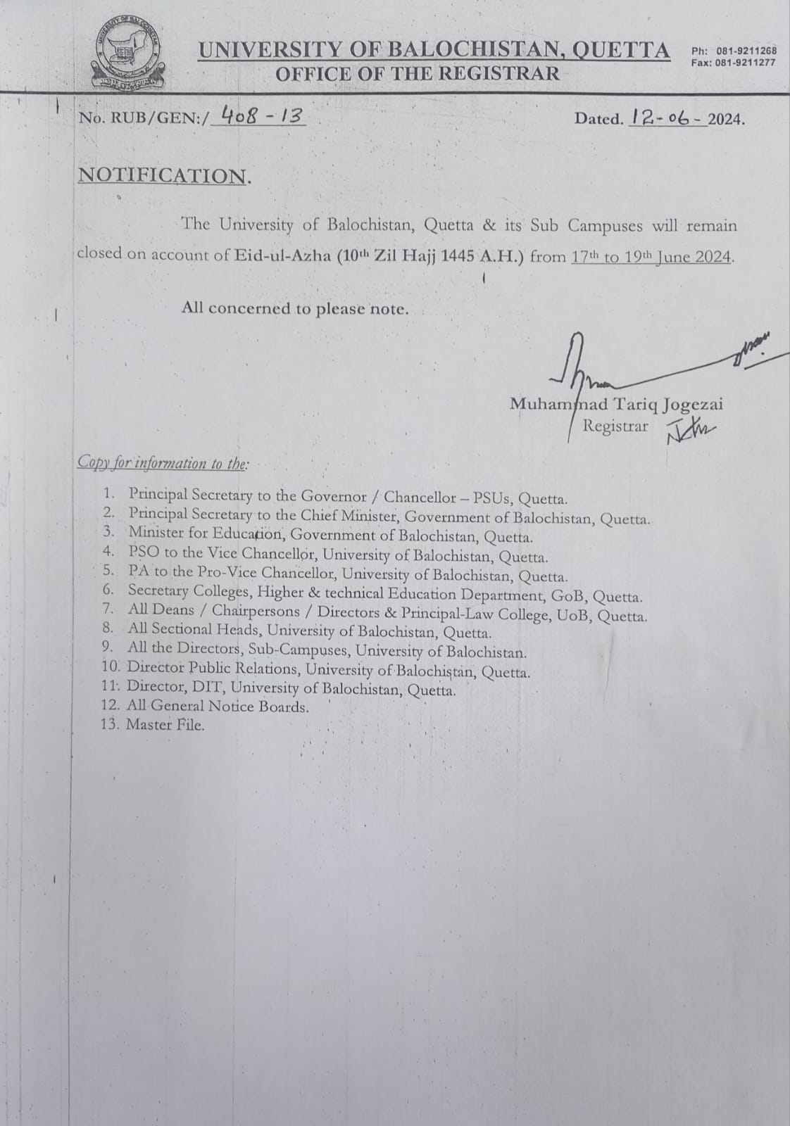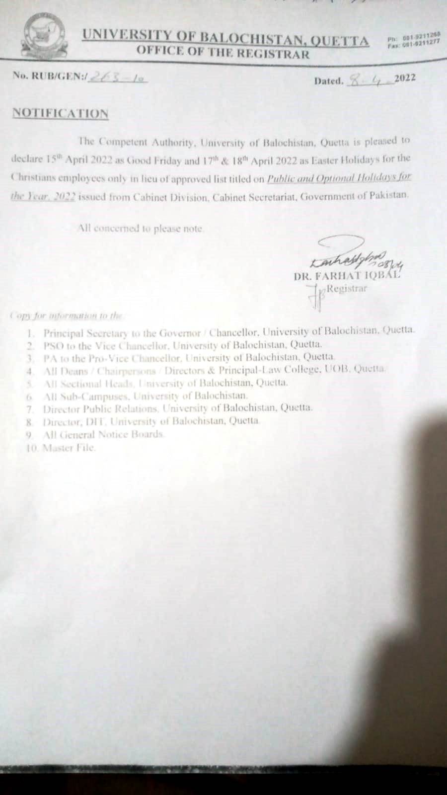 University of Balochistan Quetta & its Sub-Campuses will remain closed on account of
