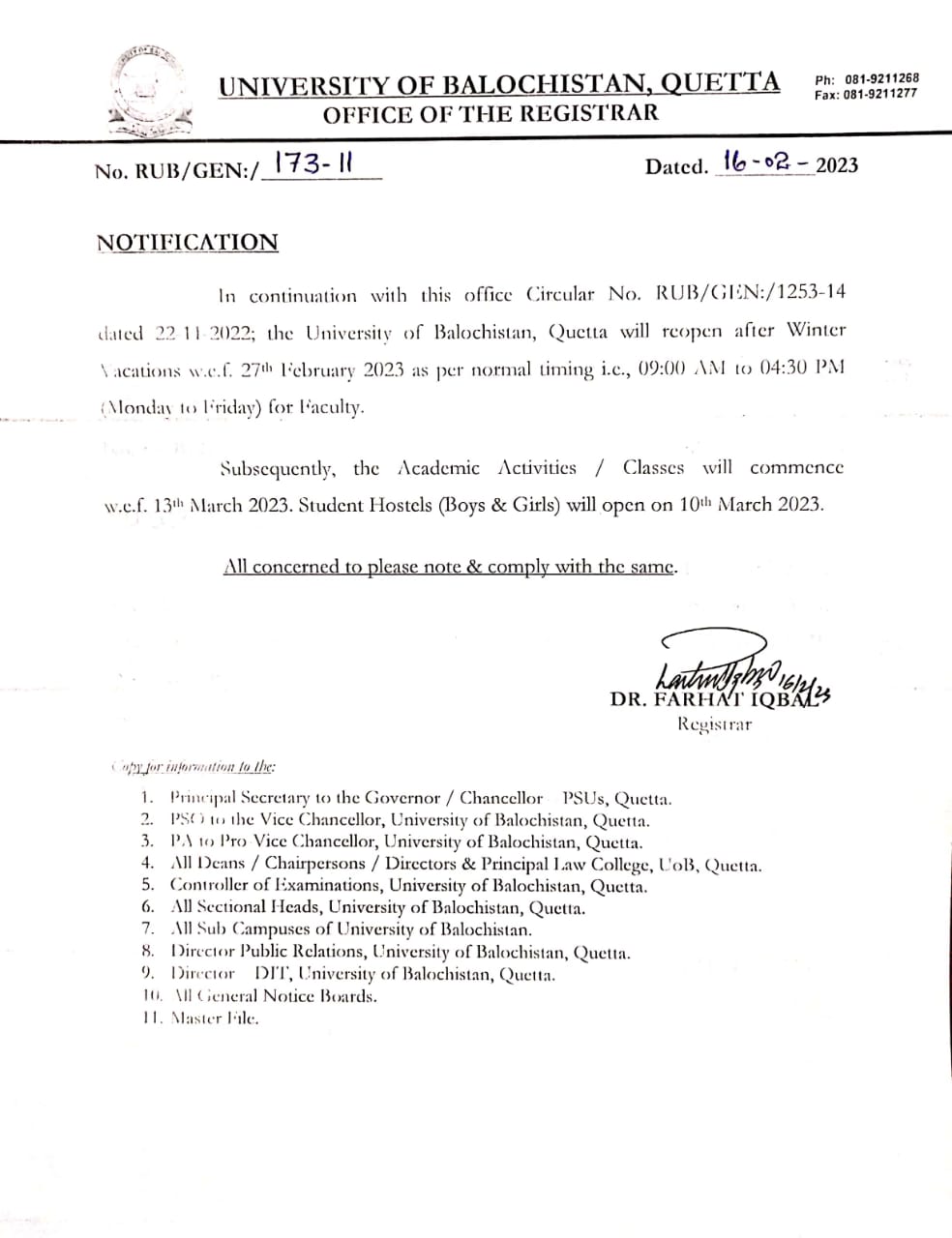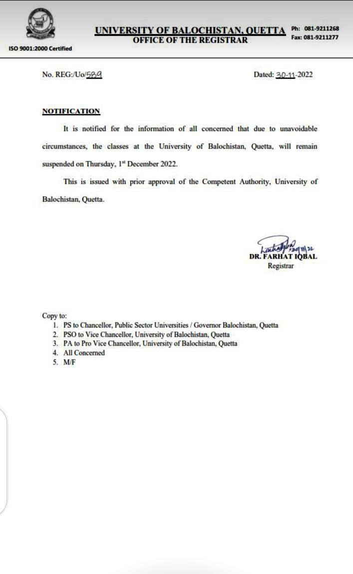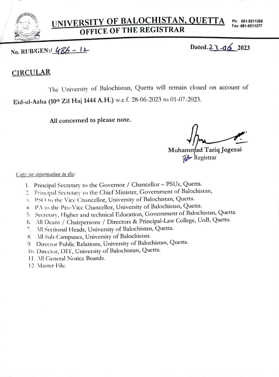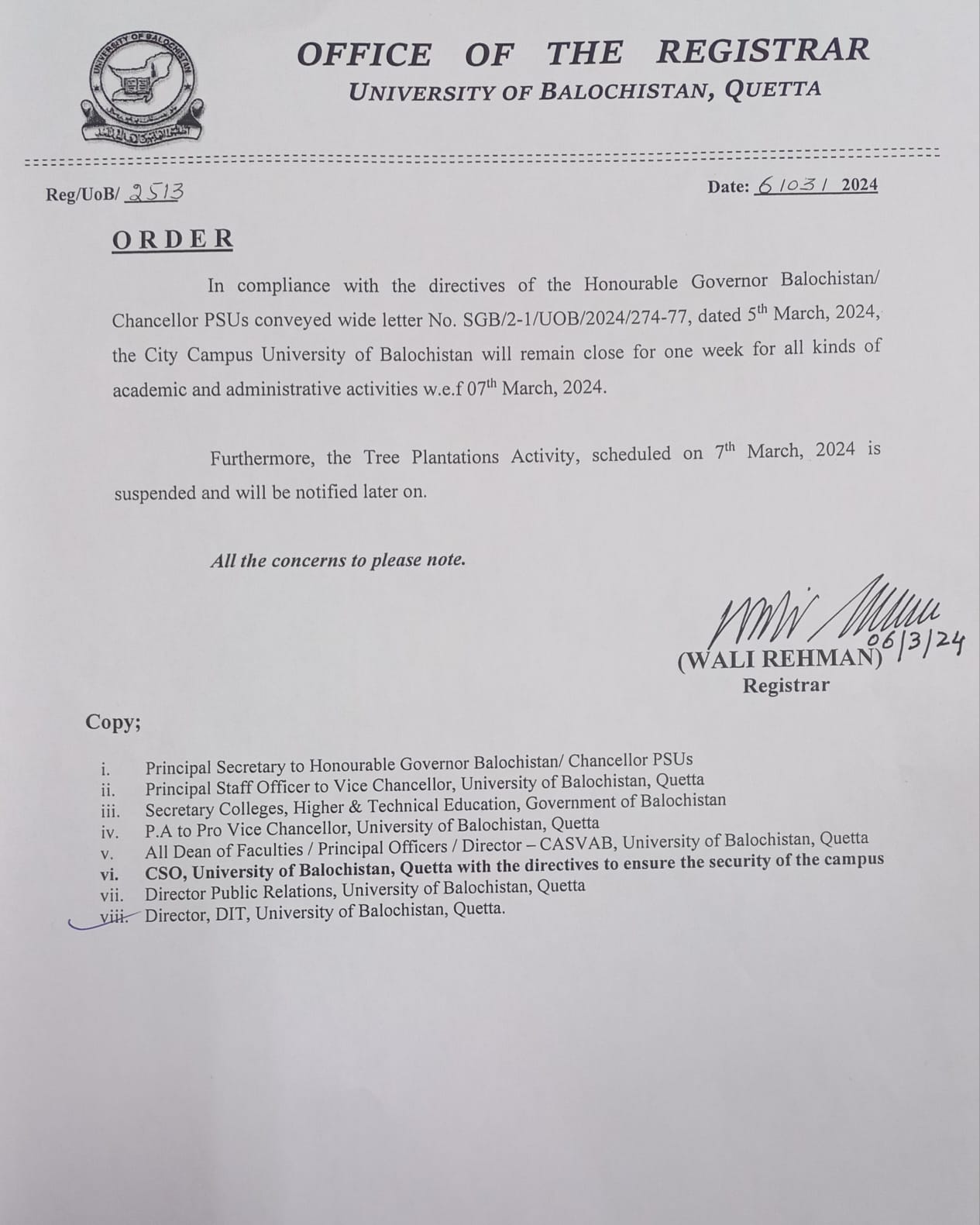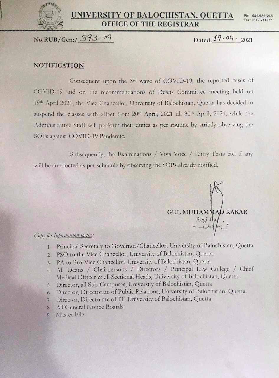 University of Balochistan Quetta & its Sub-Campuses will remain closed on account of