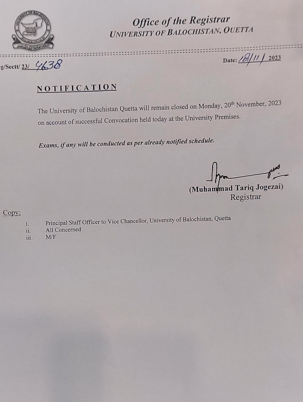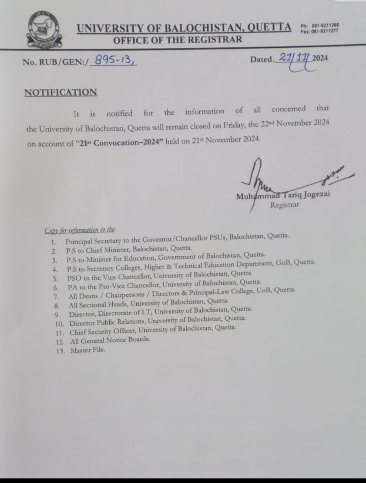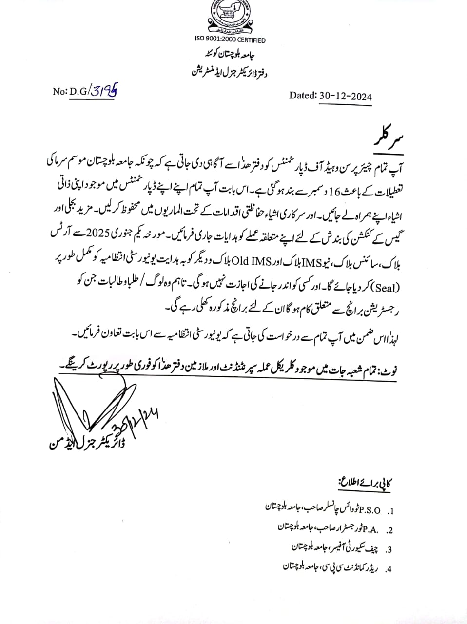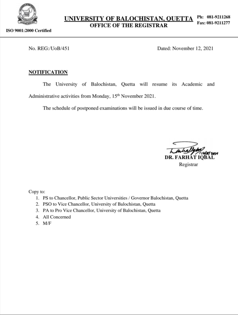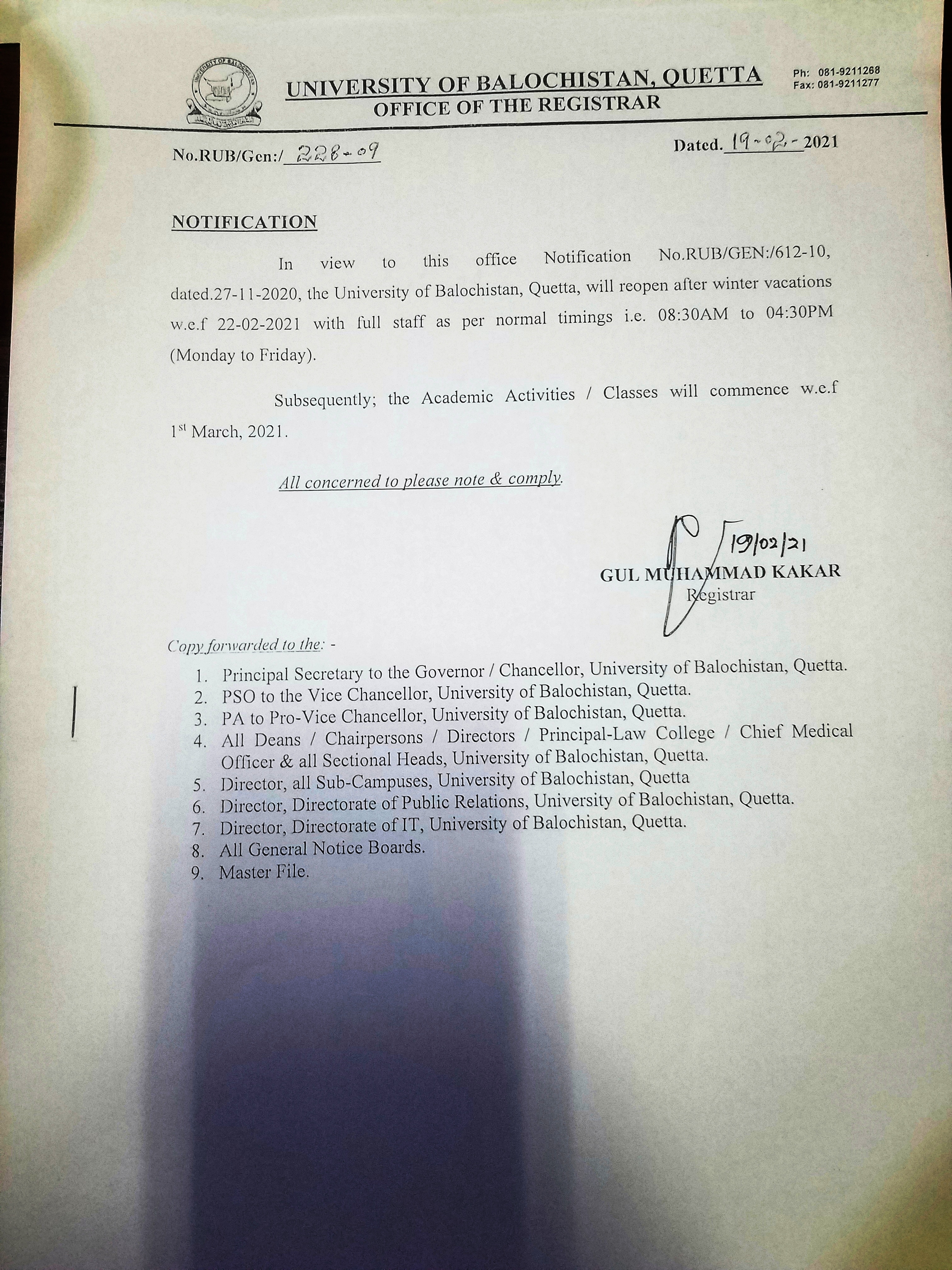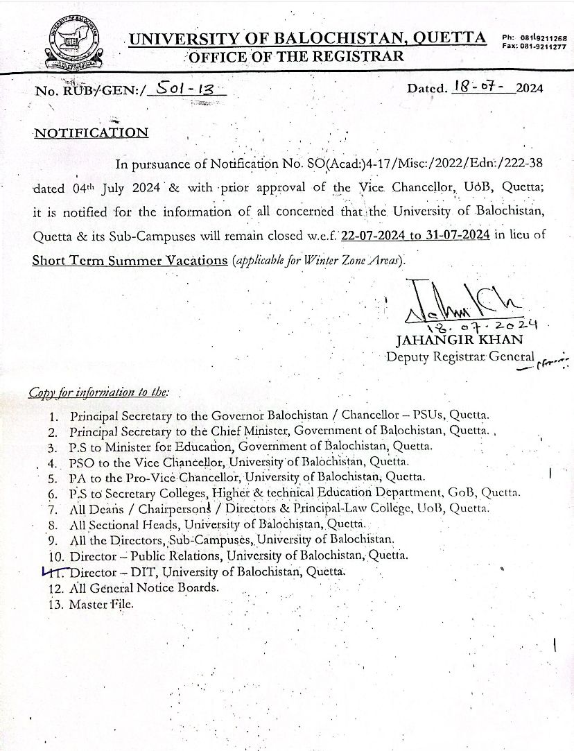 University of Balochistan Quetta & its Sub-Campuses will remain closed on account of