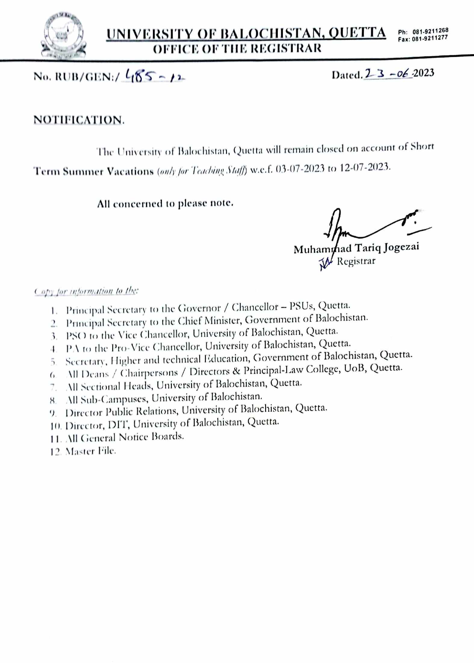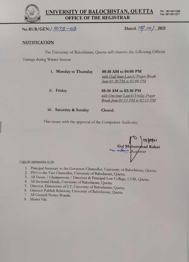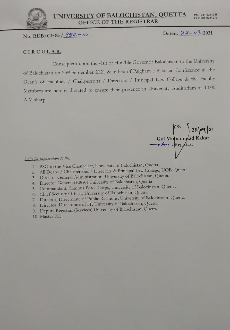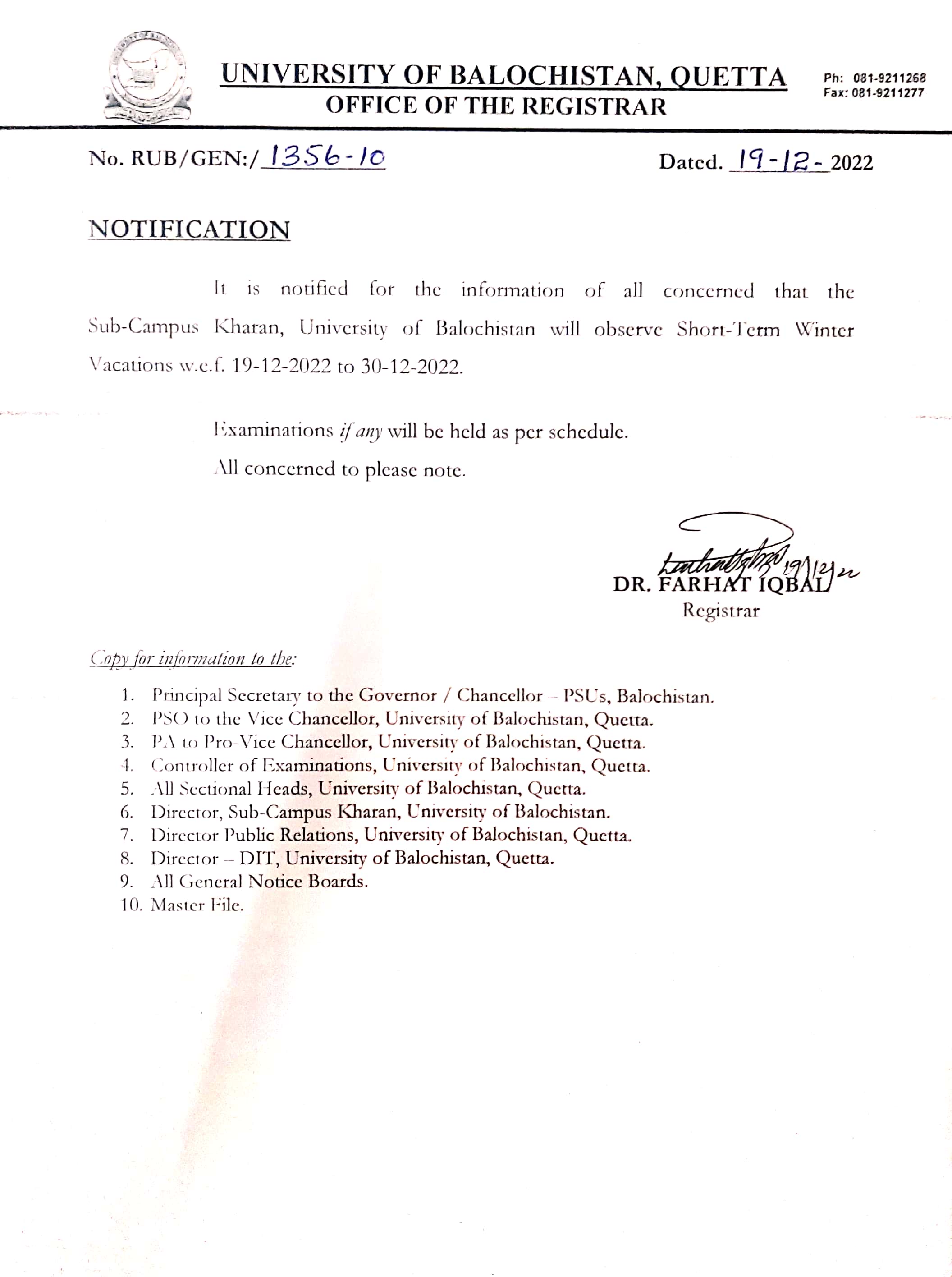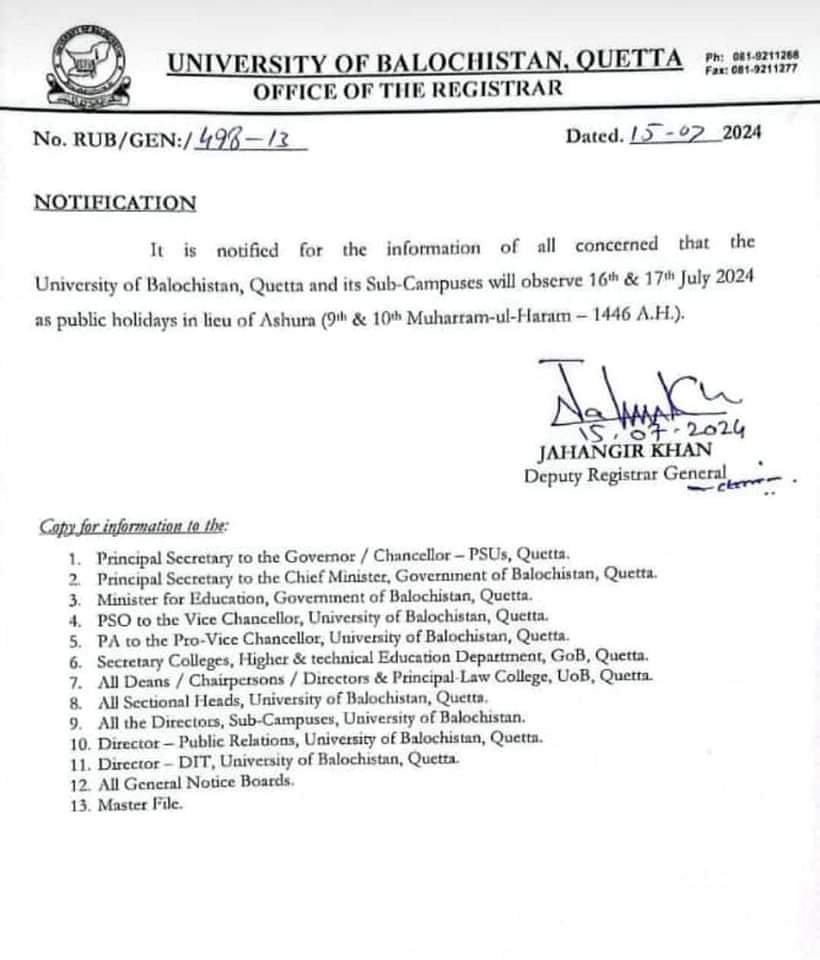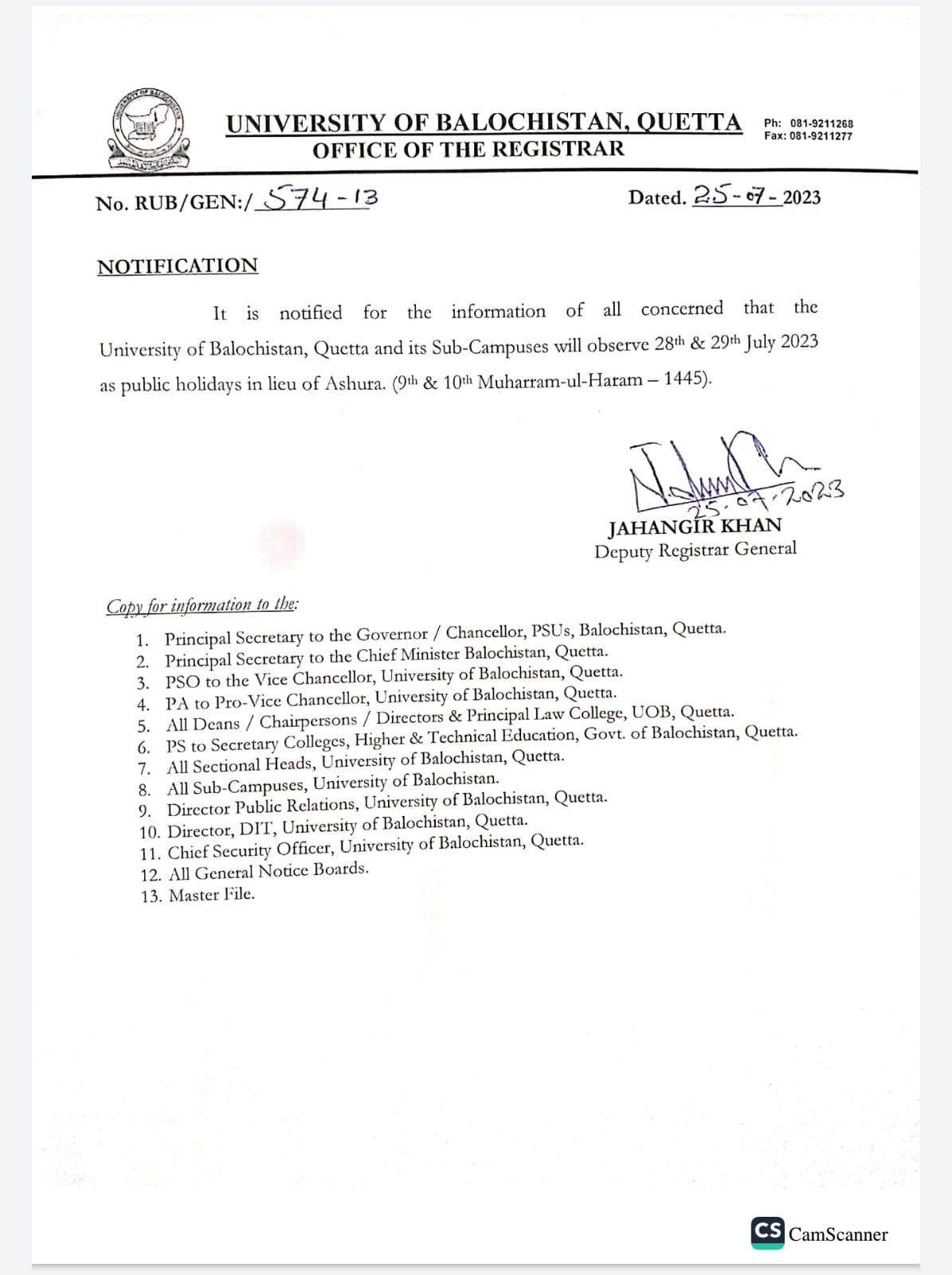 University of Balochistan Quetta & its Sub-Campuses will remain closed on account of