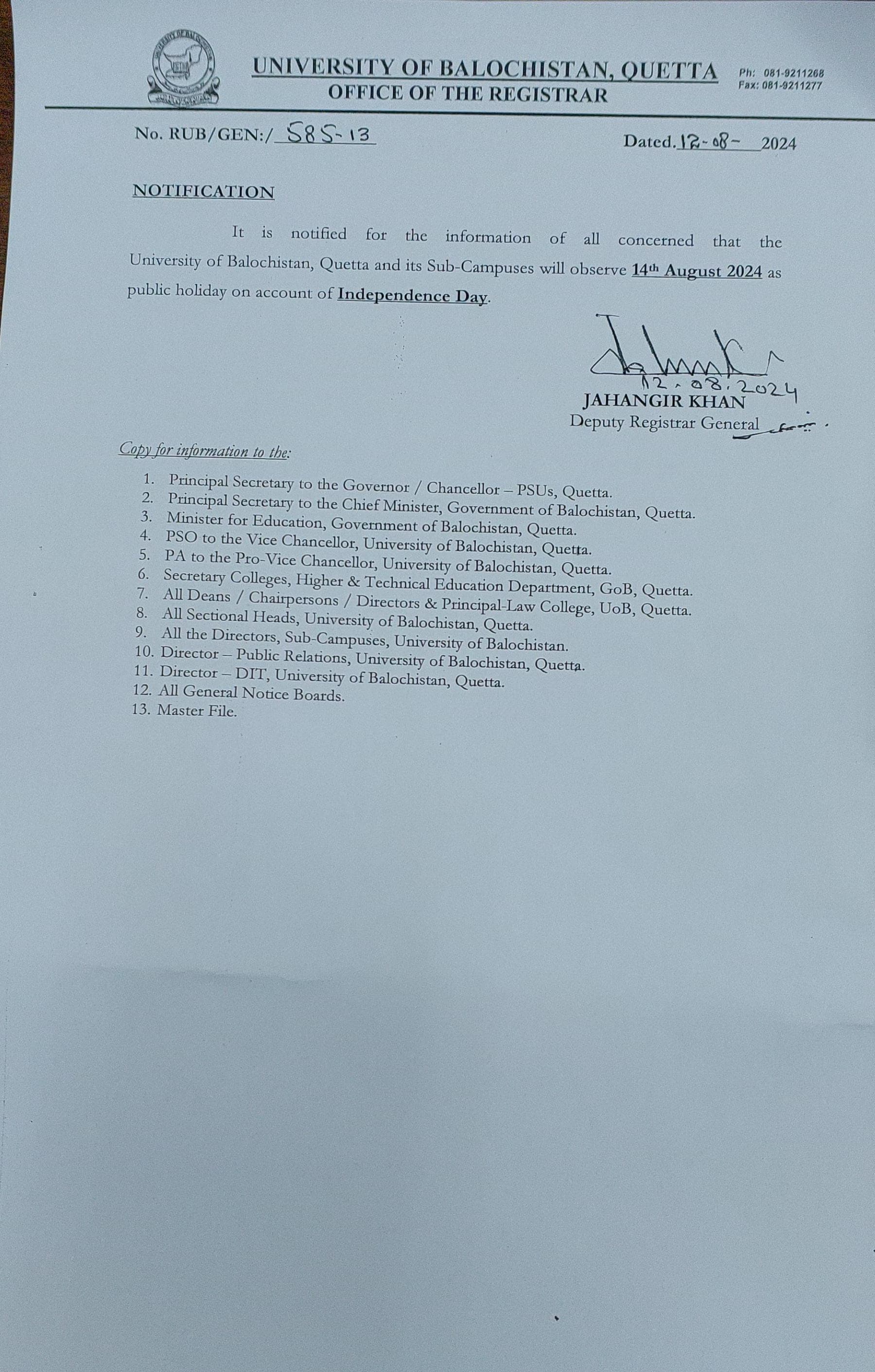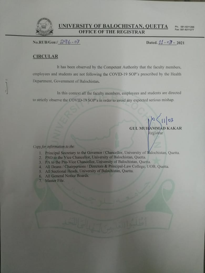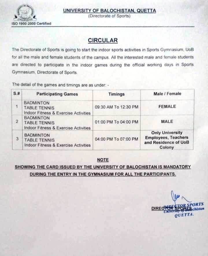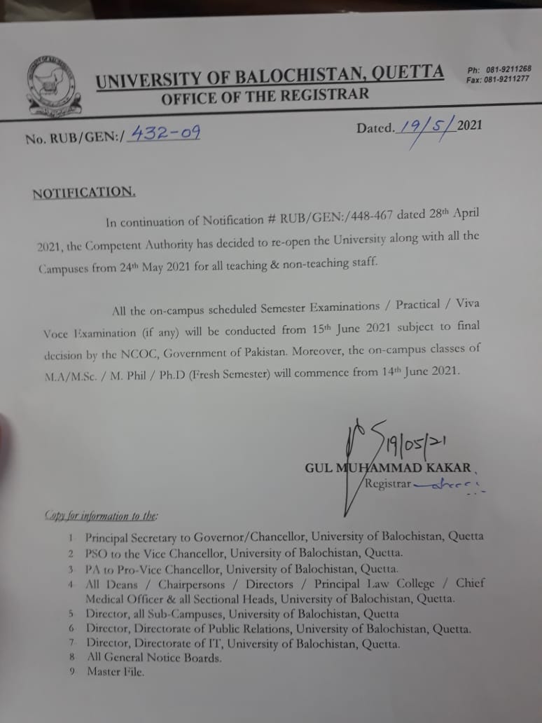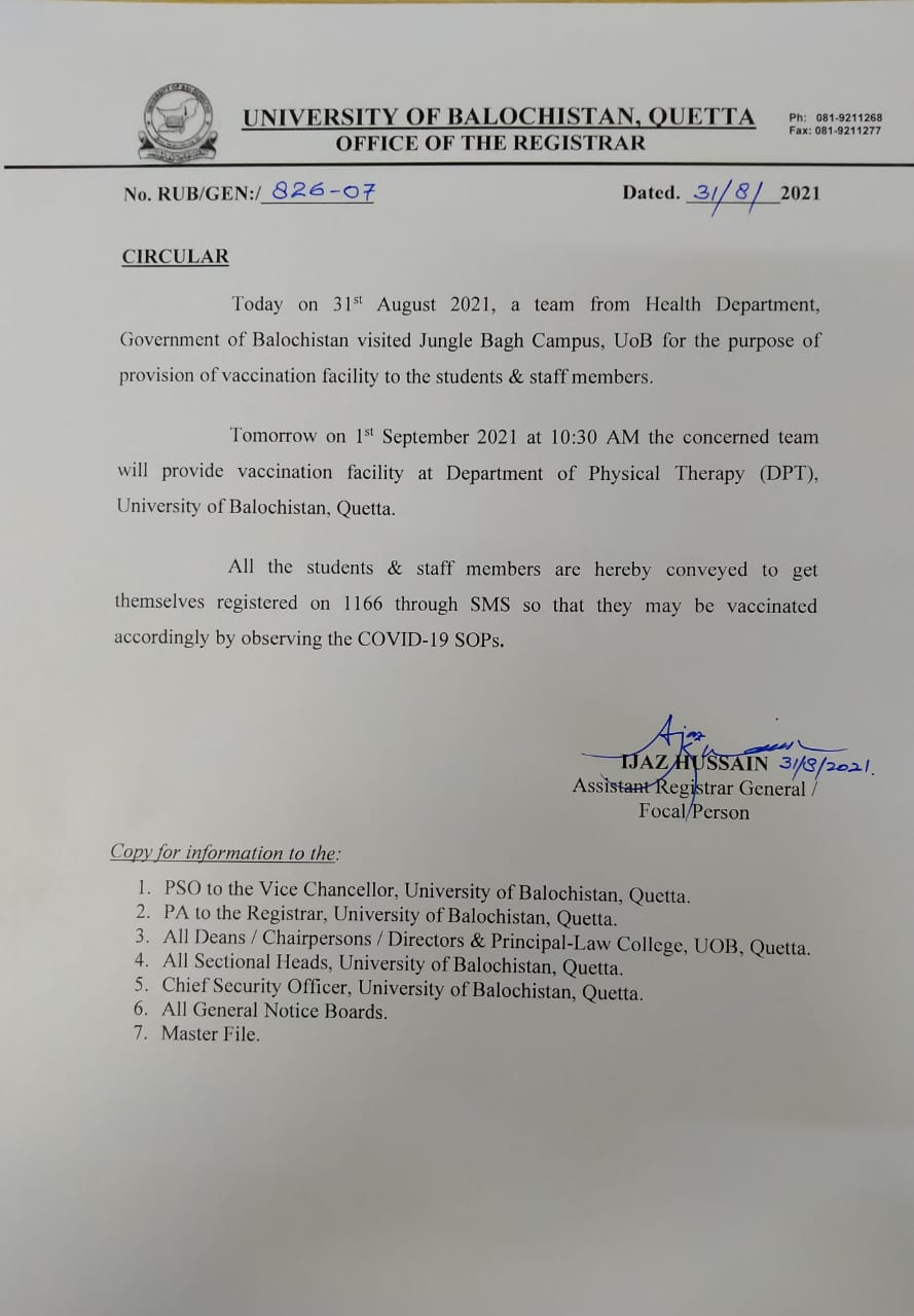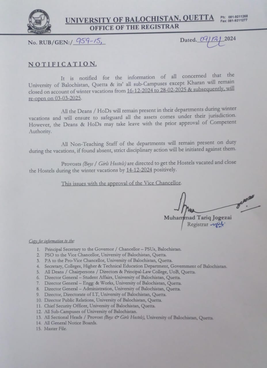 University of Balochistan Quetta & its Sub-Campuses will remain closed on account of
