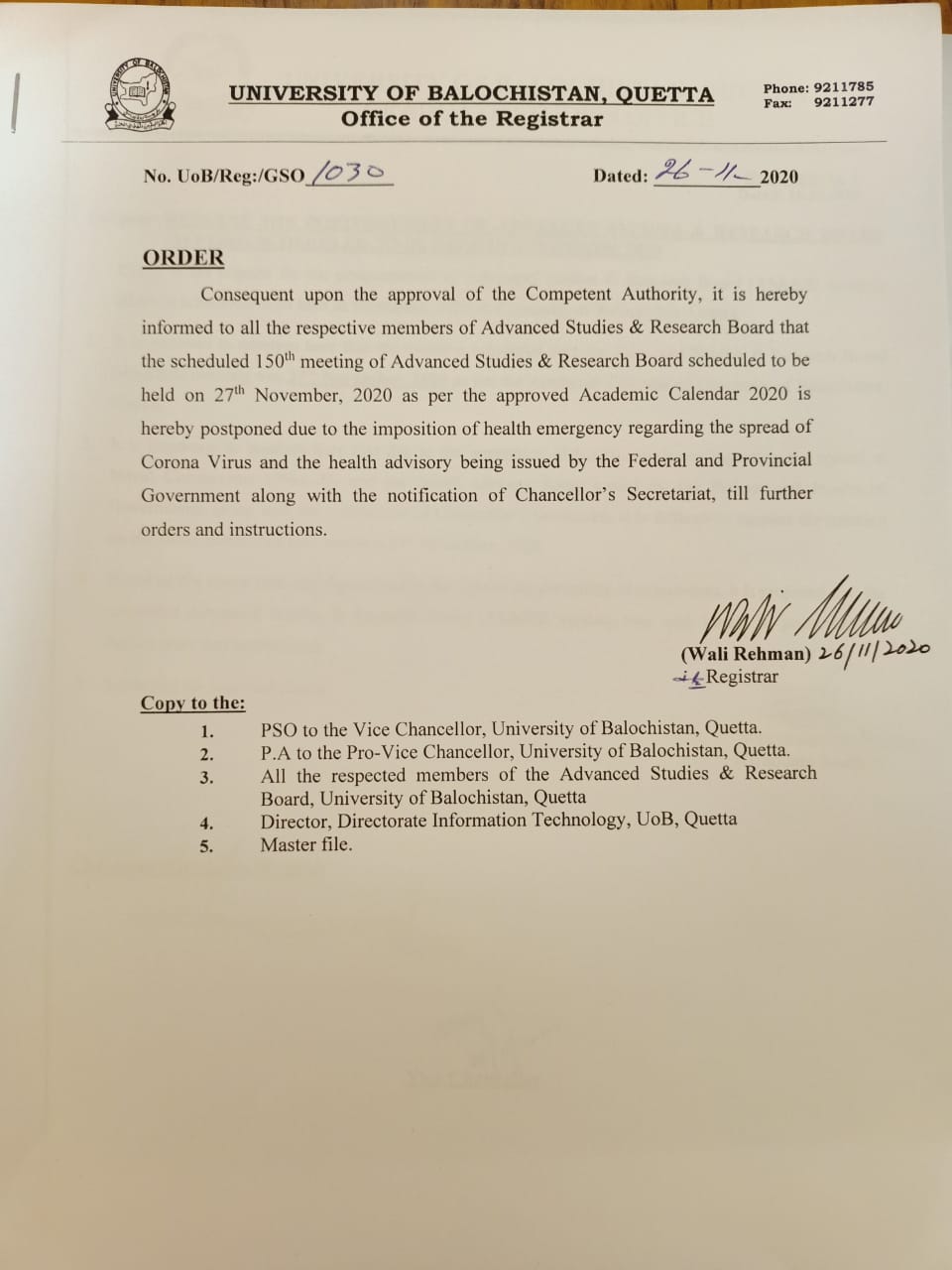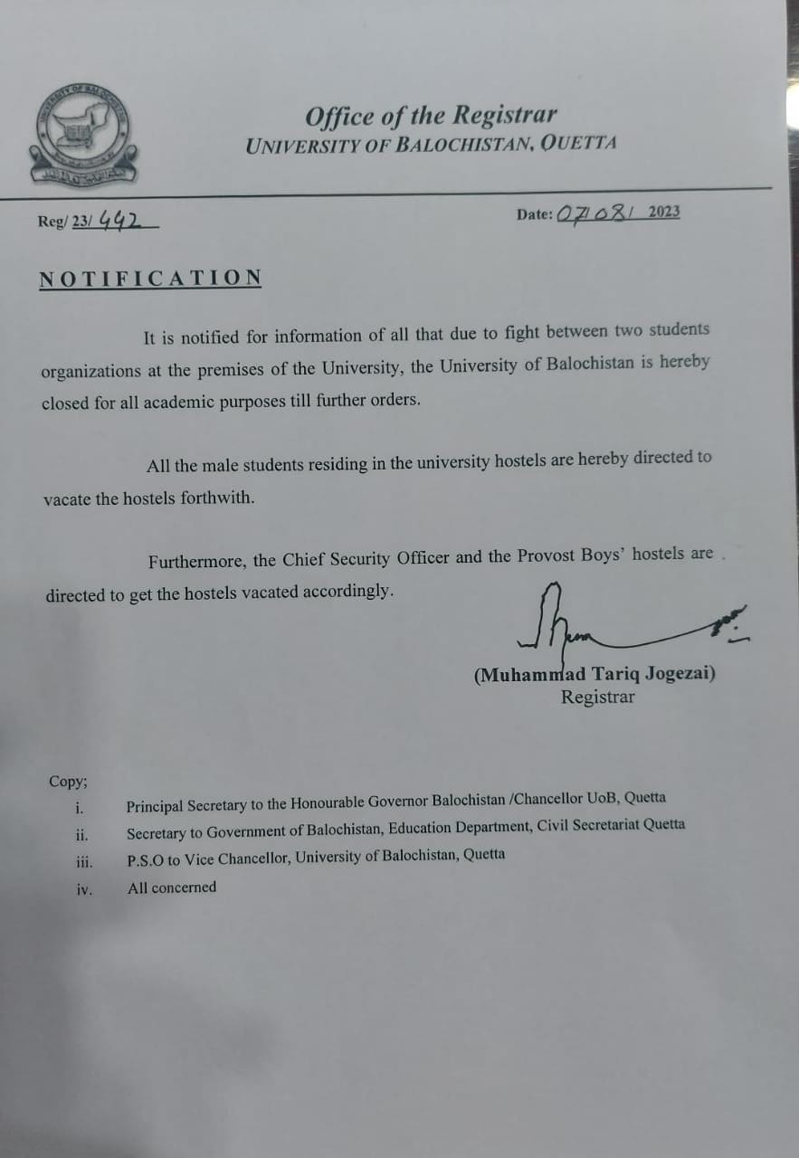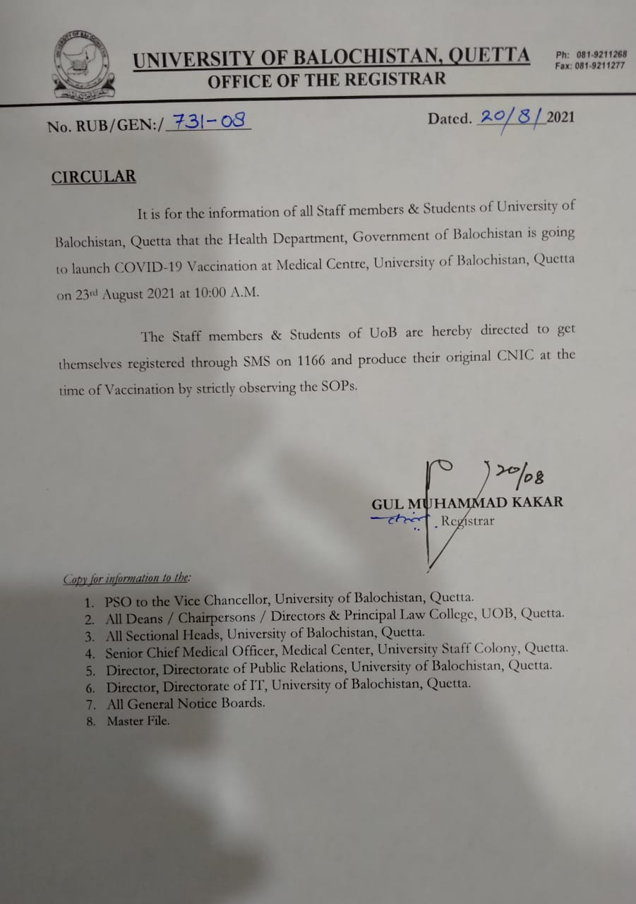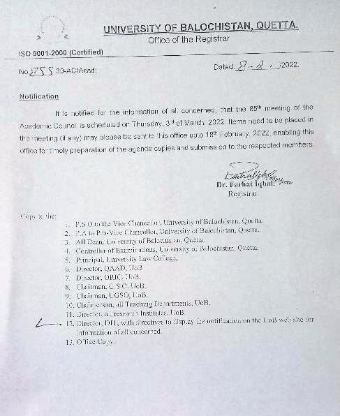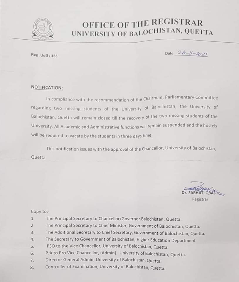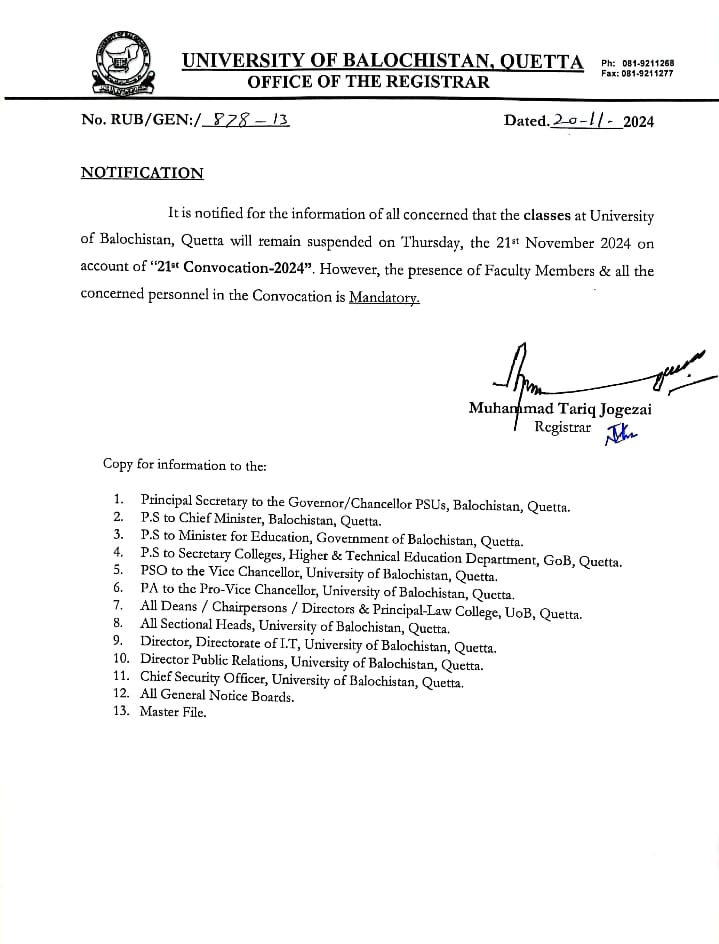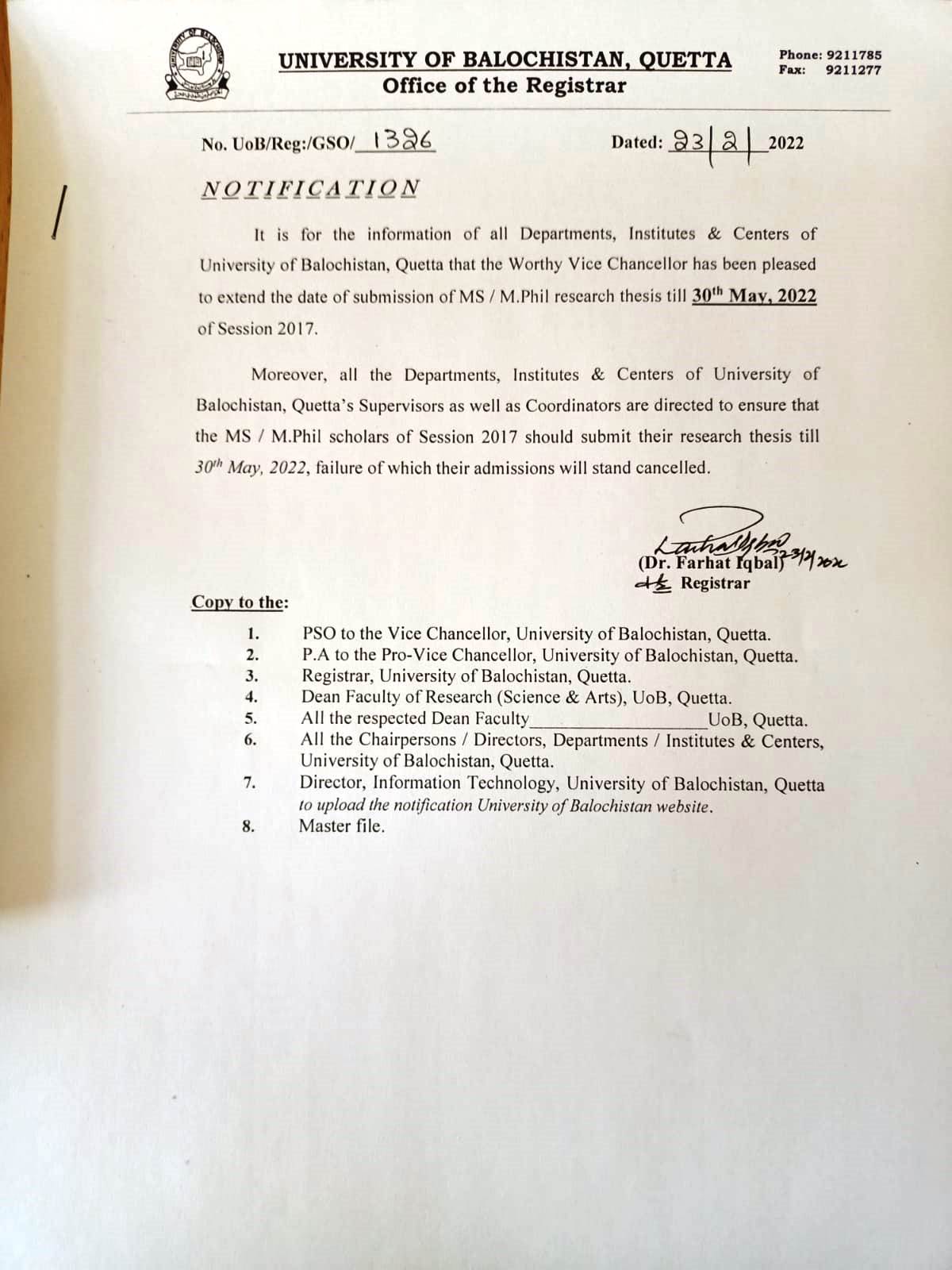 University of Balochistan Quetta & its Sub-Campuses will remain closed on account of