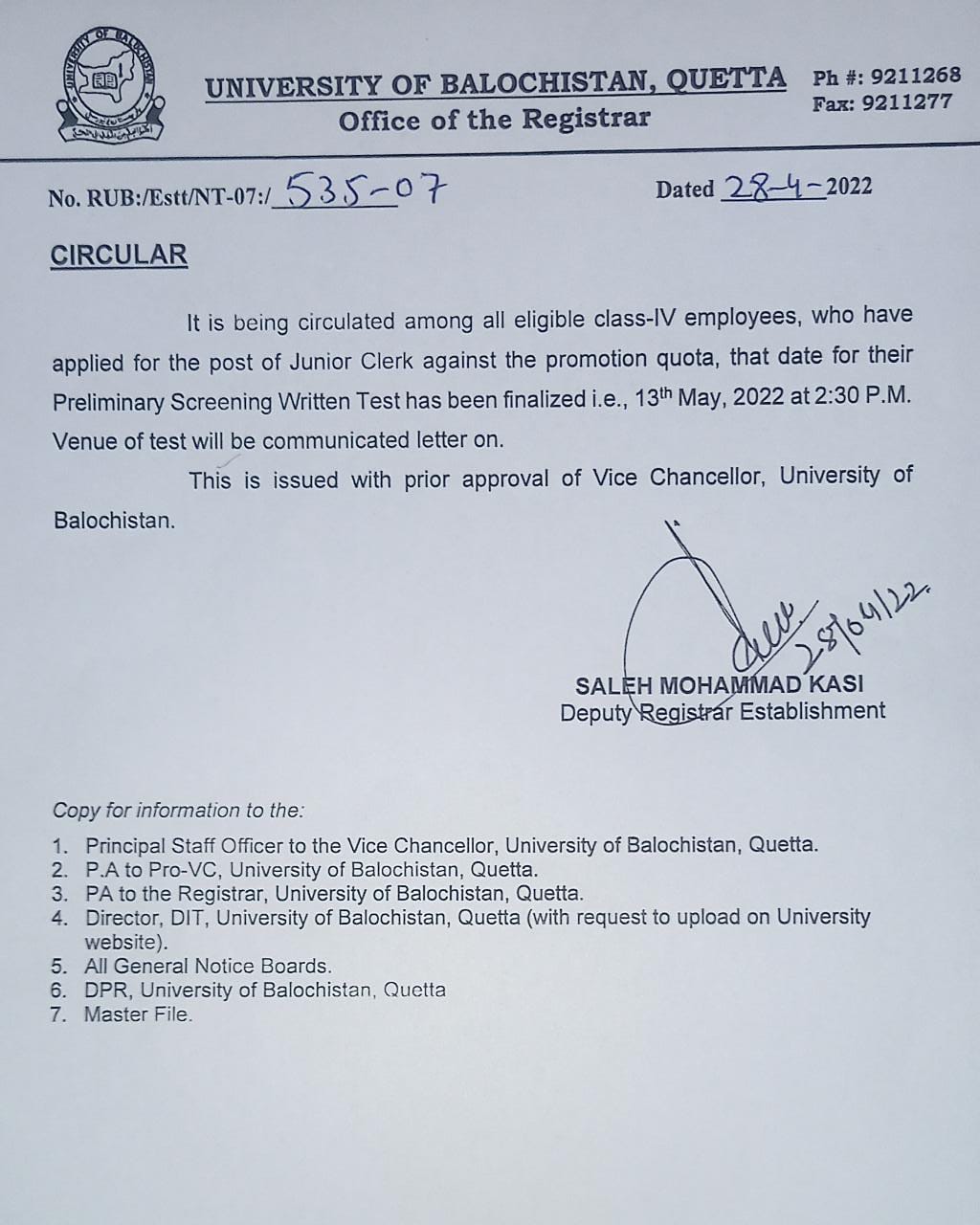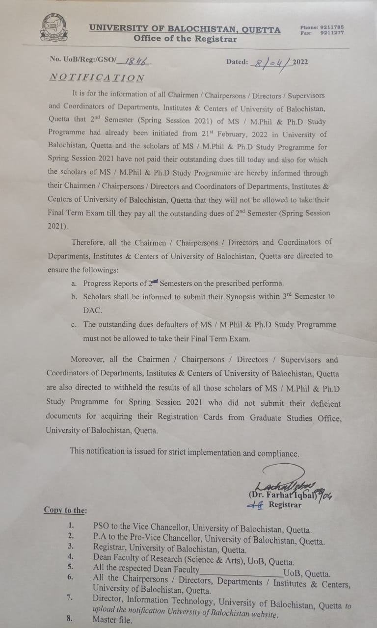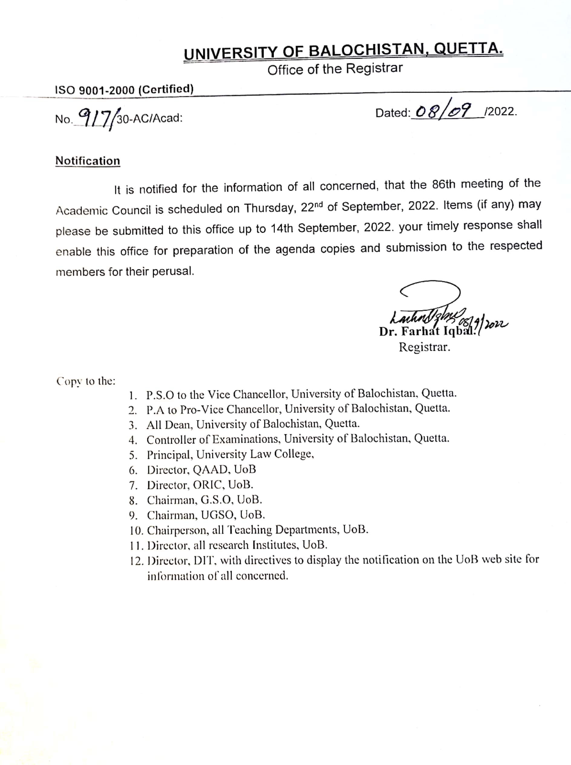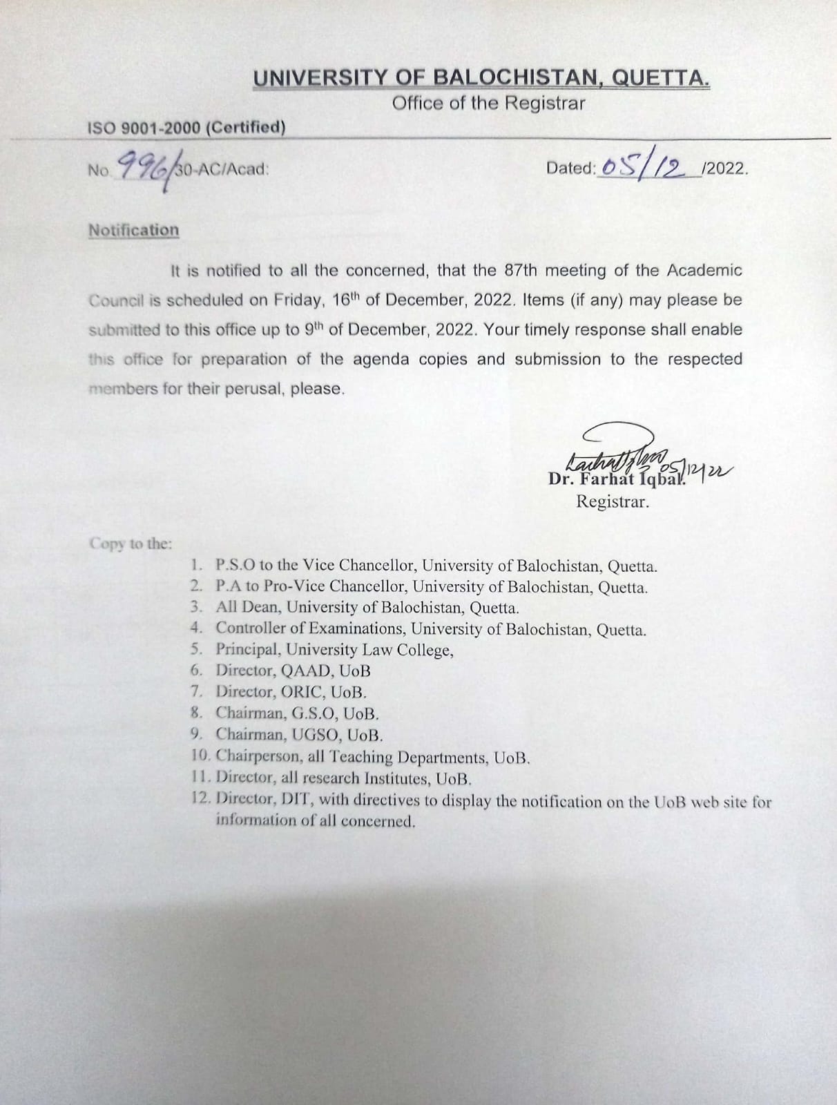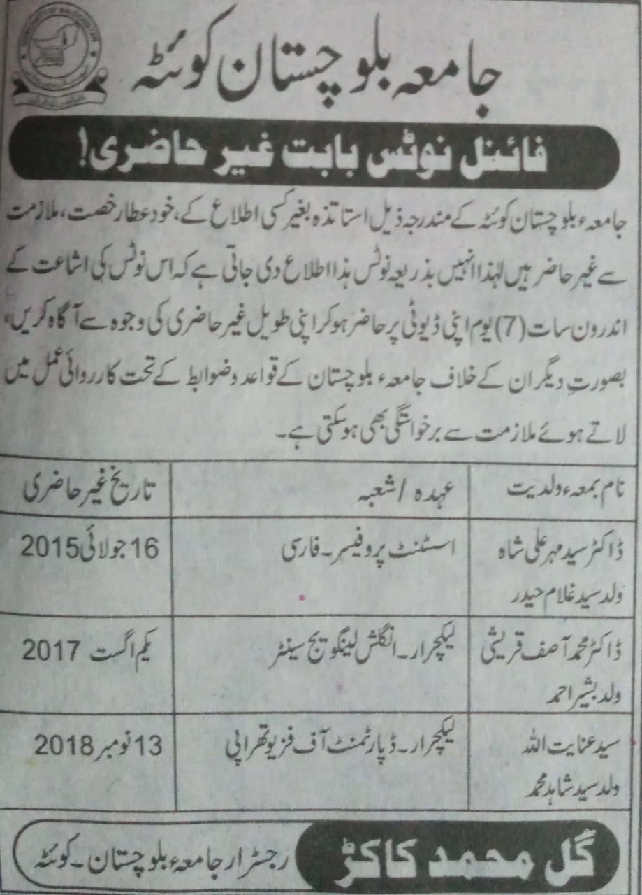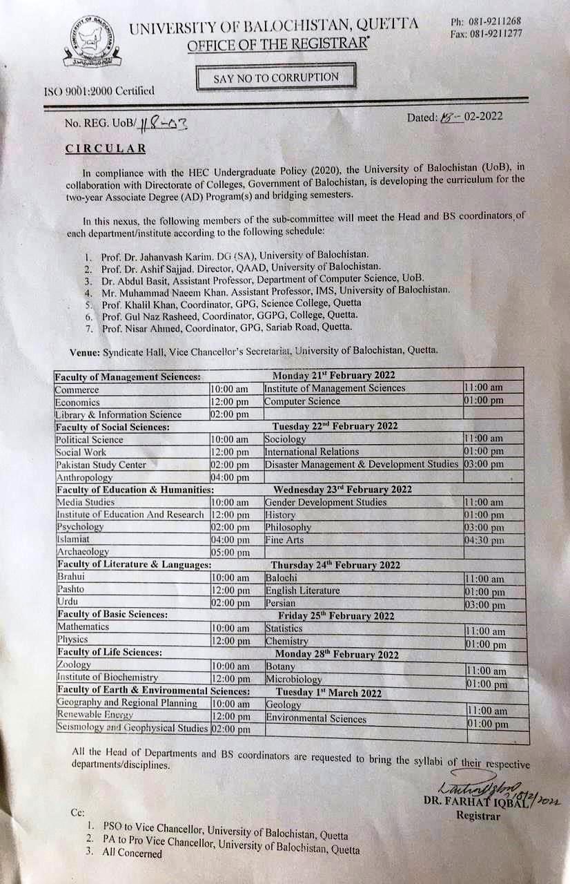 University of Balochistan Quetta & its Sub-Campuses will remain closed on account of