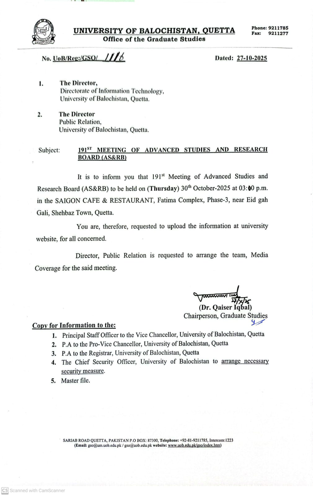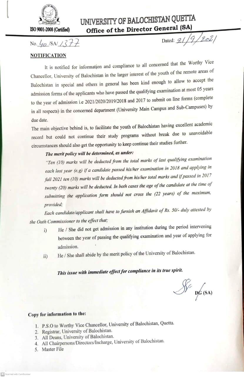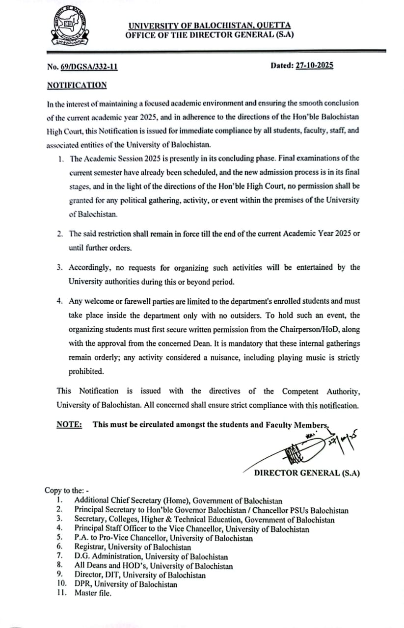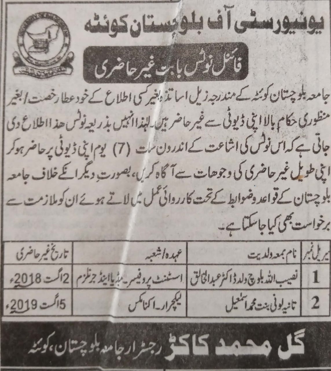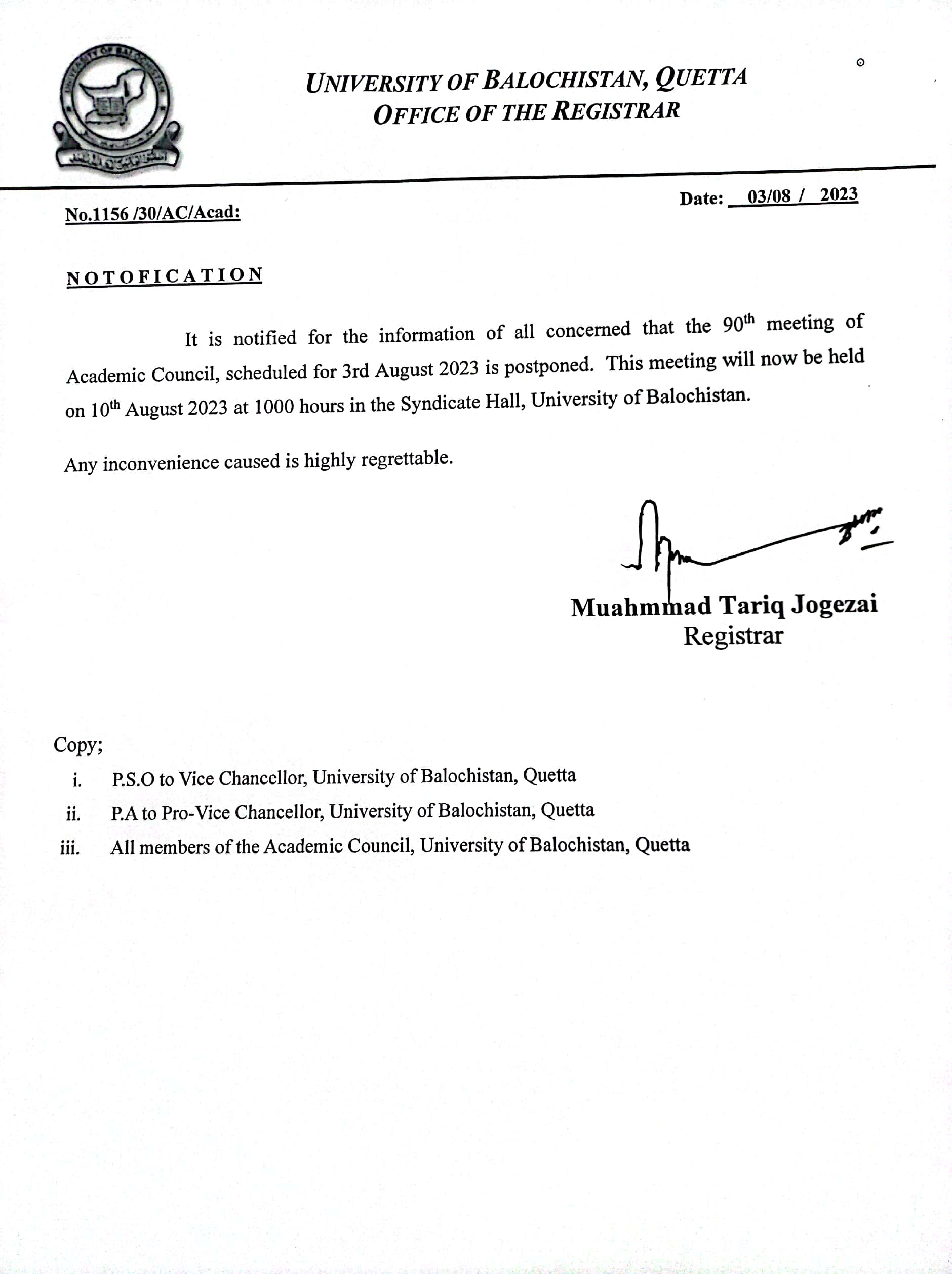 University of Balochistan Quetta & its Sub-Campuses will remain closed on account of