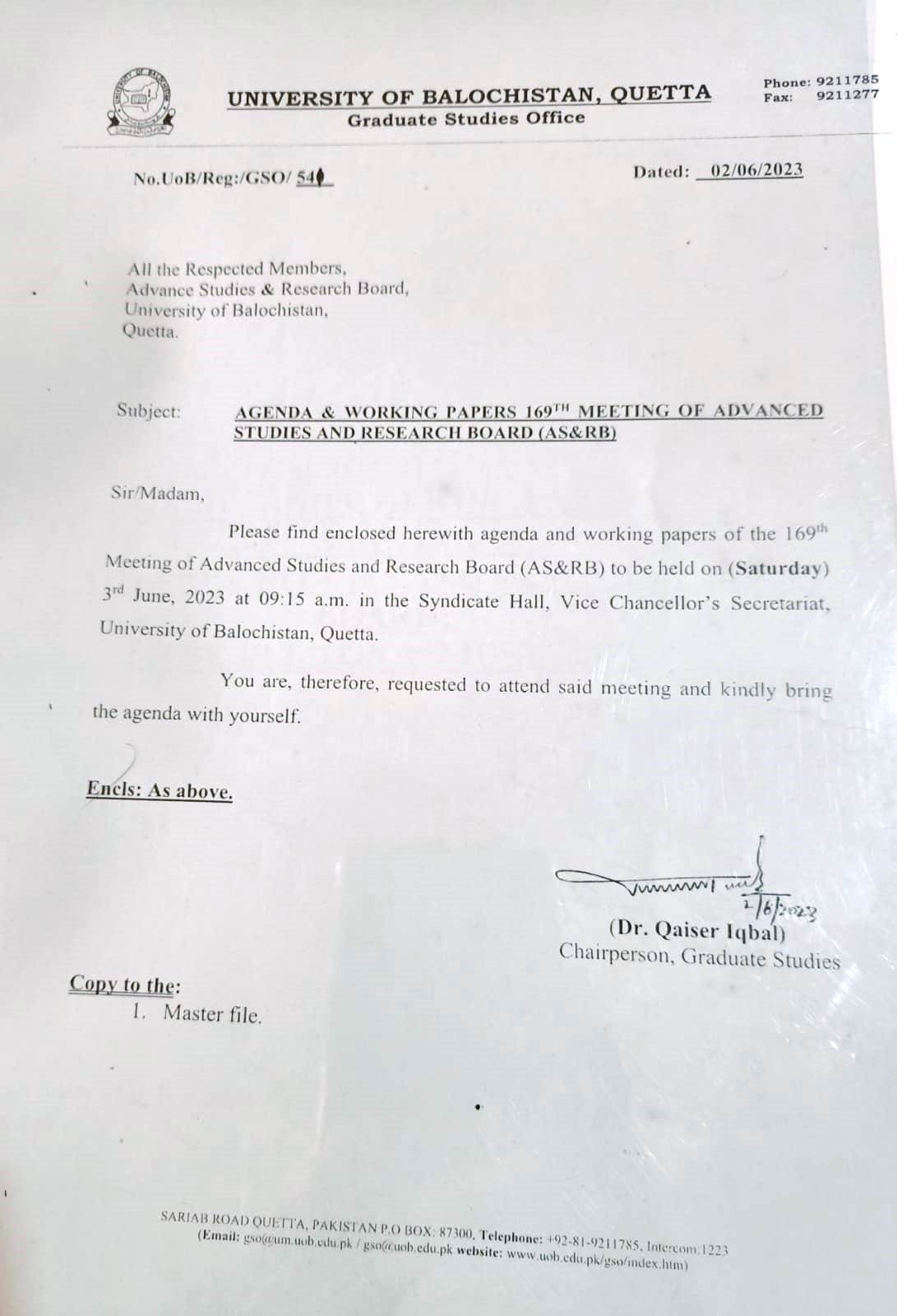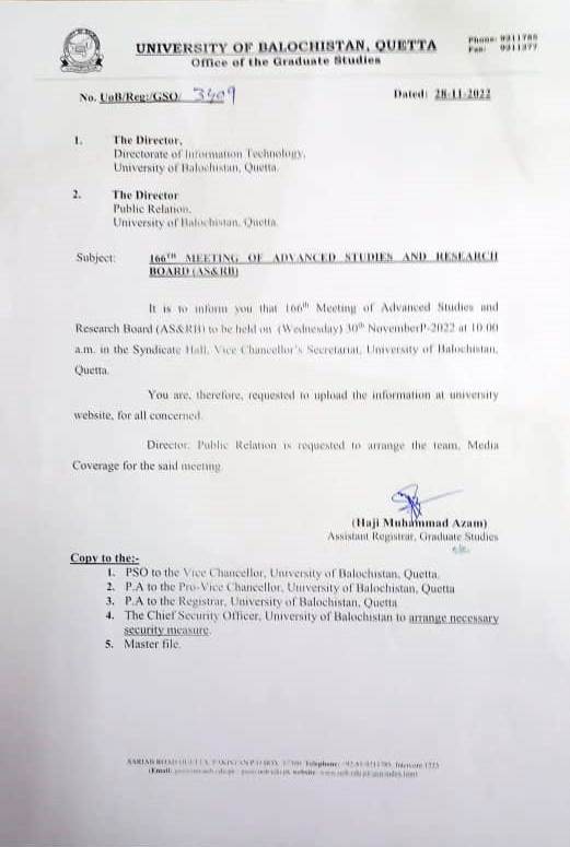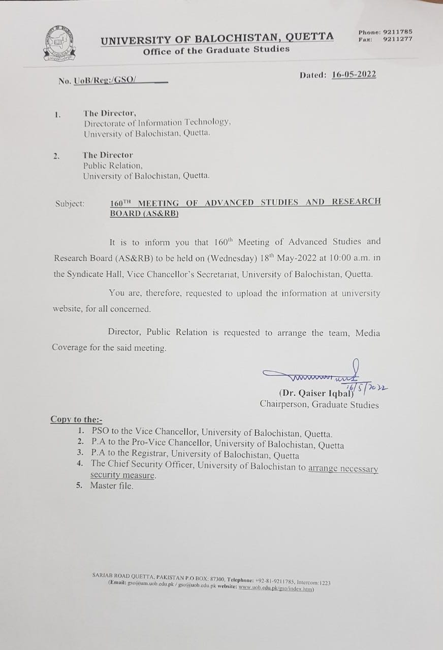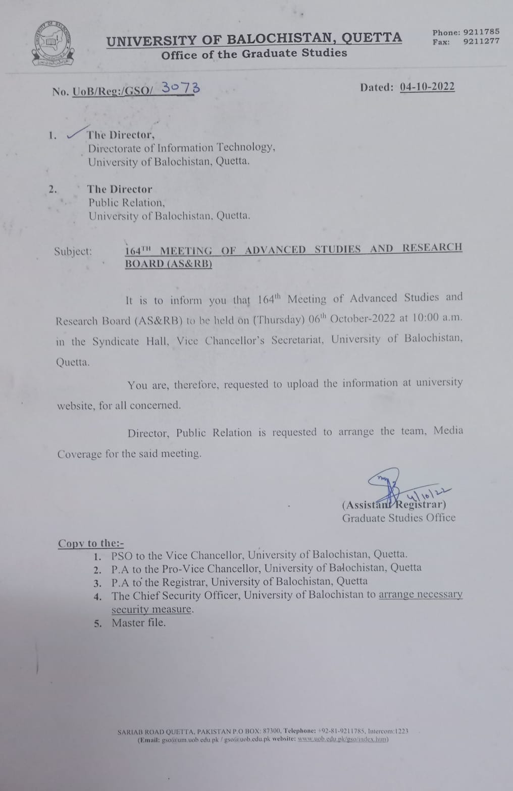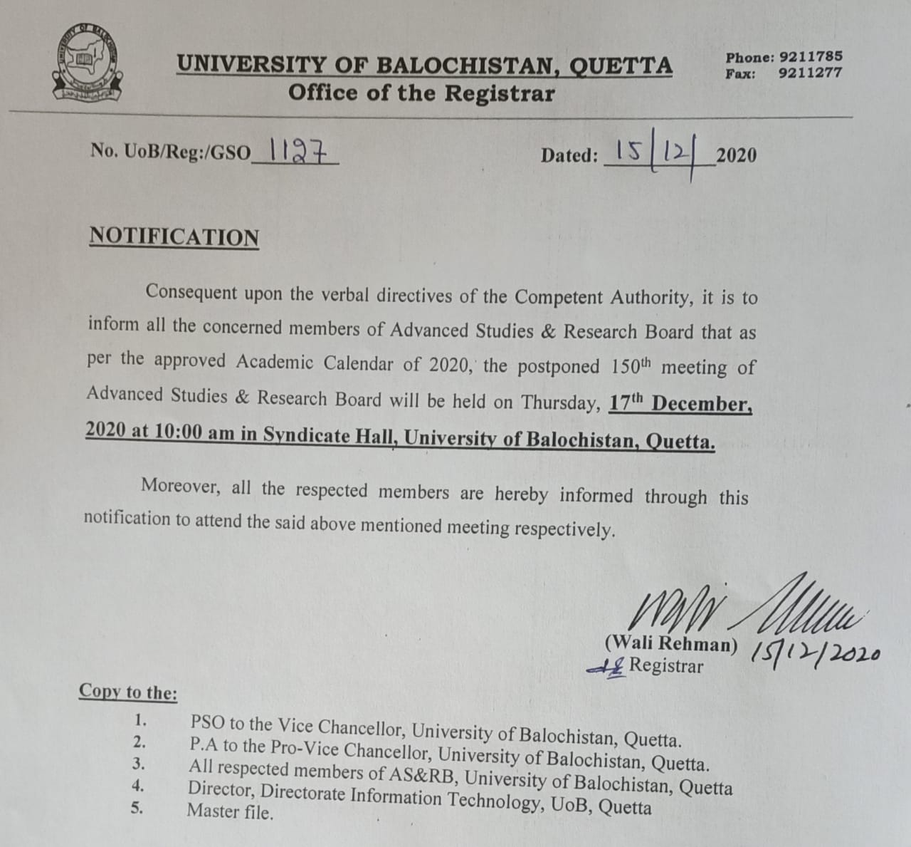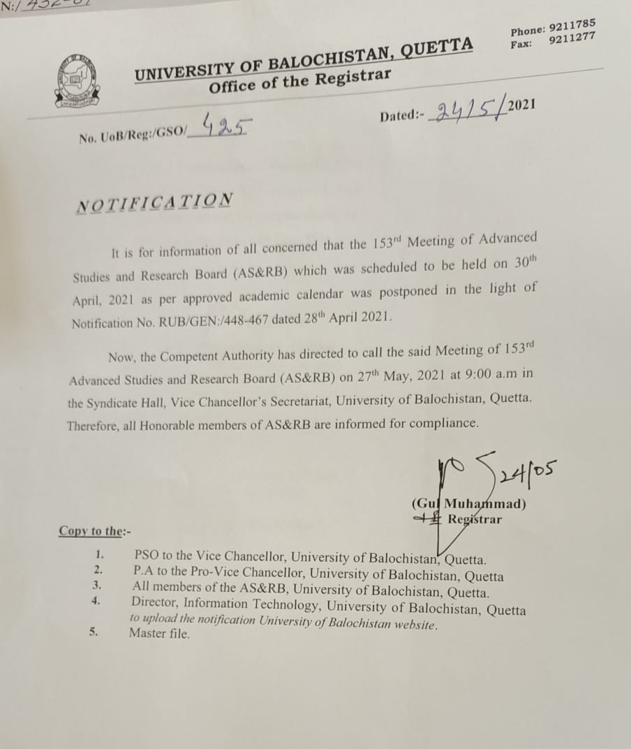 Notification: The 153 meeting of Advanced Studies & Research Board to be