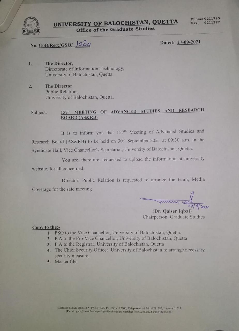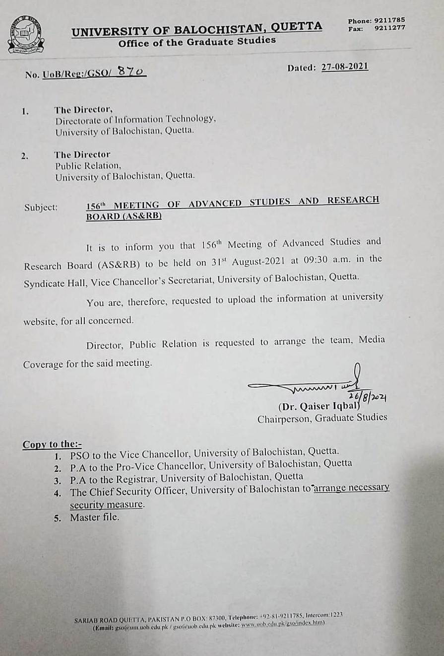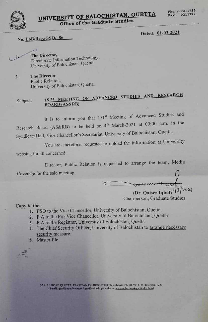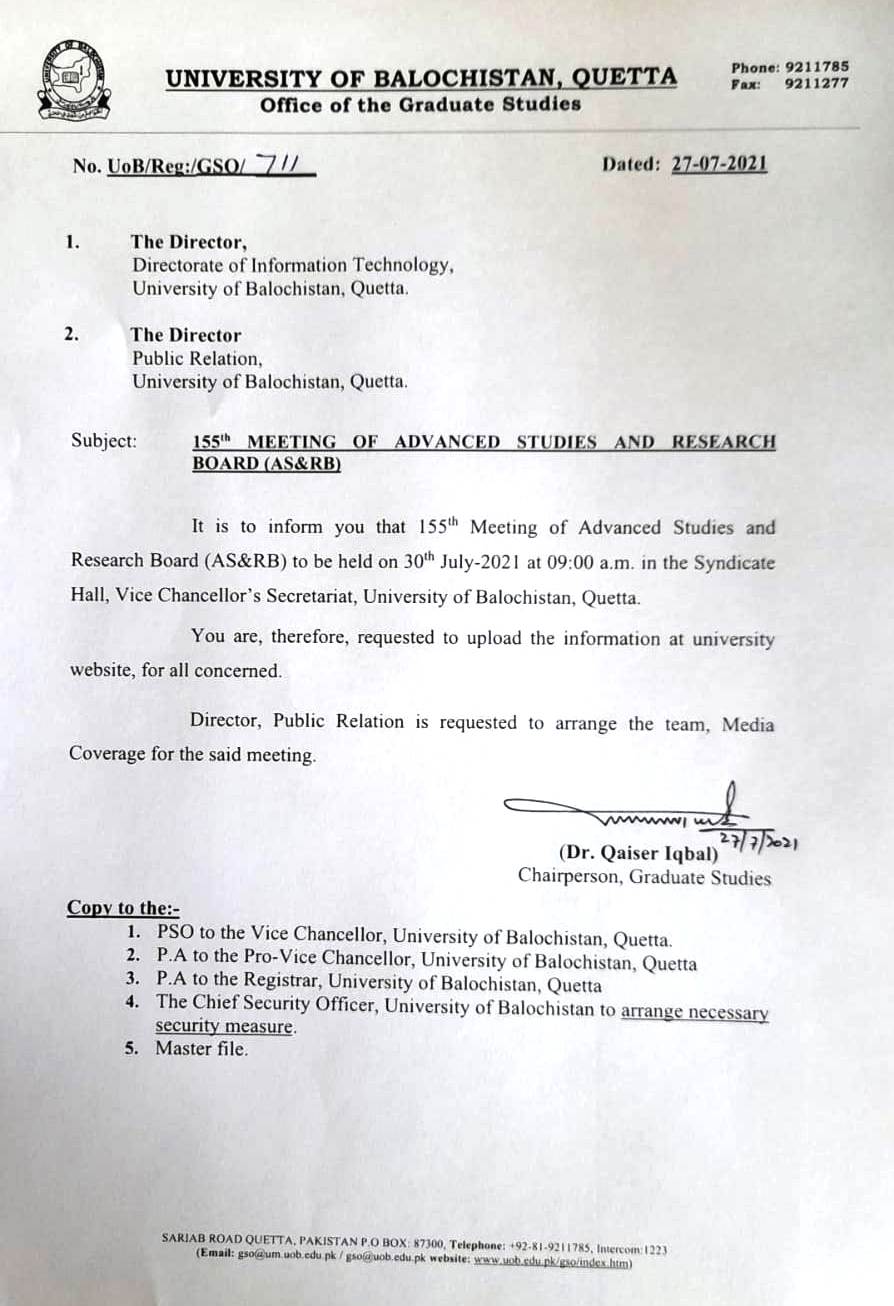 Studies and Research Board (AS&RB) is scheduled on 30th July 2021 at 9:00 a.m in