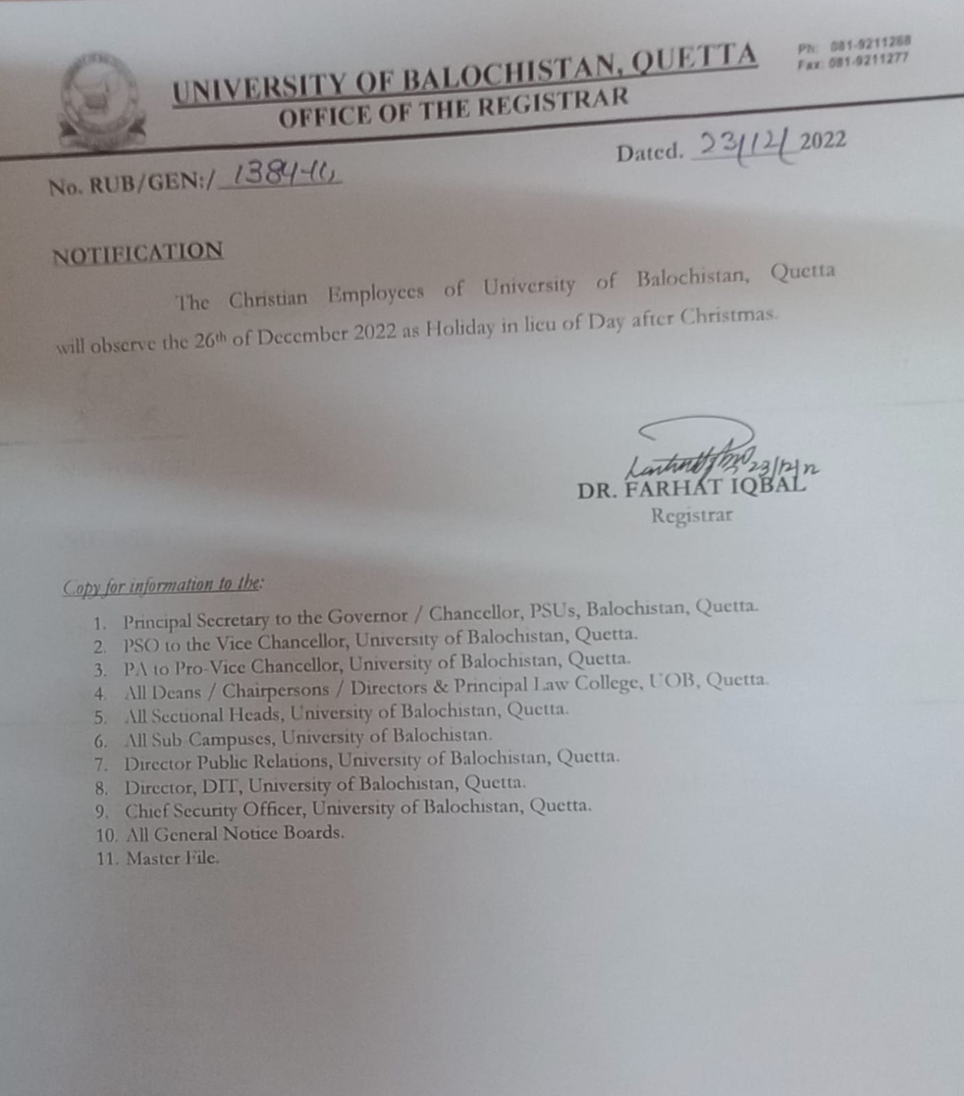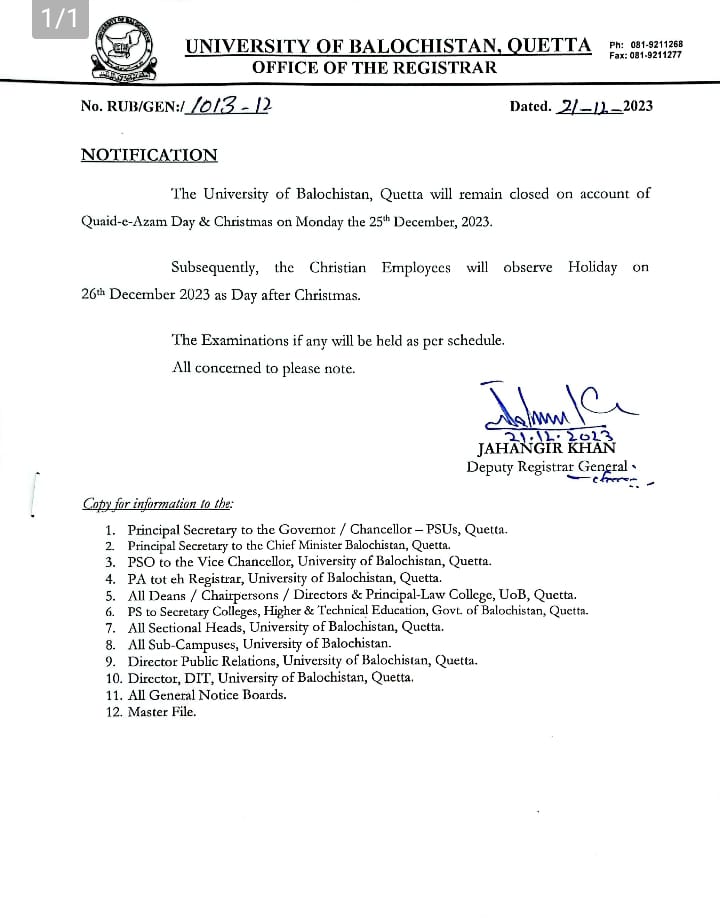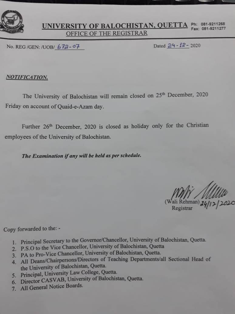 and 26th December 2020 is declared holiday only for the Christian employees of UoB Examinations if any will be held as per schedule. |