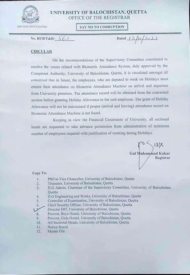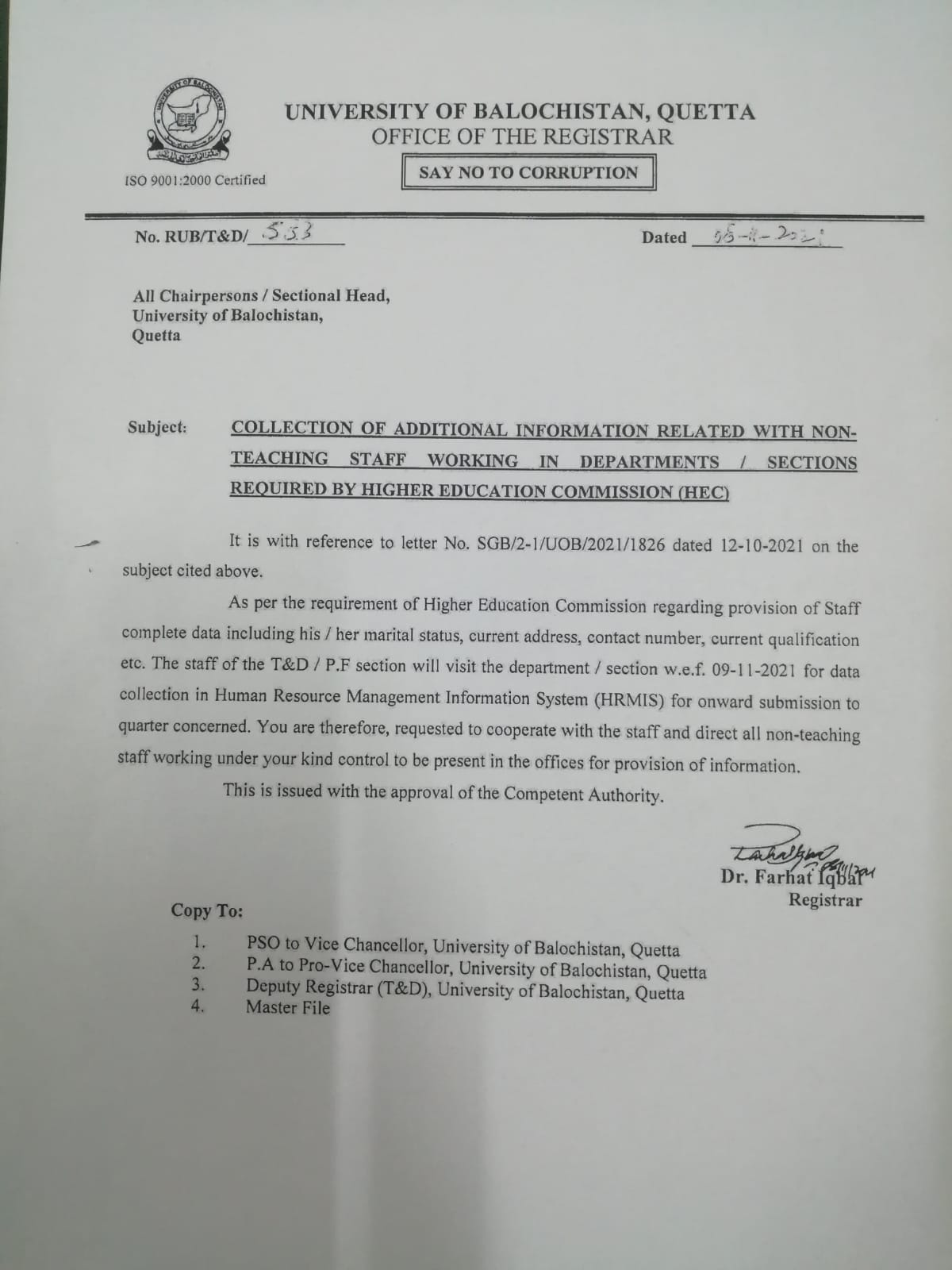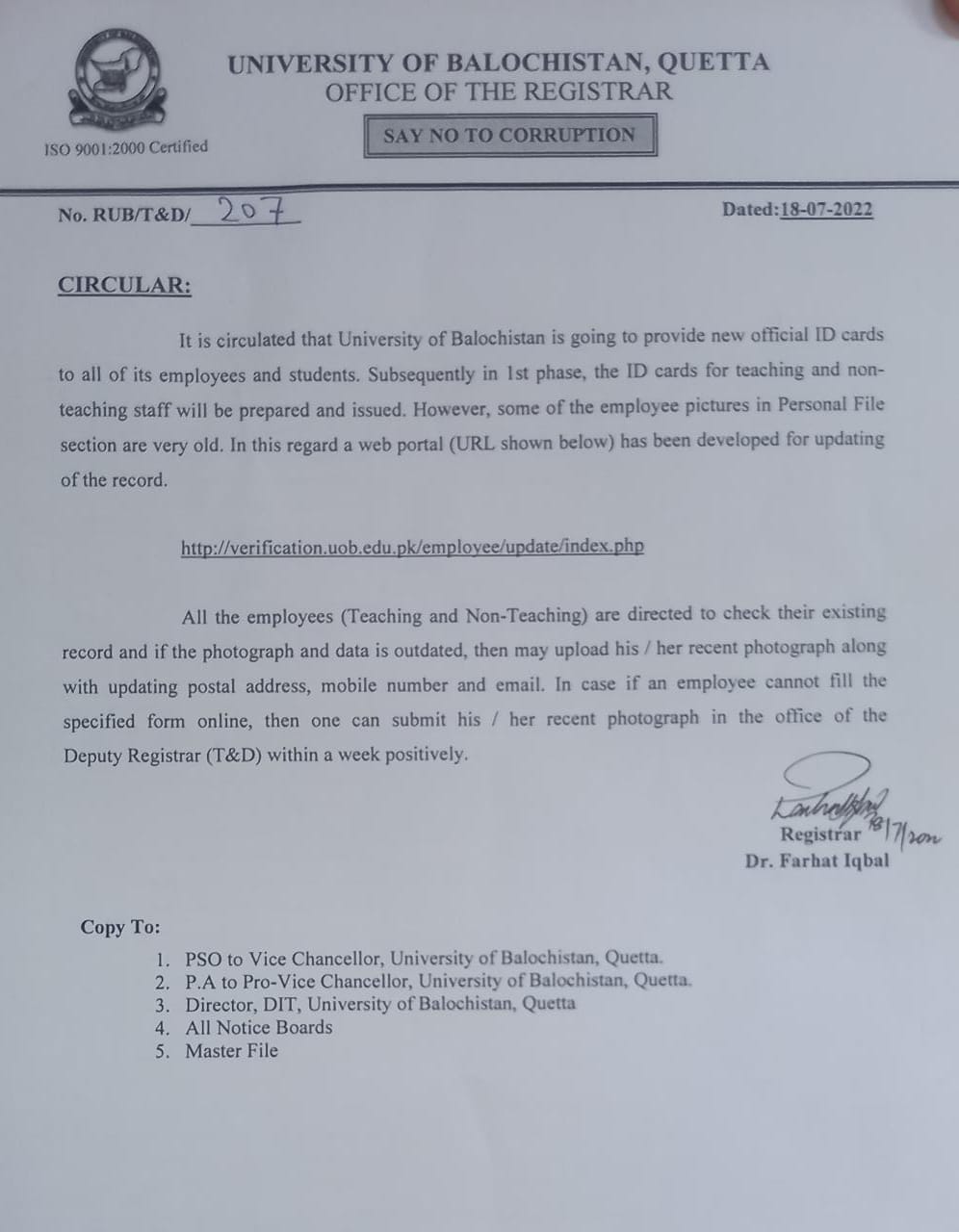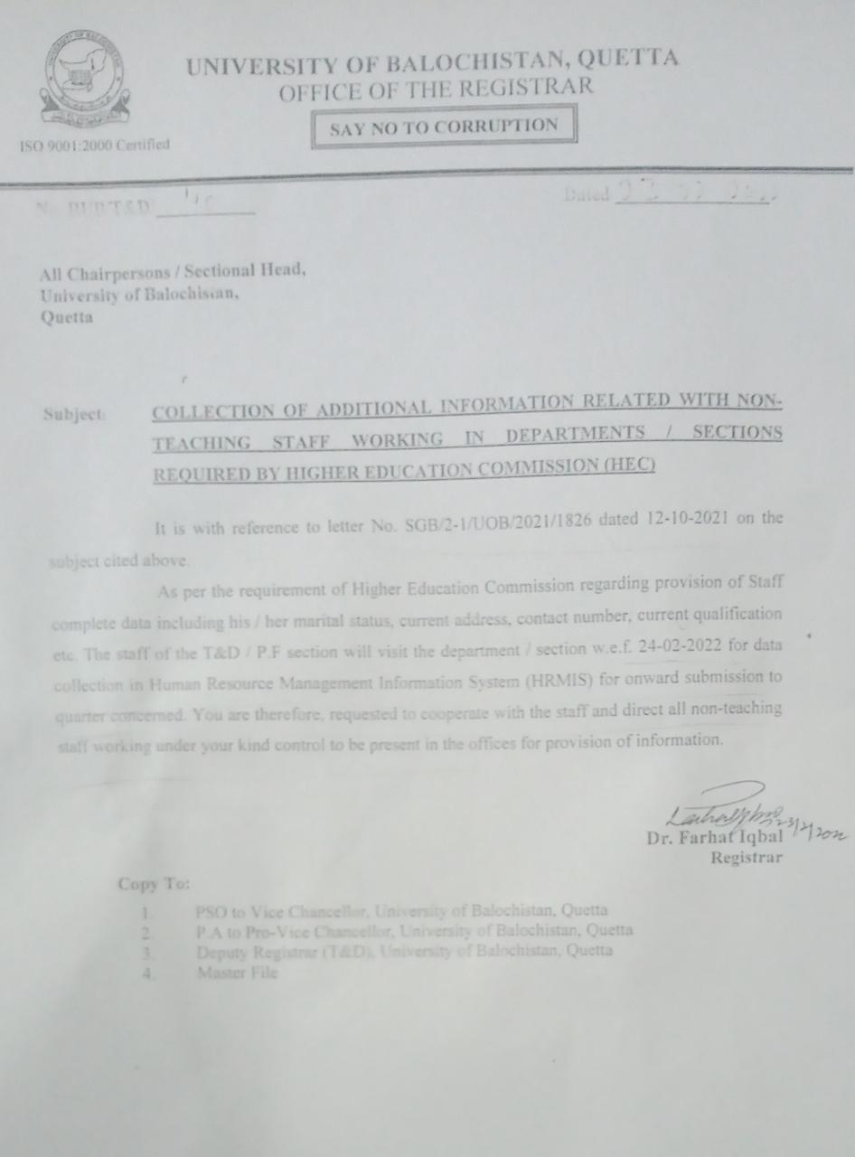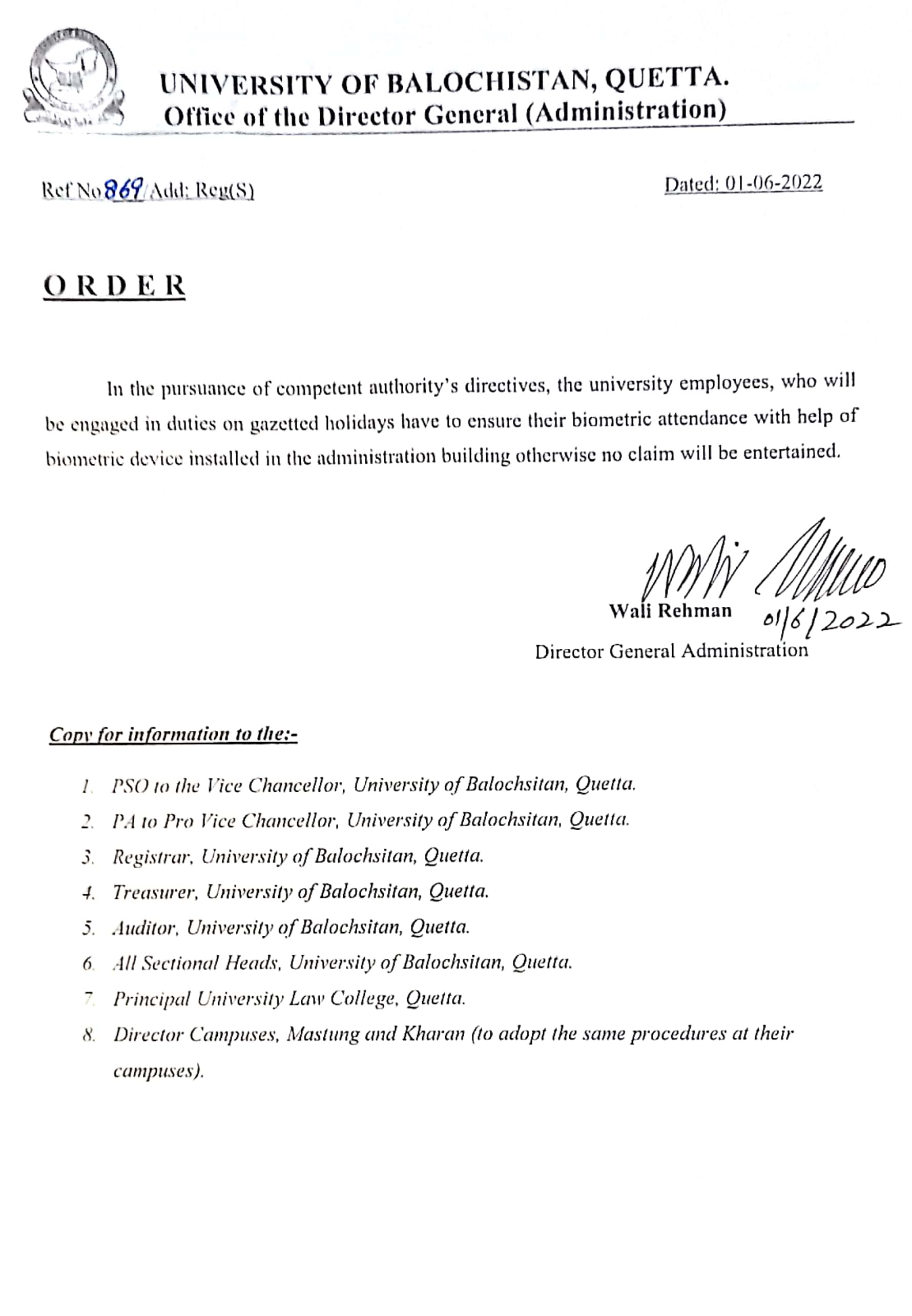 staff members (Teaching / Non Teaching) of UoB are directed to submit a copy of