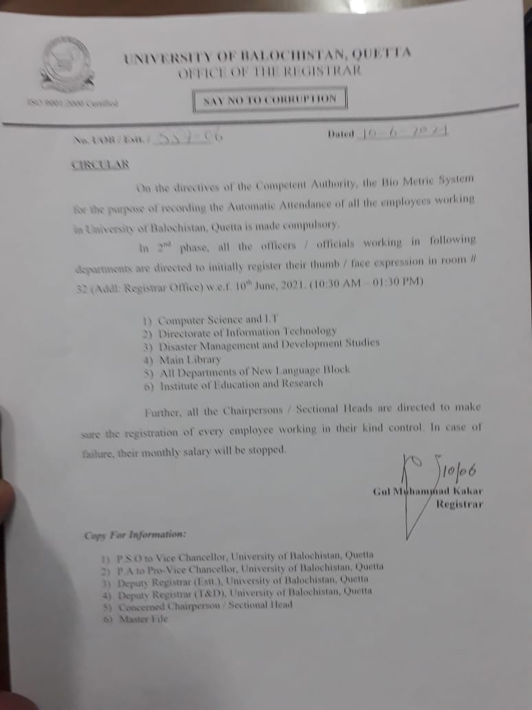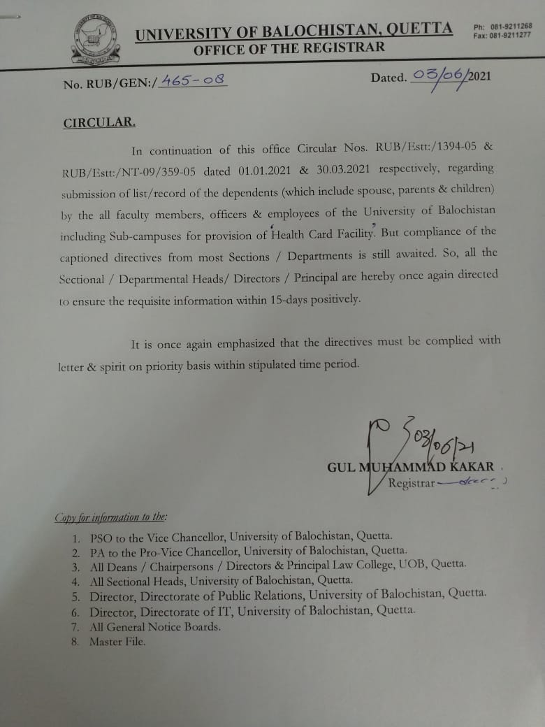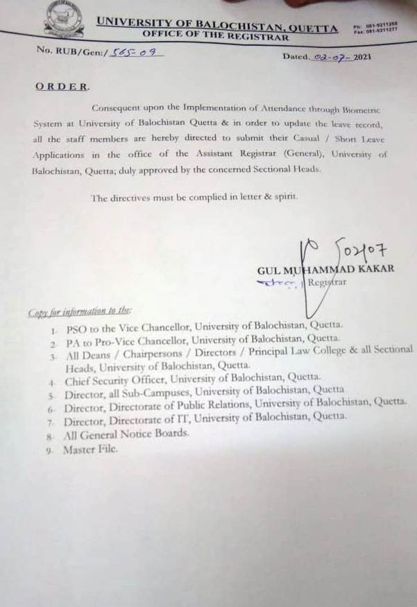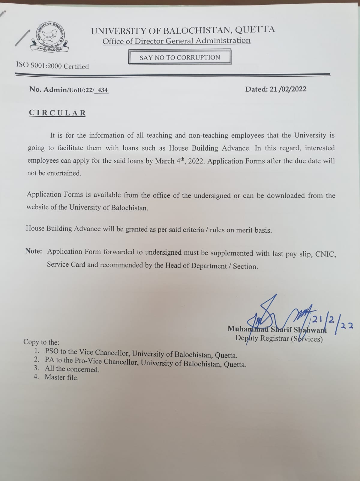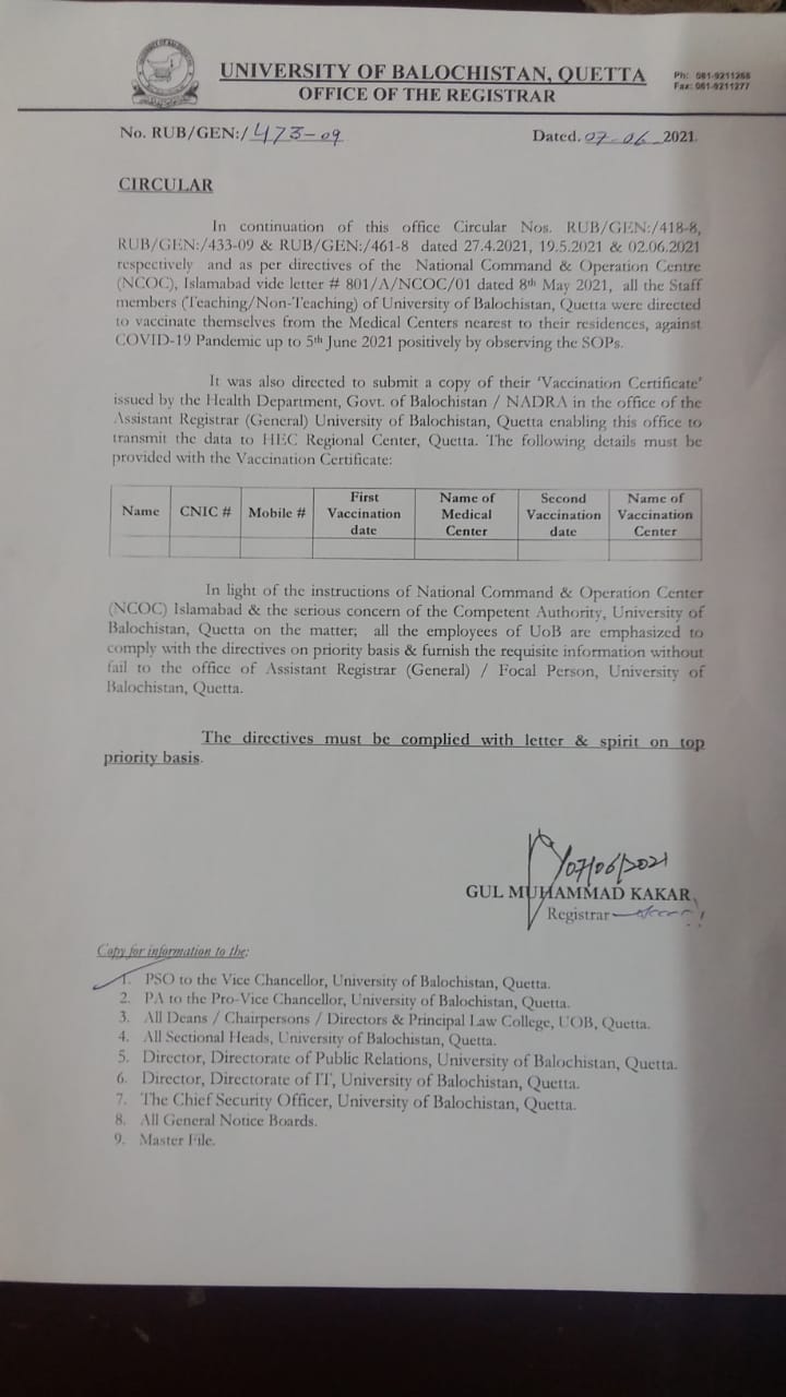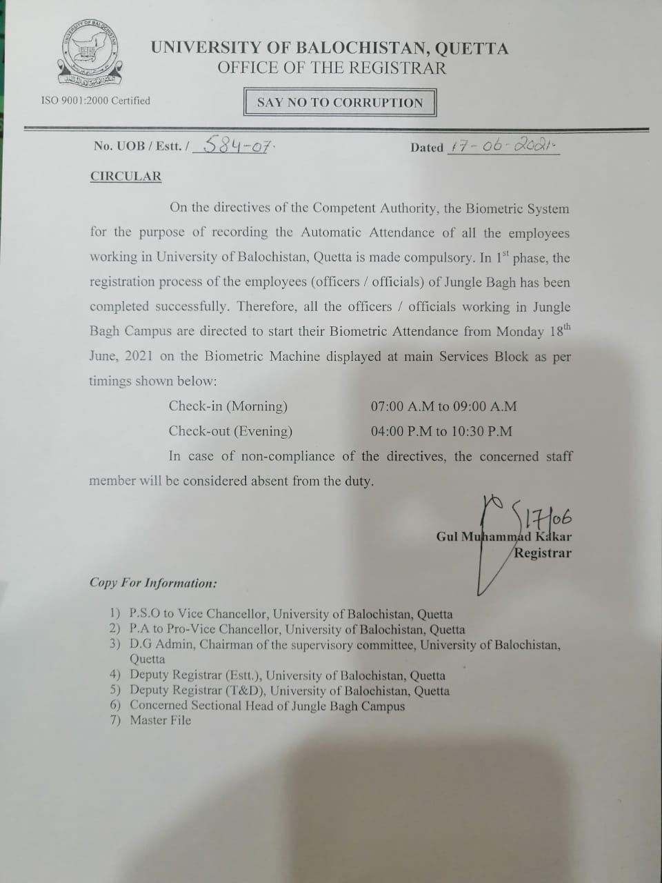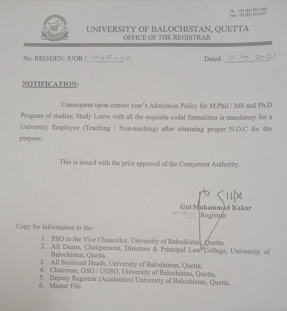 staff members (Teaching / Non Teaching) of UoB are directed to submit a copy of