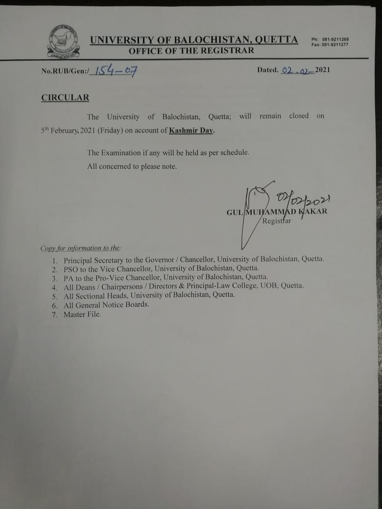 closed on Friday, 5th Feb 2021 on Account of Kashmir Day. Examination if any