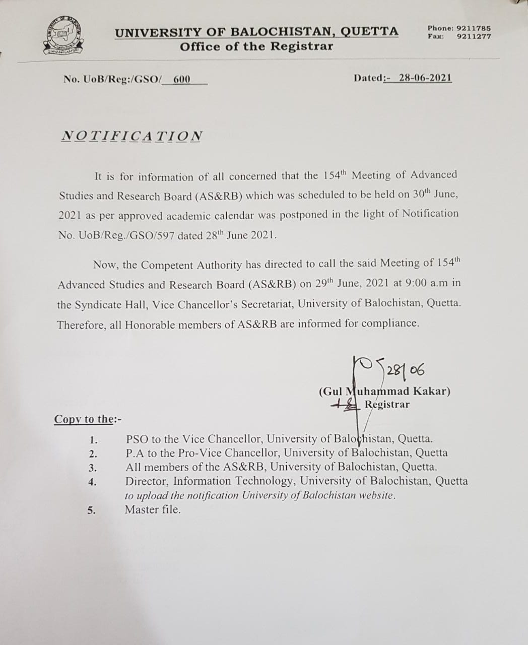 Studies and Research Board (AS&RB) is scheduled on 30th June 2021 at 9:00 a.m in