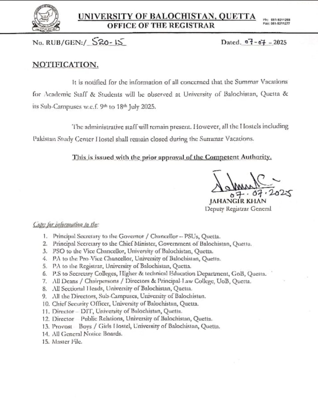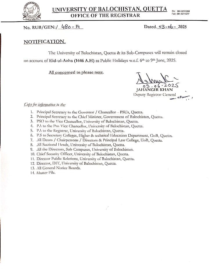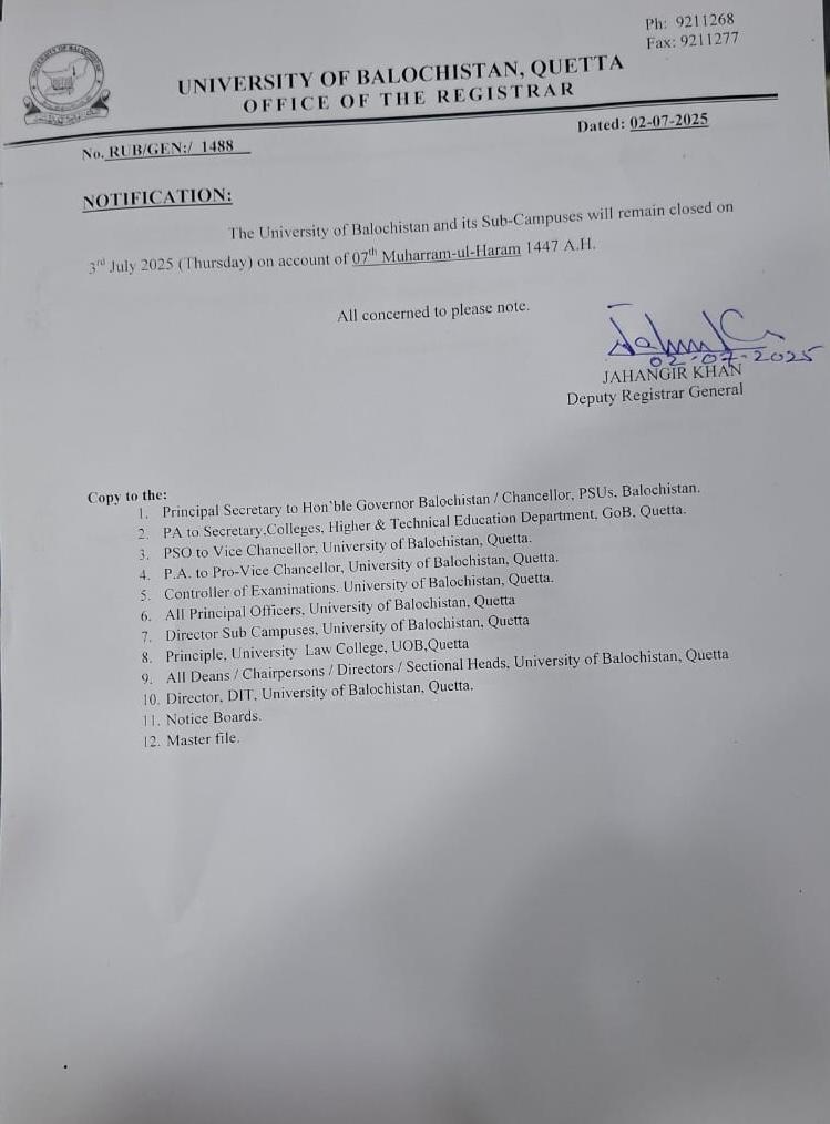 UoB will remain closed on 3rd July 2025 on account of 7th Moharrum-ul-Haram. |
