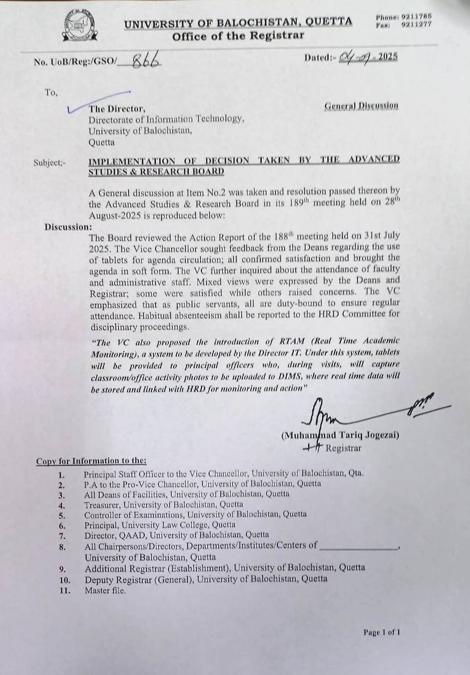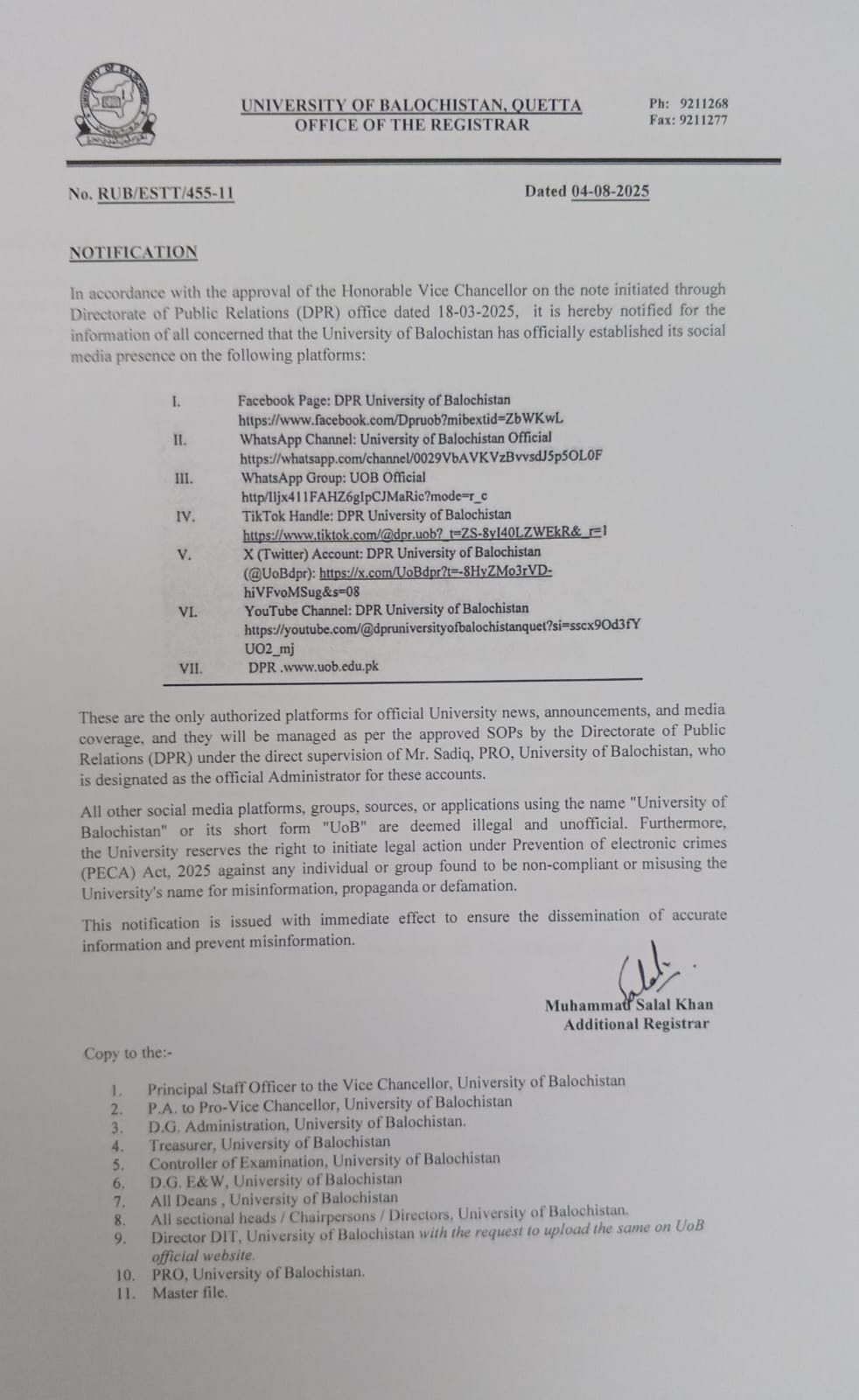 Establishment of University of Balochistan's Authorized Social Media Platforms