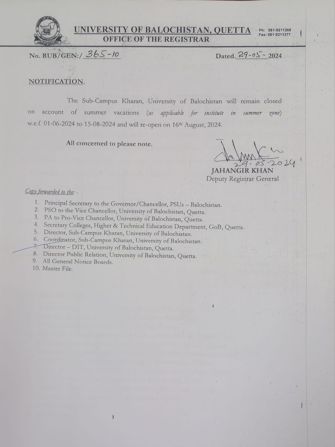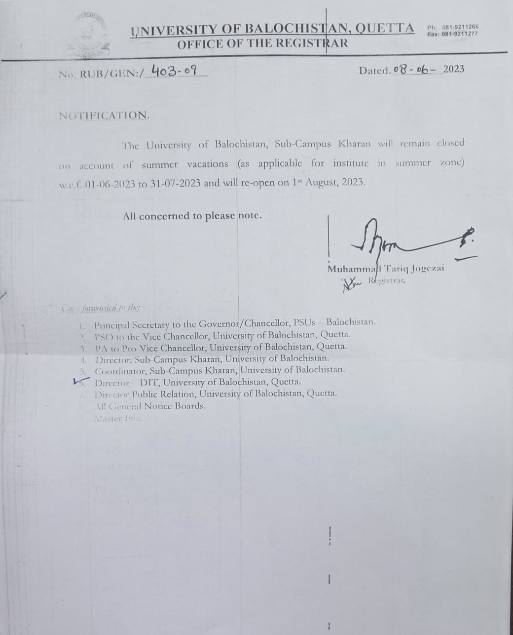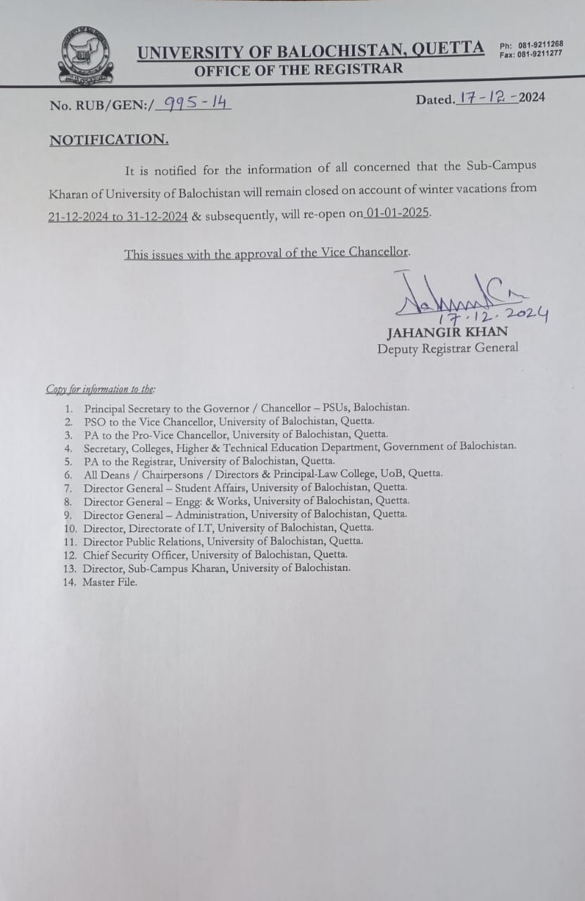 University of Balochistan Sub-Campus Kharan will remain closed on account of