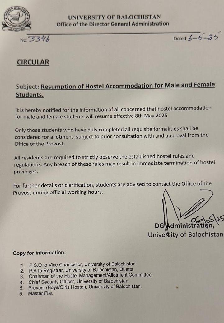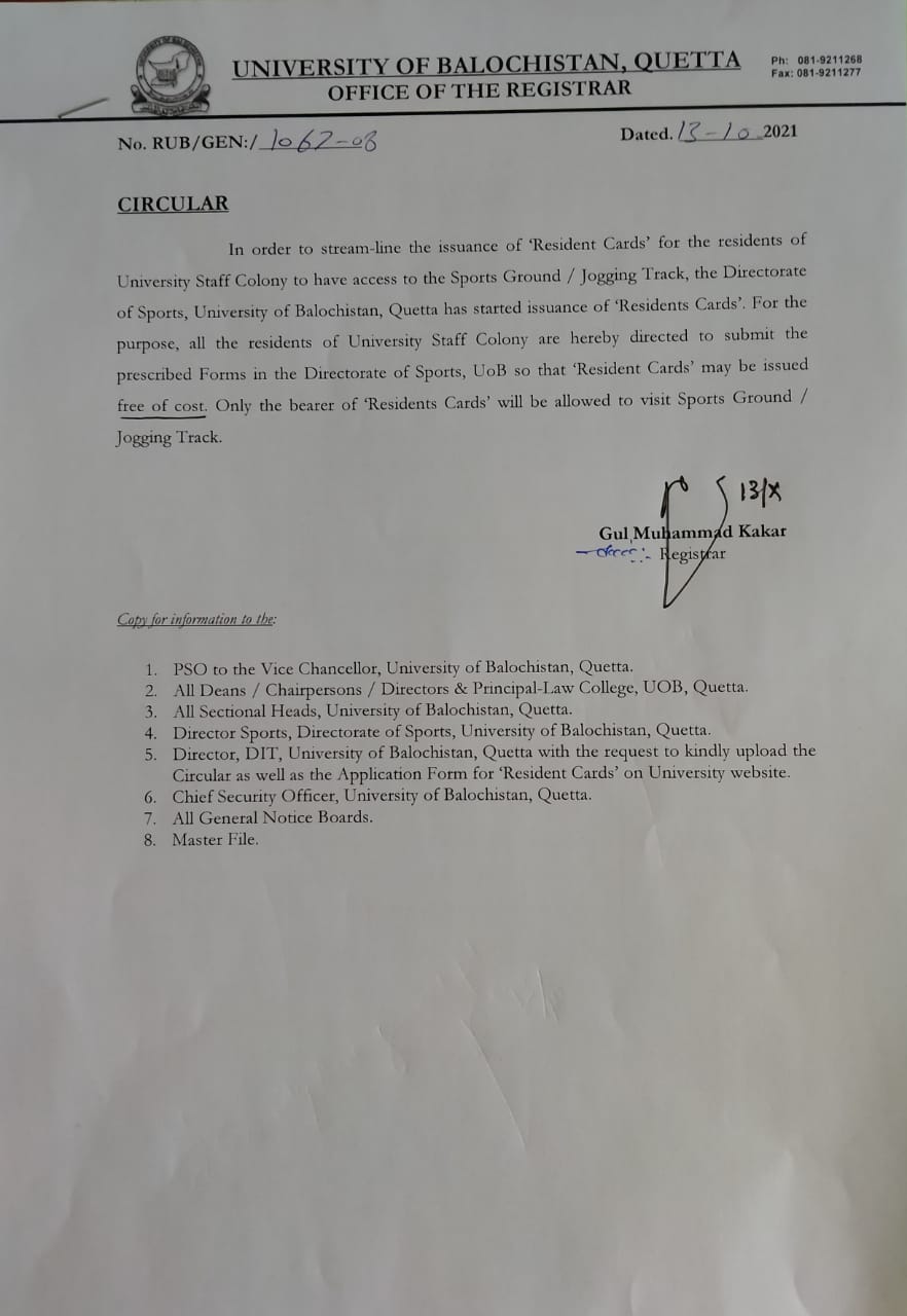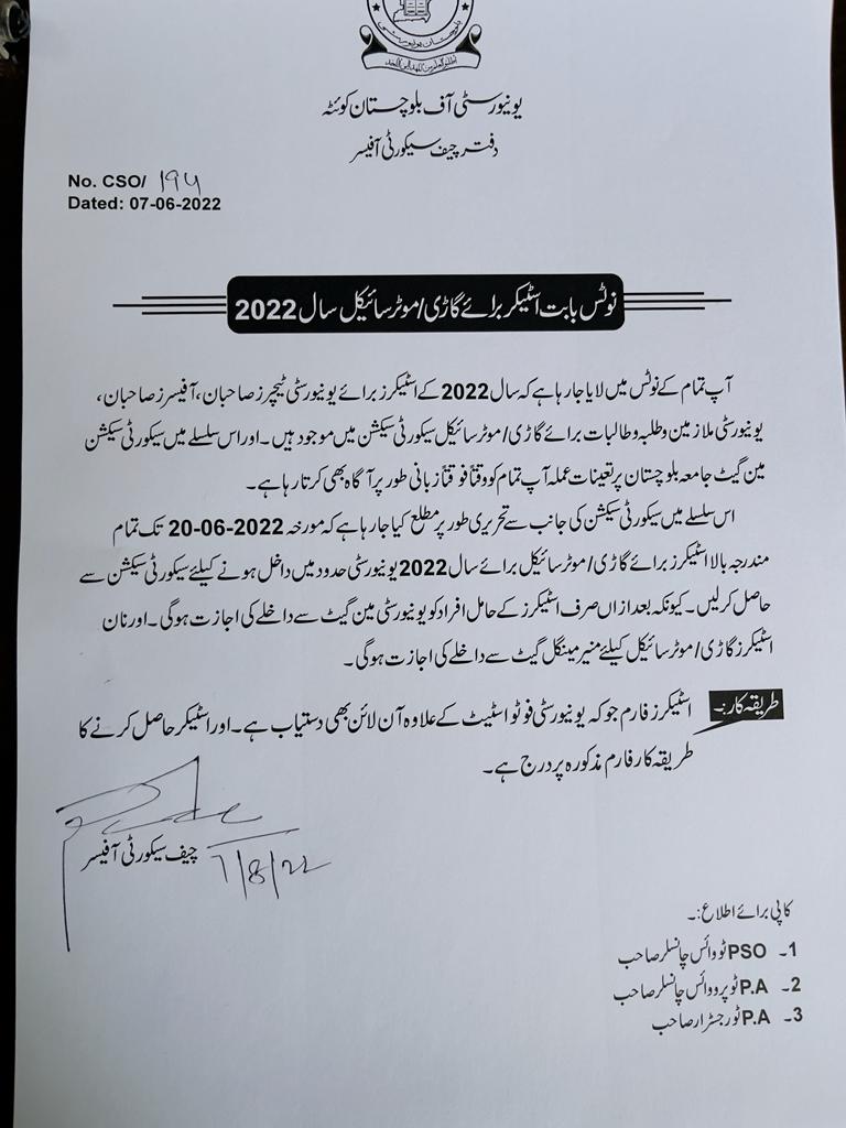 Entry Policy and Sticker Issuance for University Colony Residents at Makran Gate |