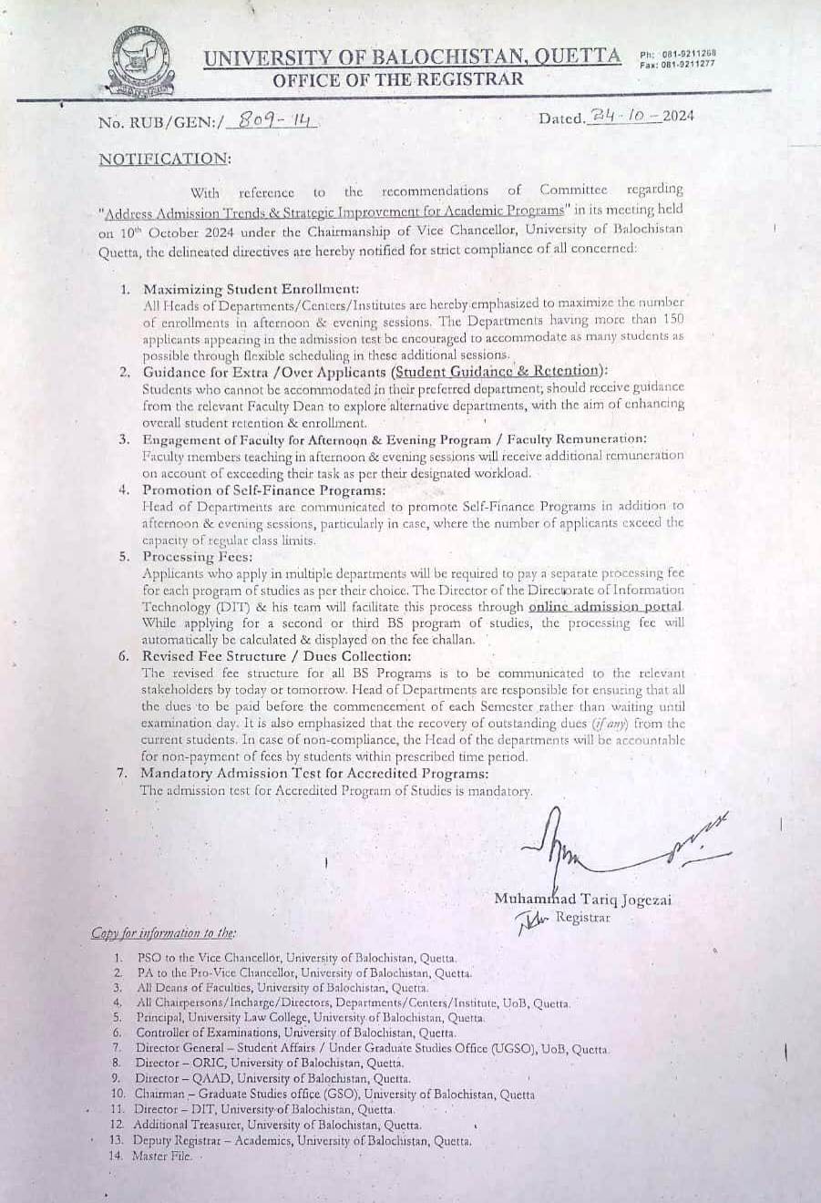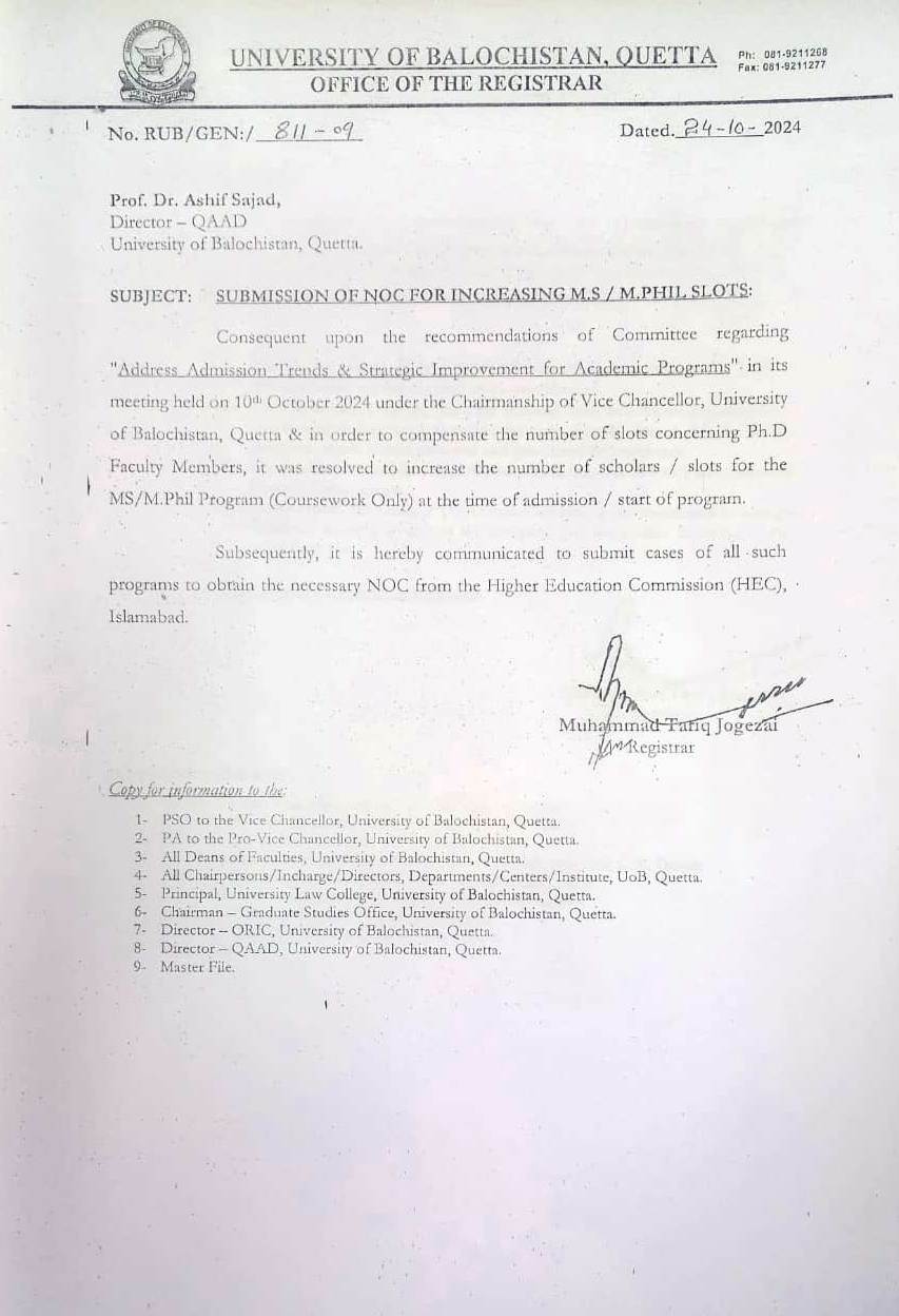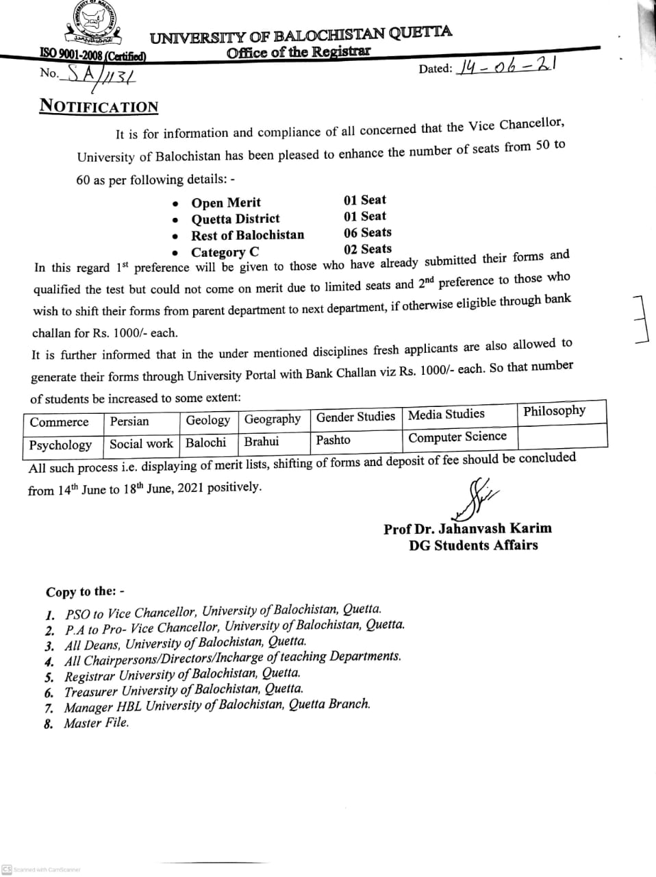 Vice Chancellor UoB has been pleased to enhance the number of seats from 50 to