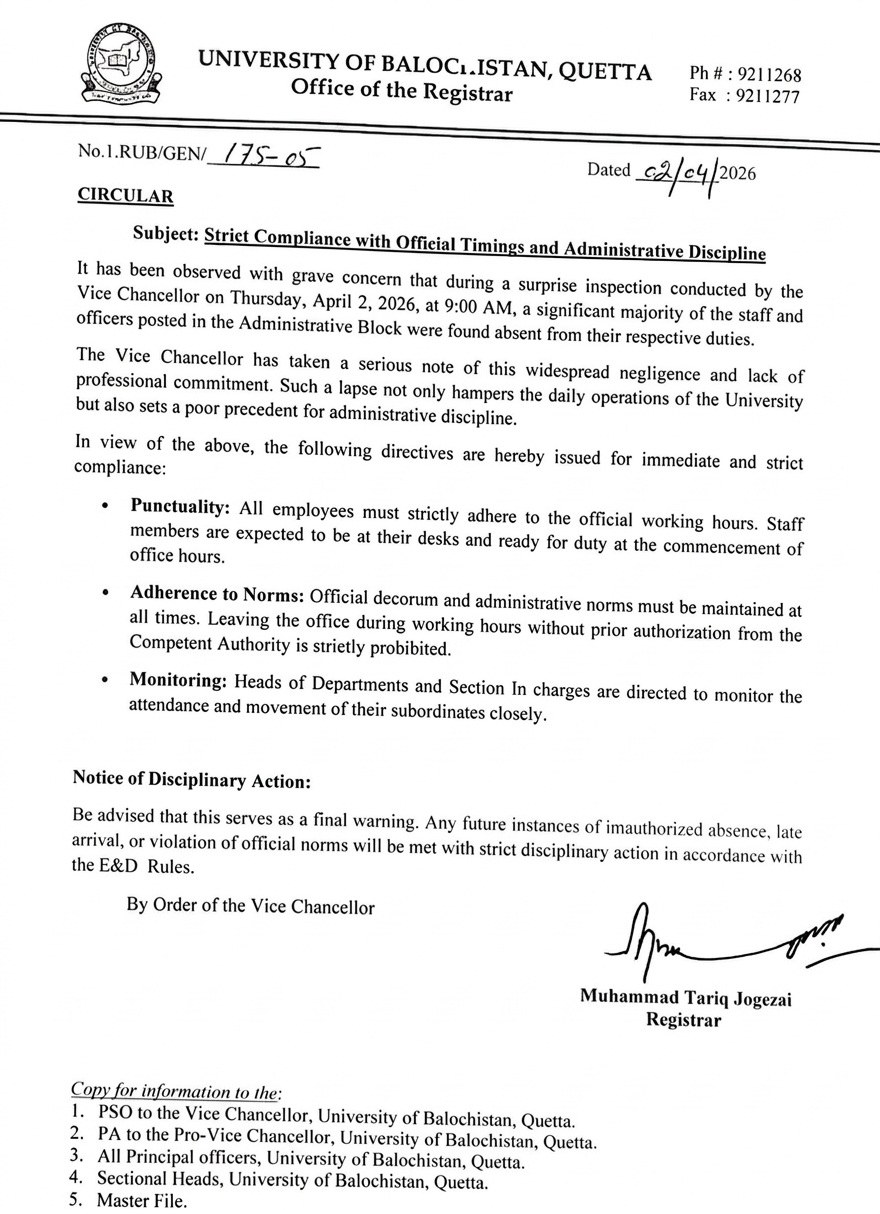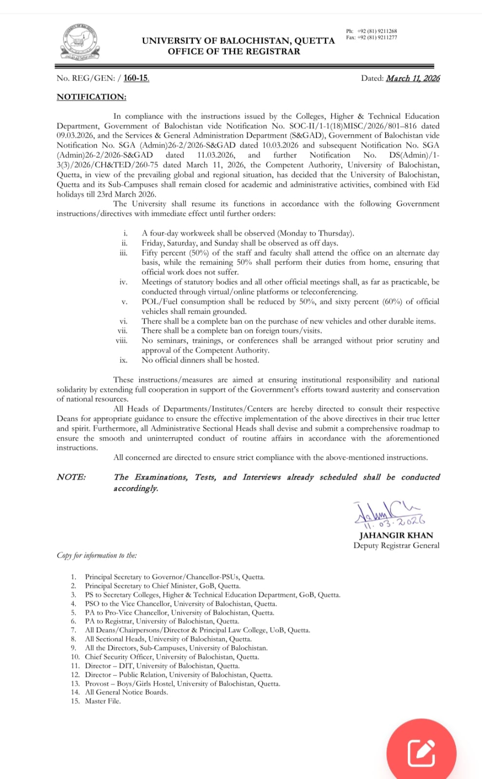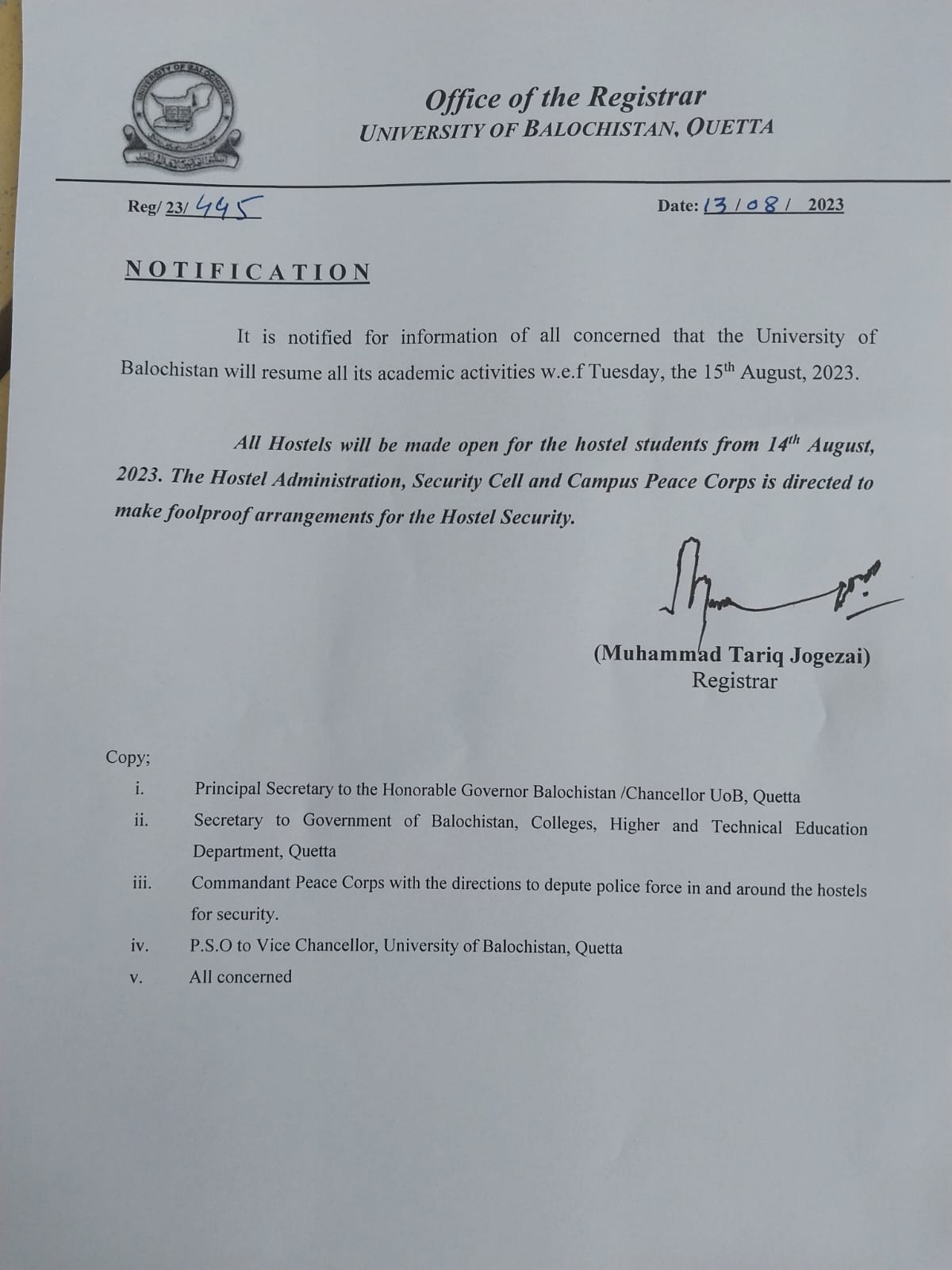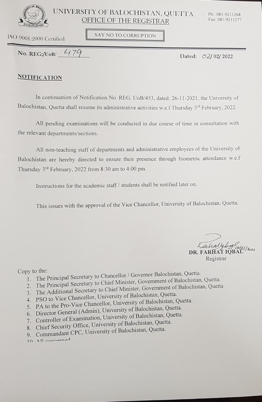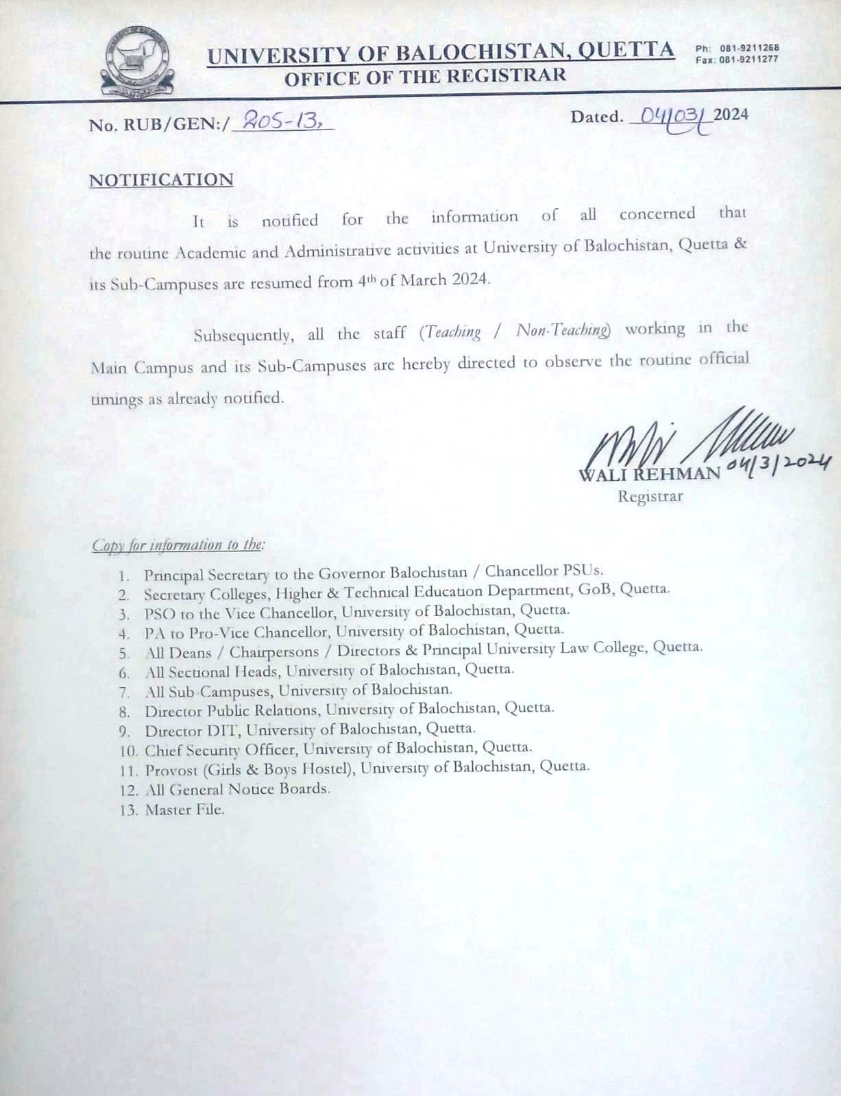 Balochistan along with all the campuses to ensure the resumption of duties from