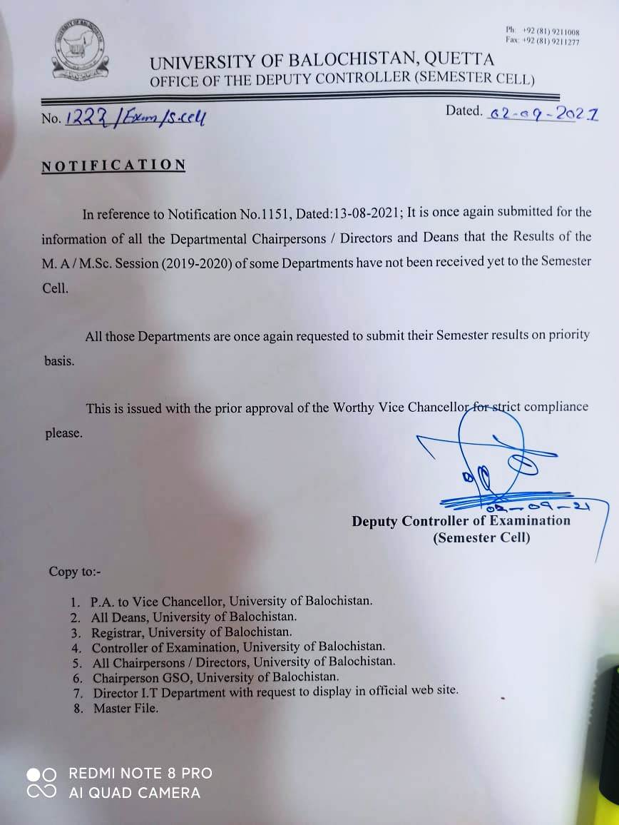 In supersession of Notification No: UoB(PTA)/2020(56)/457, Dated August 18 2020,