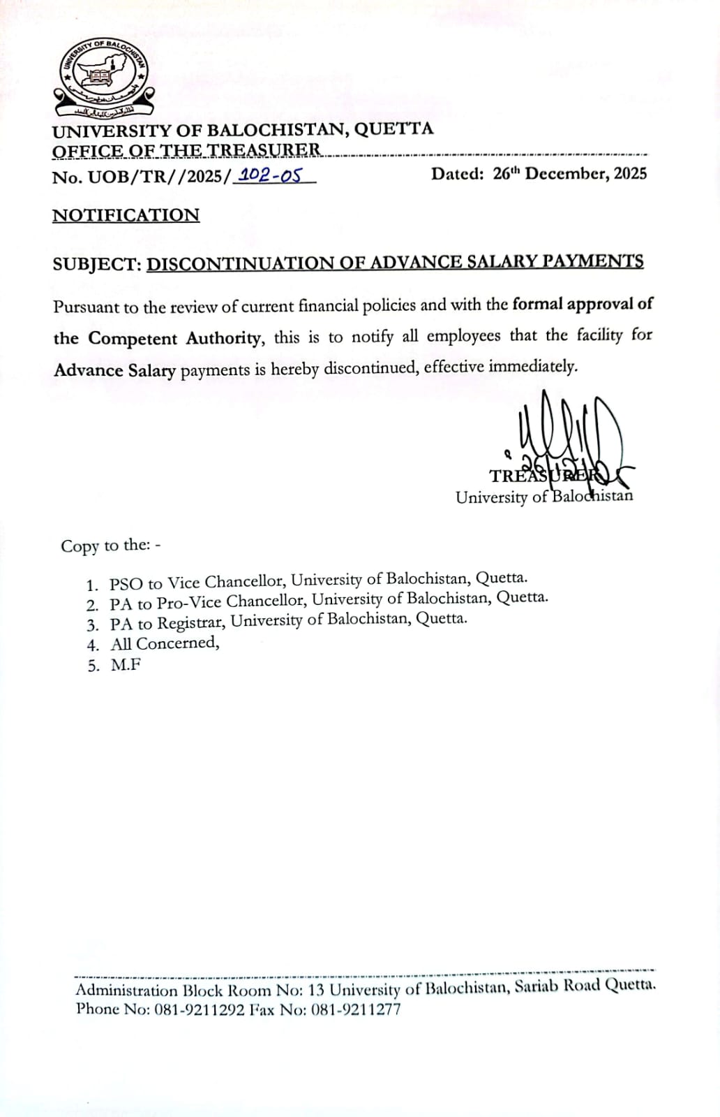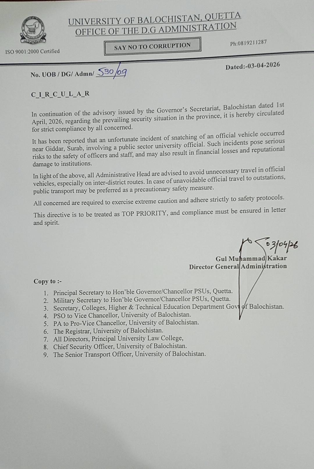 Chancellor's Secretariat, University of Balochistan Quetta. |