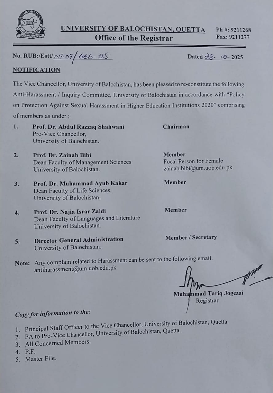 Re-constitution of the Anti-Harassment Inquiry Committee |