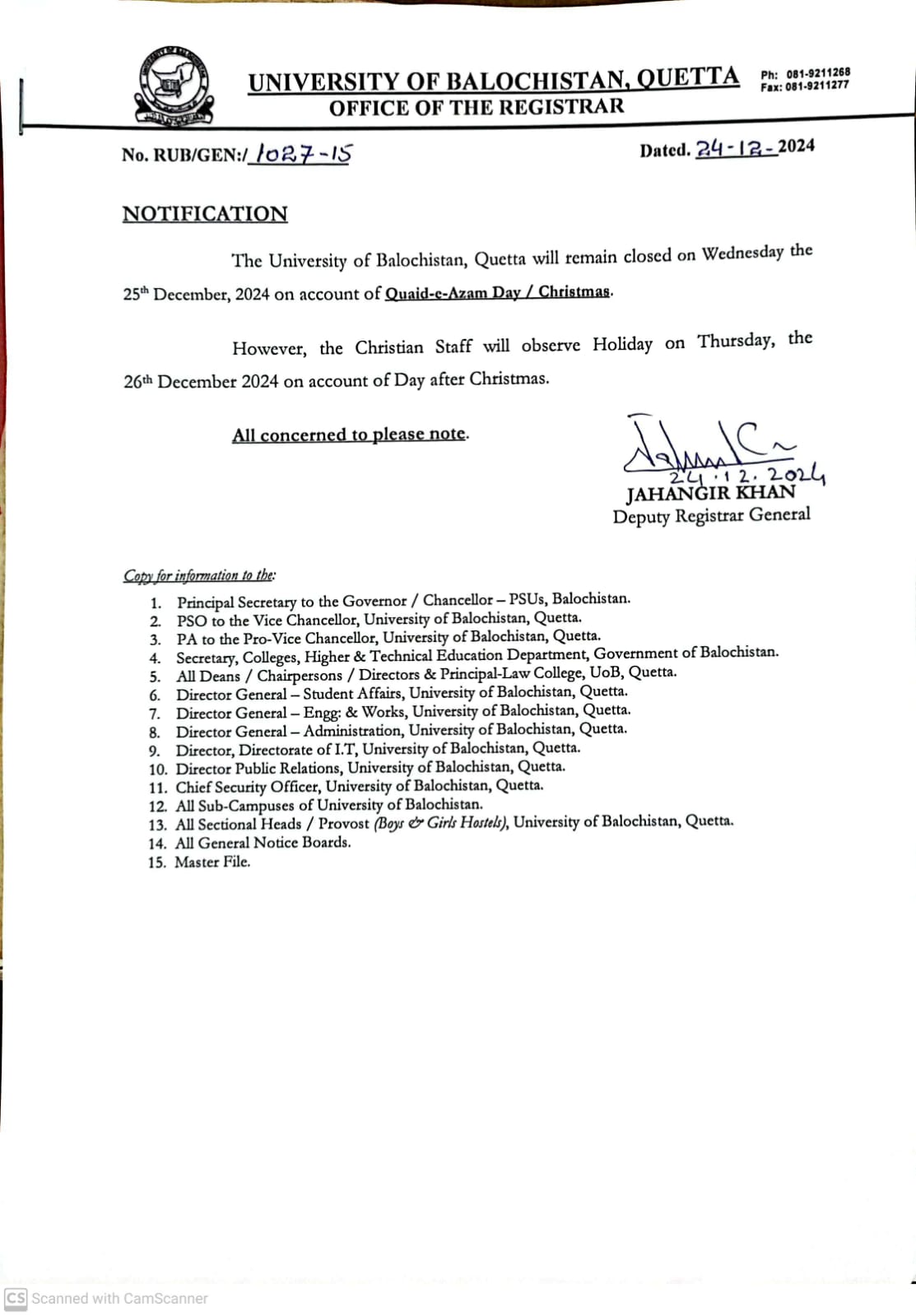 The University will remain closed on 25th December 2020 on account of "Birthday of Quaid-e-Azam"