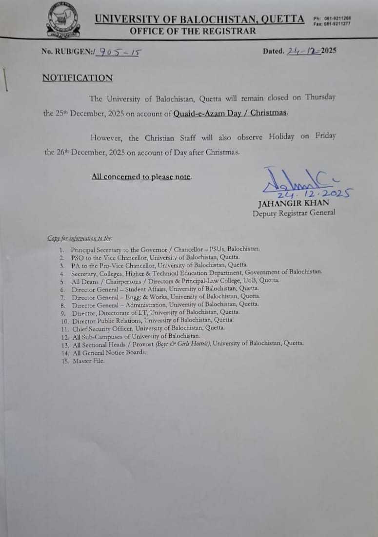 The University will remain closed on 25th December 2025 on account of "Quaid-e-Azam