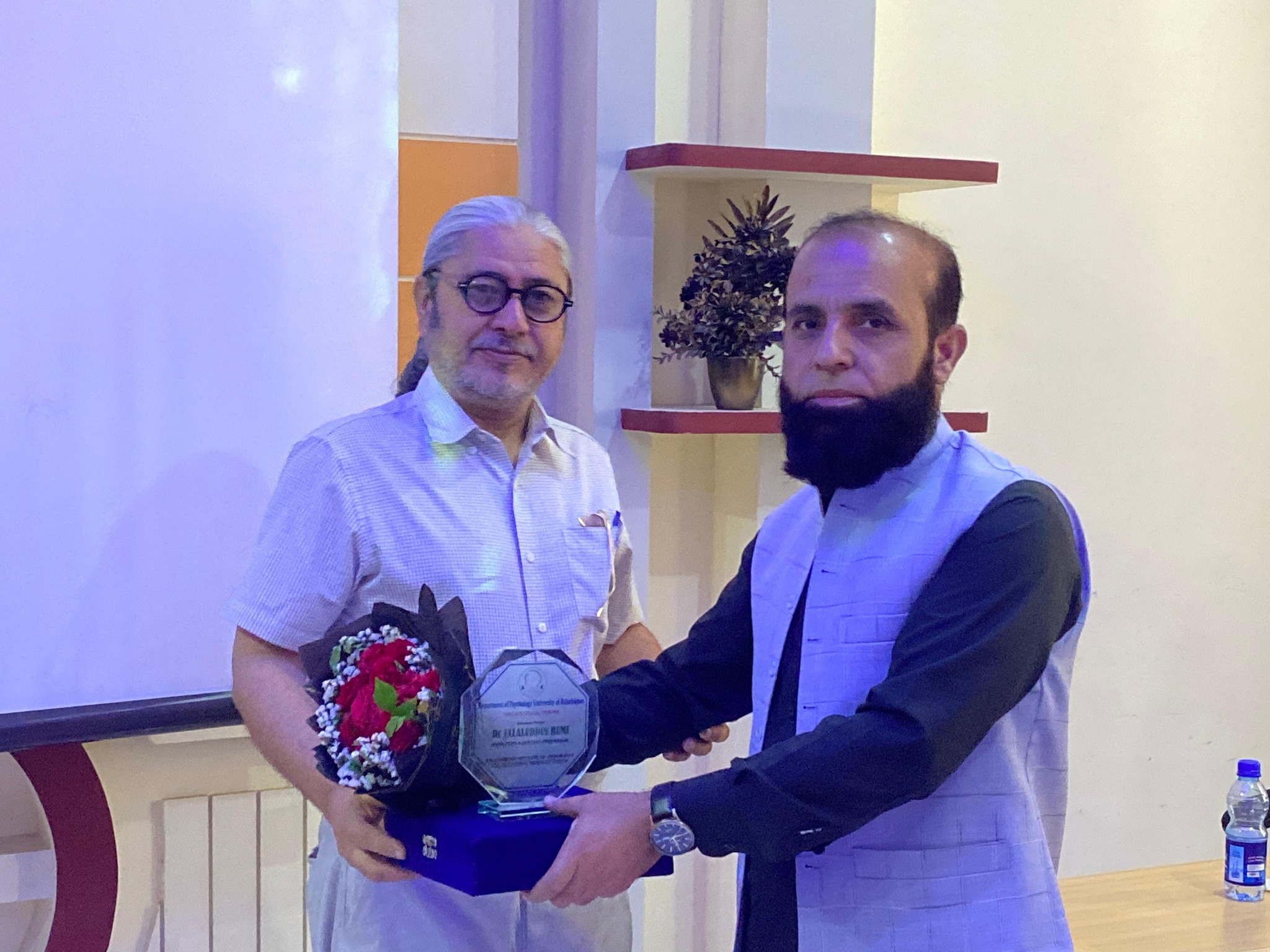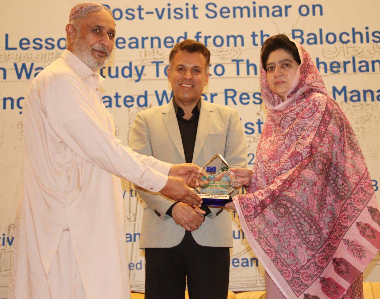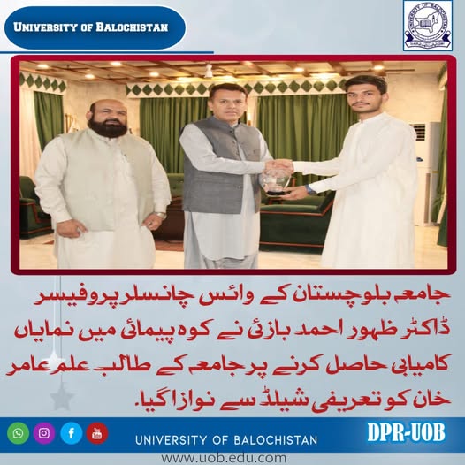 University of Balochistan Vice Chancellor Prof. Dr. Zahoor Ahmed Bazai awarded a shield of appreciation to Aamir Khan, a student of the university, for his outstanding achievement in mountaineering.