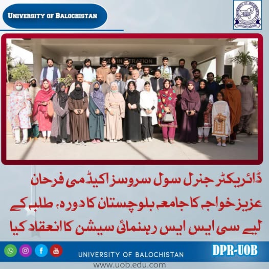 Director General of Civil Services Academy Lahore, Mr. Farhan Aziz Khawaja, met with Vice Chancellor of University of Balochistan, Prof. Dr. Zahoor Ahmad Bazai. A guidance session was organized for the students of the university on CSS exams.