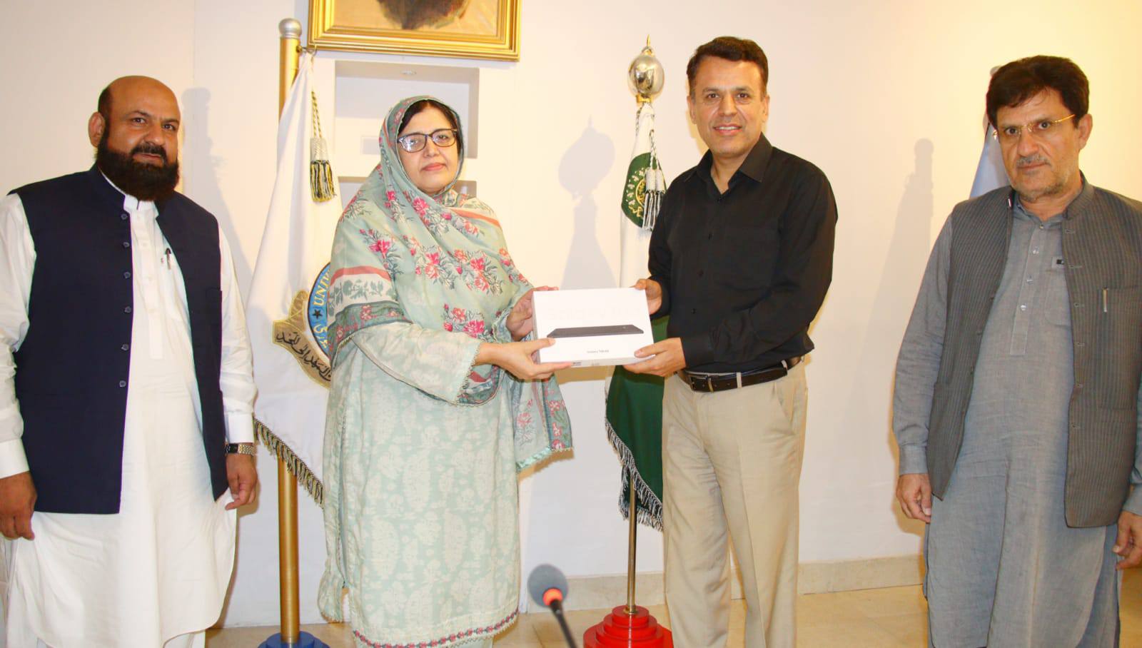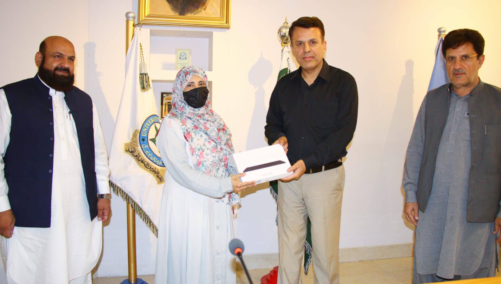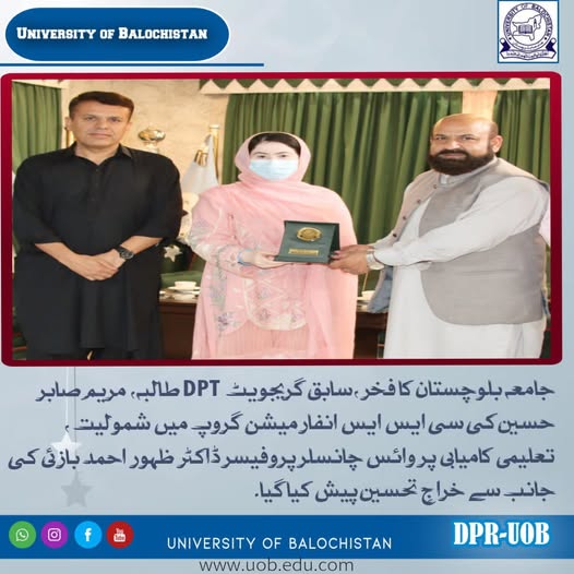 The pride of the University of Balochistan, former graduate student of the Department of DPT, Maryam Sabir Hussain, was felicitated by the Vice Chancellor, Professor Dr. Zahoor Ahmed Bazai, for her academic success in joining the CSS Information Group.