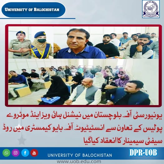 A road safety seminar was organized at the Institute of Biochemistry in collaboration with the National Highways and Motorway Police at the University of Balochistan. University (DPR), June 18, 2025