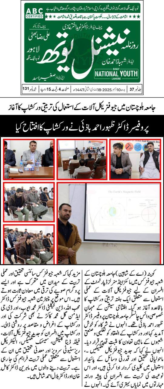 A one-week training workshop for officers of the Mines and Minerals Department on the use of geophysical instruments has begun at the Department of Geophysics, University of Balochistan