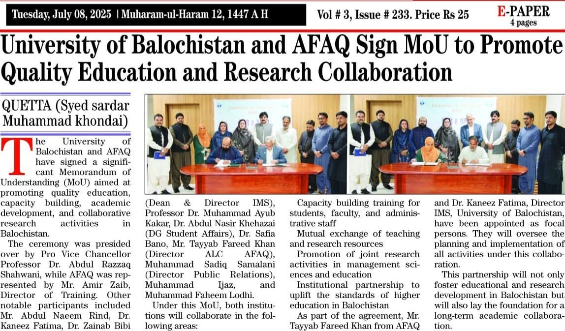 Memorandum of Understanding signed between University of Balochistan and Afaq to promote quality education and research cooperation