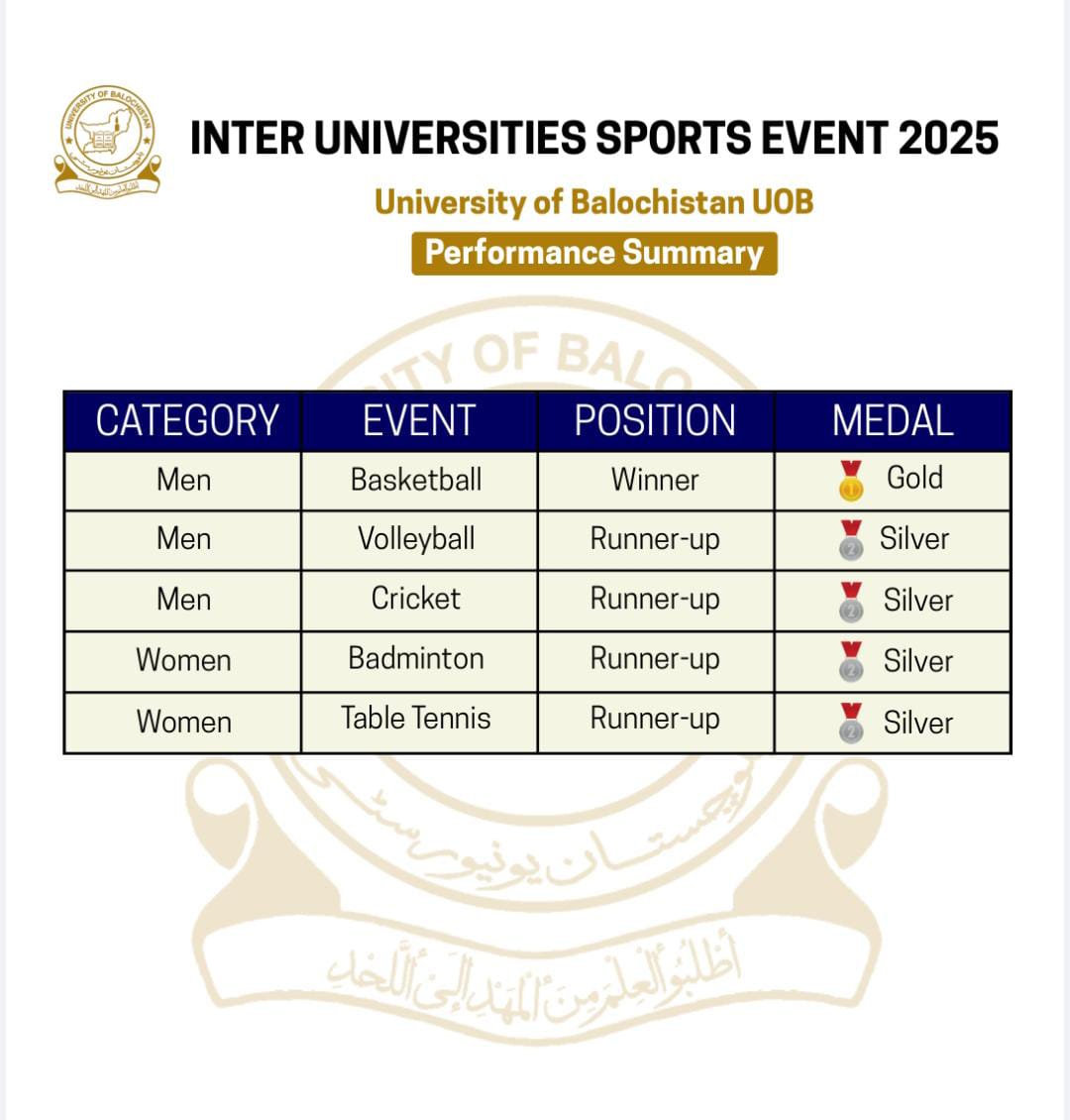 Students of the University of Balochistan achieved outstanding results in the Balochistan Inter-University Competitions.