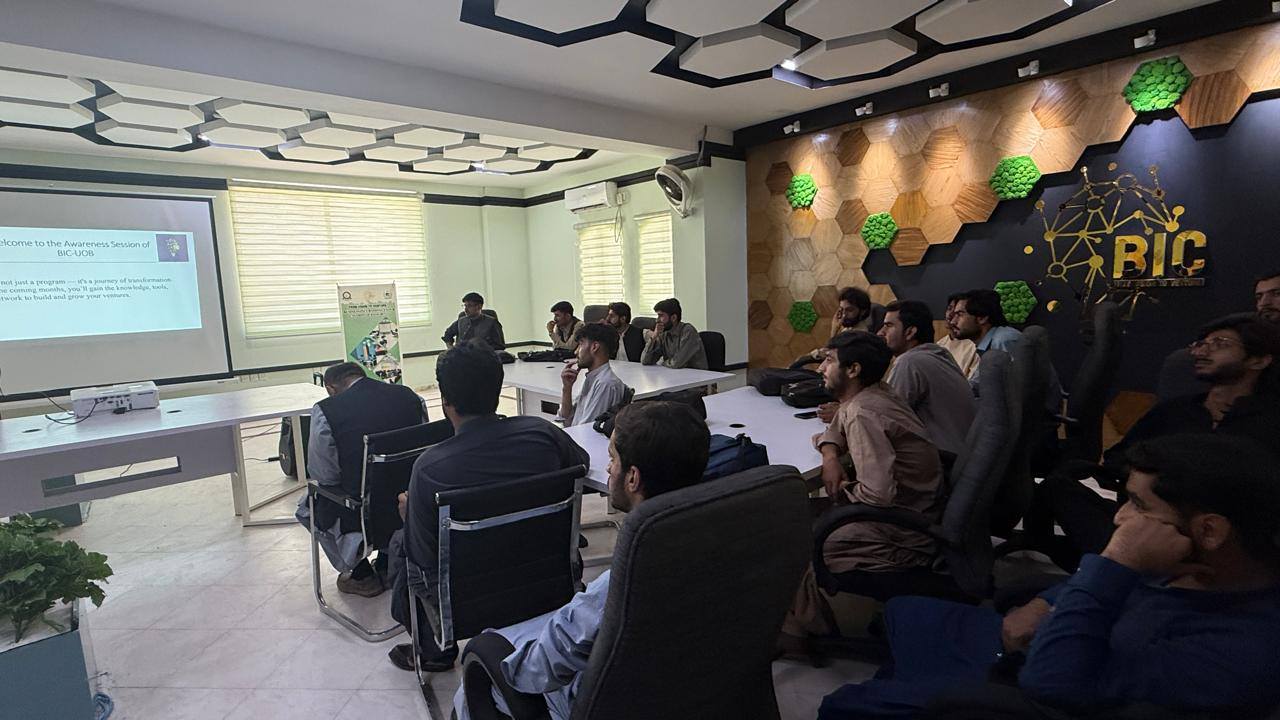 An awareness session was organized by the Business Incubation Center of the University of Balochistan for the students of BUITEMS Balochistan University of Information Technology, Engineering and Management Science. University DPR, June 23, 2025