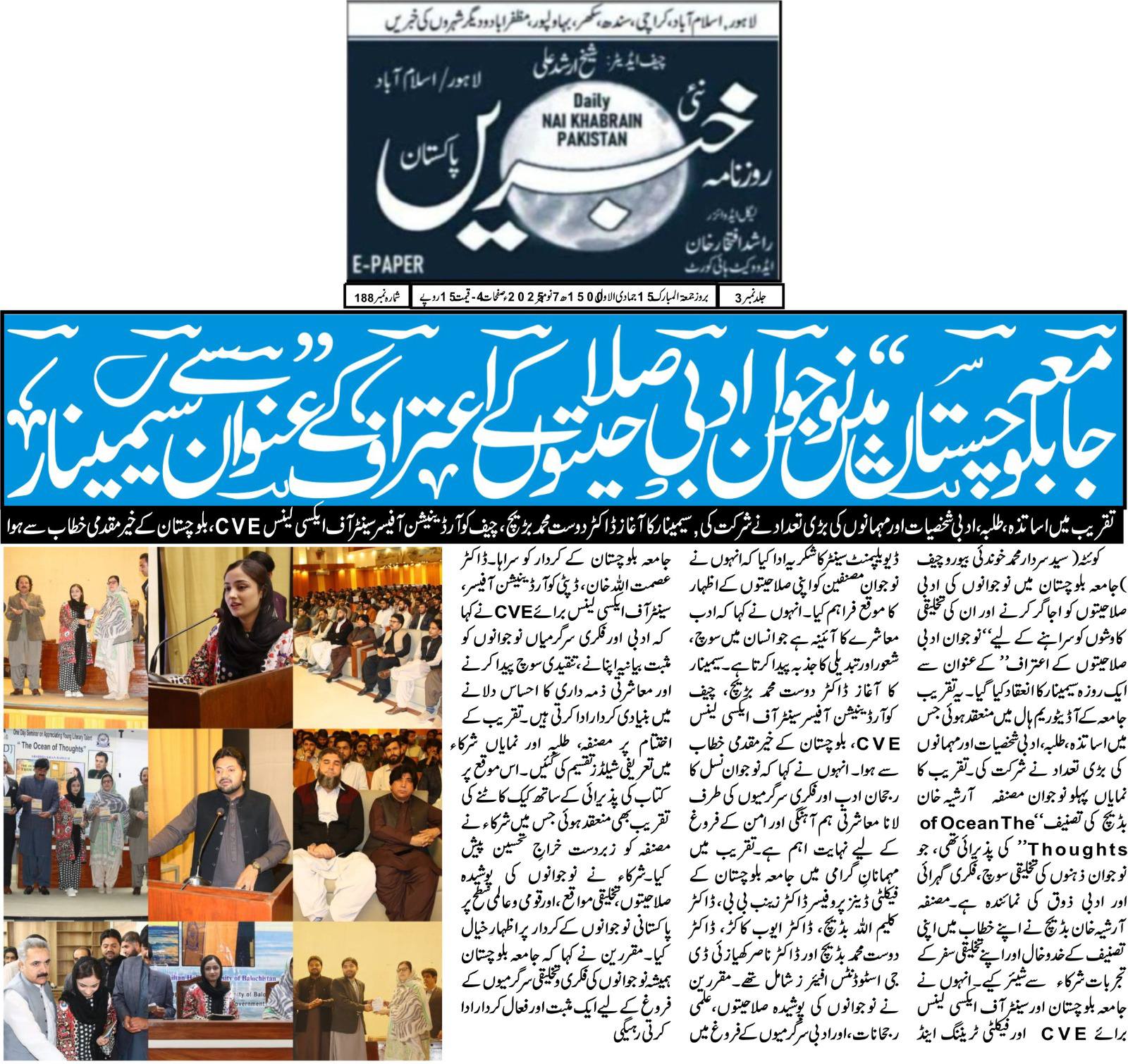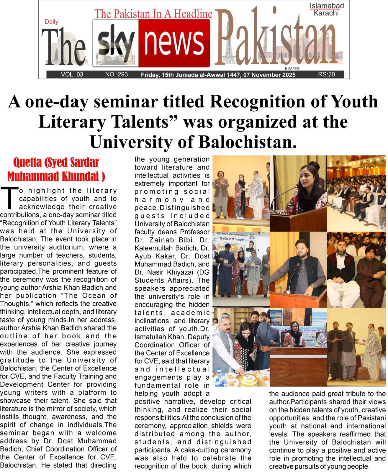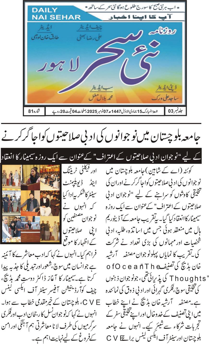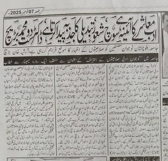 A one-day seminar titled “Recognition of Young Literary Talents” was organized at the University of Balochistan.