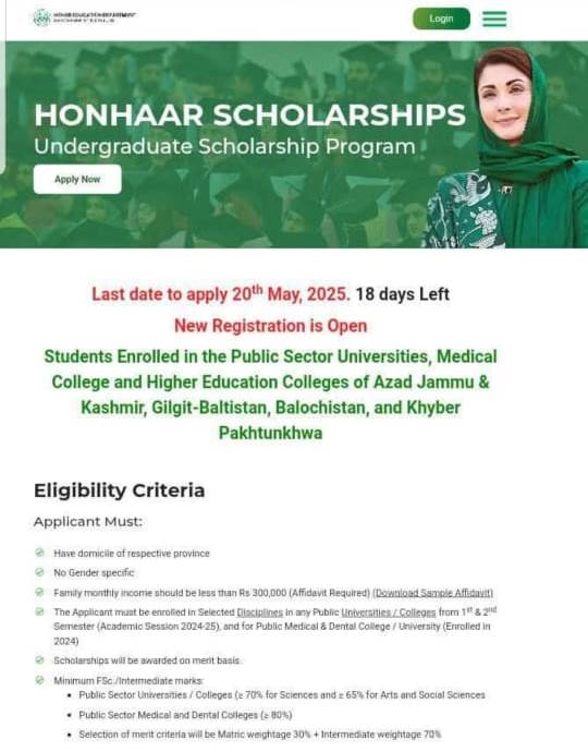 Khyber Pakhtunkhwa (KPK), and Balochistan are eligible to apply for the Honhaar