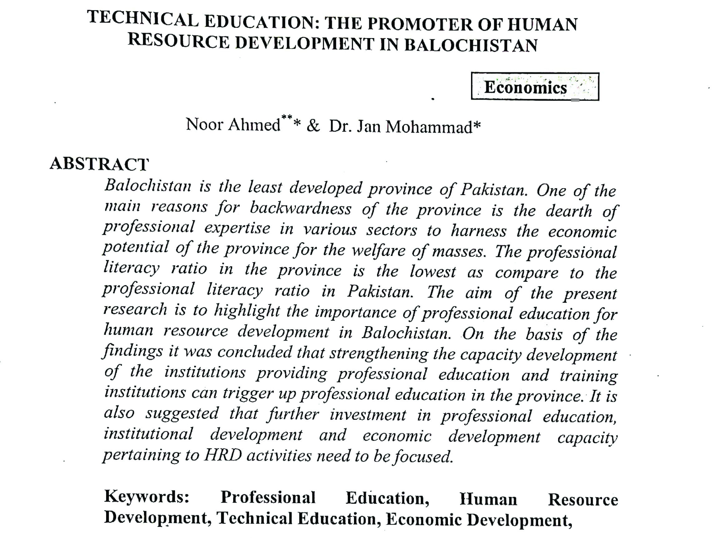 TECHNICAL EDUCATION: THE PROMOTER OF HUMAN RESOURCE DEVELOPMENT IN BALOCHISTAN (abstract)