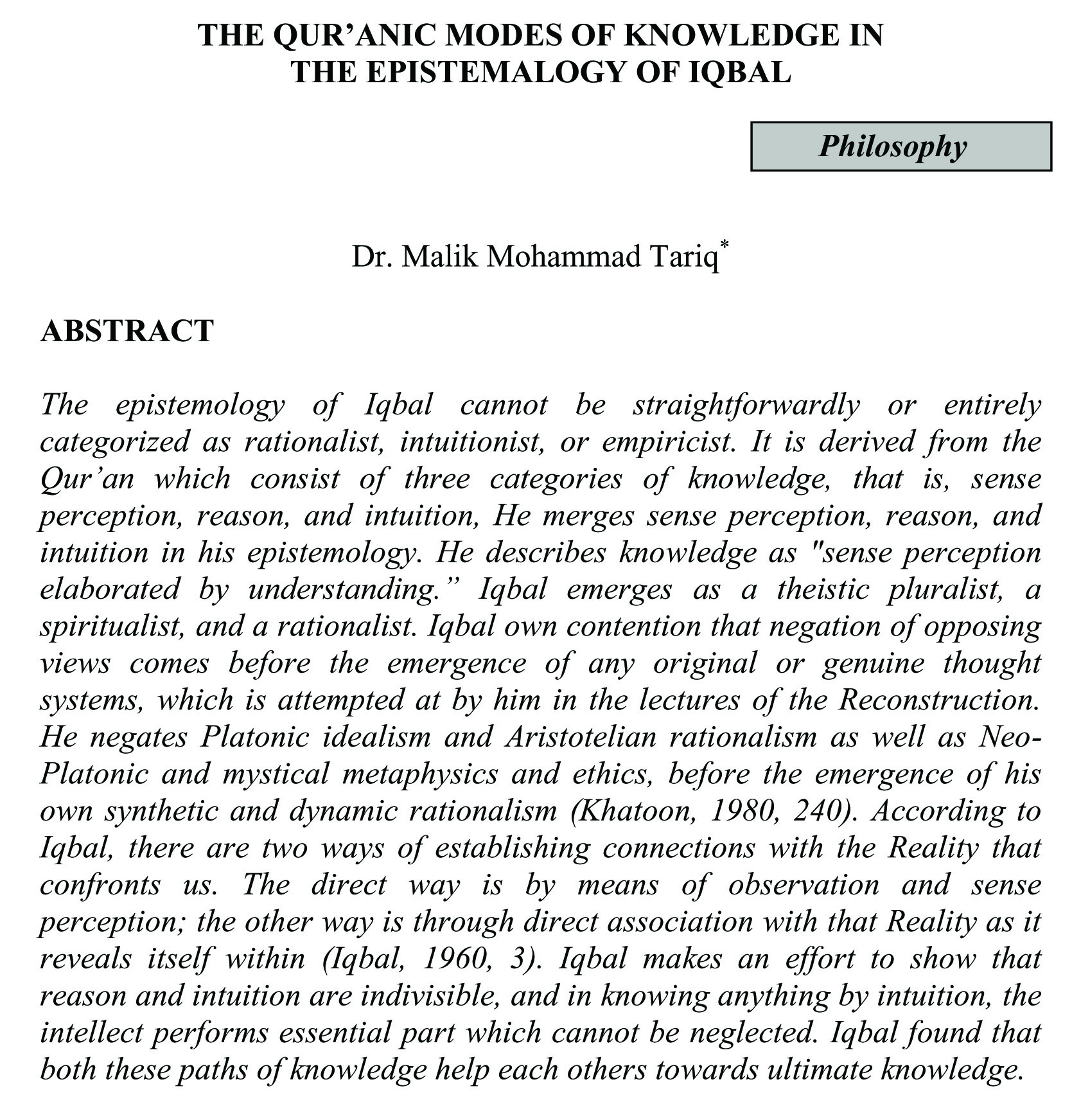 THE QUR'ANIC MODES OF KNOWLEDGE IN THE EPISTEMALOGY OF IQBAL (abstract)