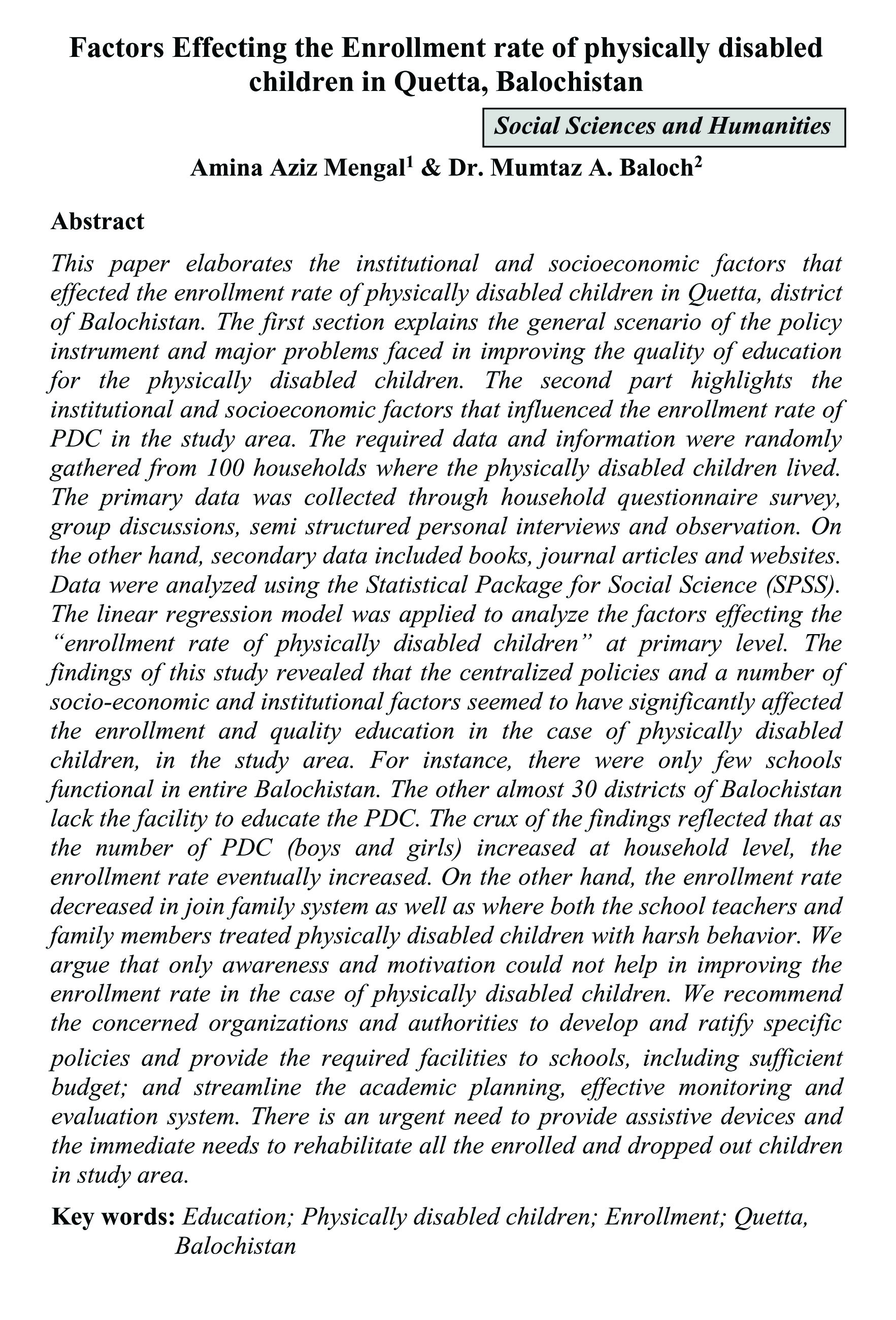 Factors Effecting the Enrollment rate of physically disabled children in Quetta, Balochista (abstract)