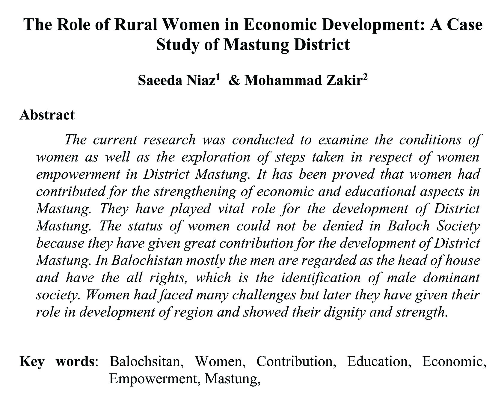The Role of Rural Women in Economic Development: A Case Study of Mastung District (abstract)