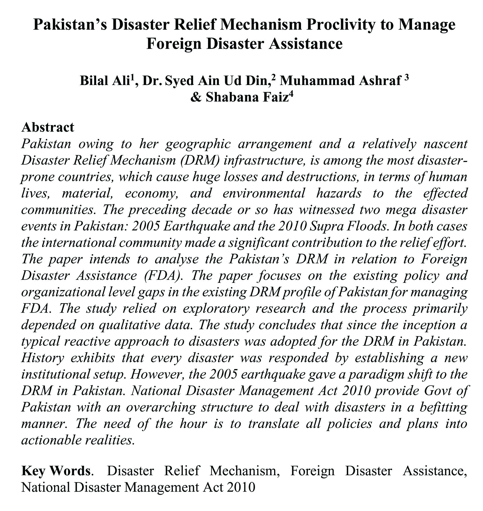 Pakistan's Disaster Relief Mechanism Proclivity to Manage Foreign Disaster Assistance (abstract)
