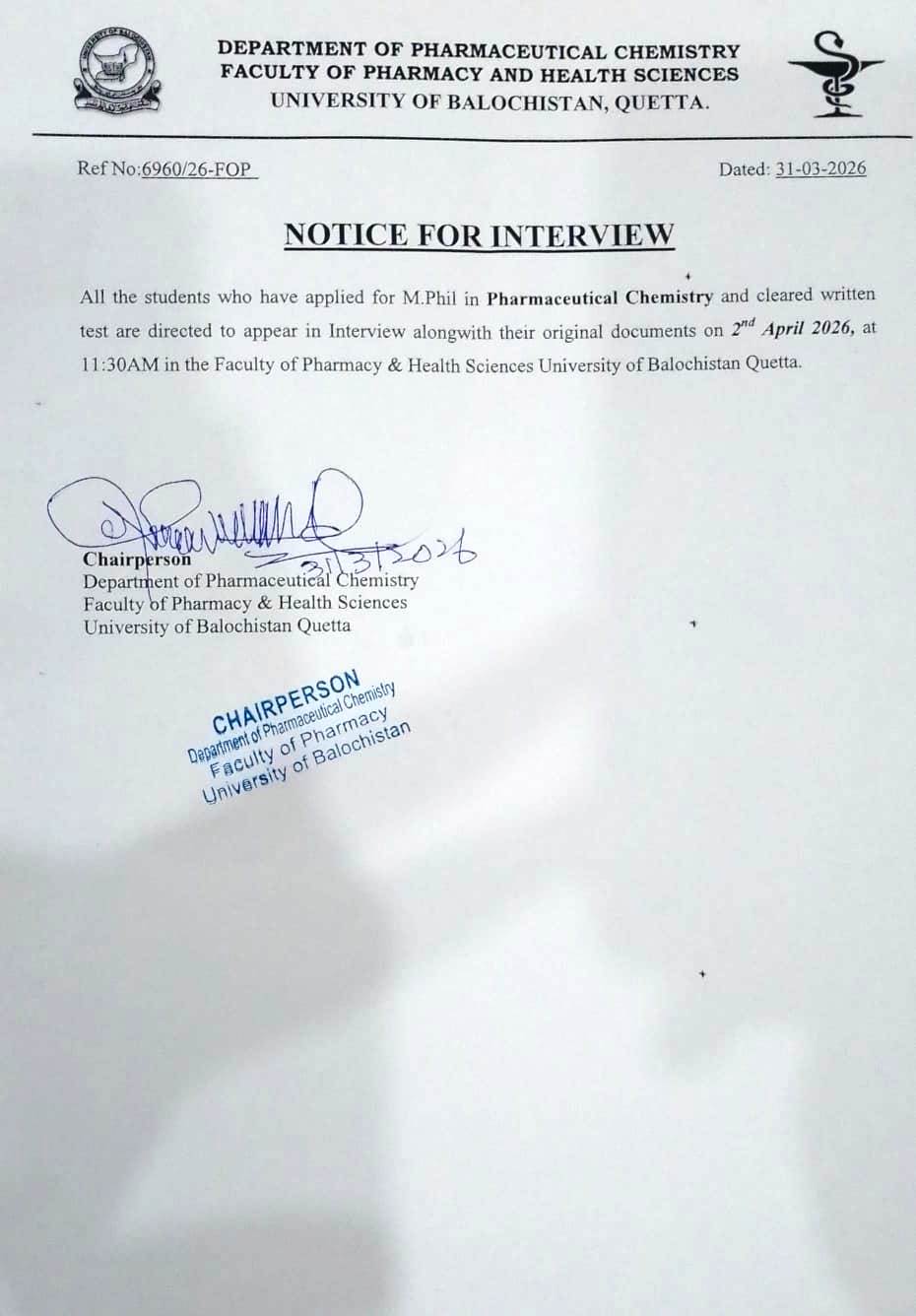 Interview Notice for MS Pharmaceutical Chemistry