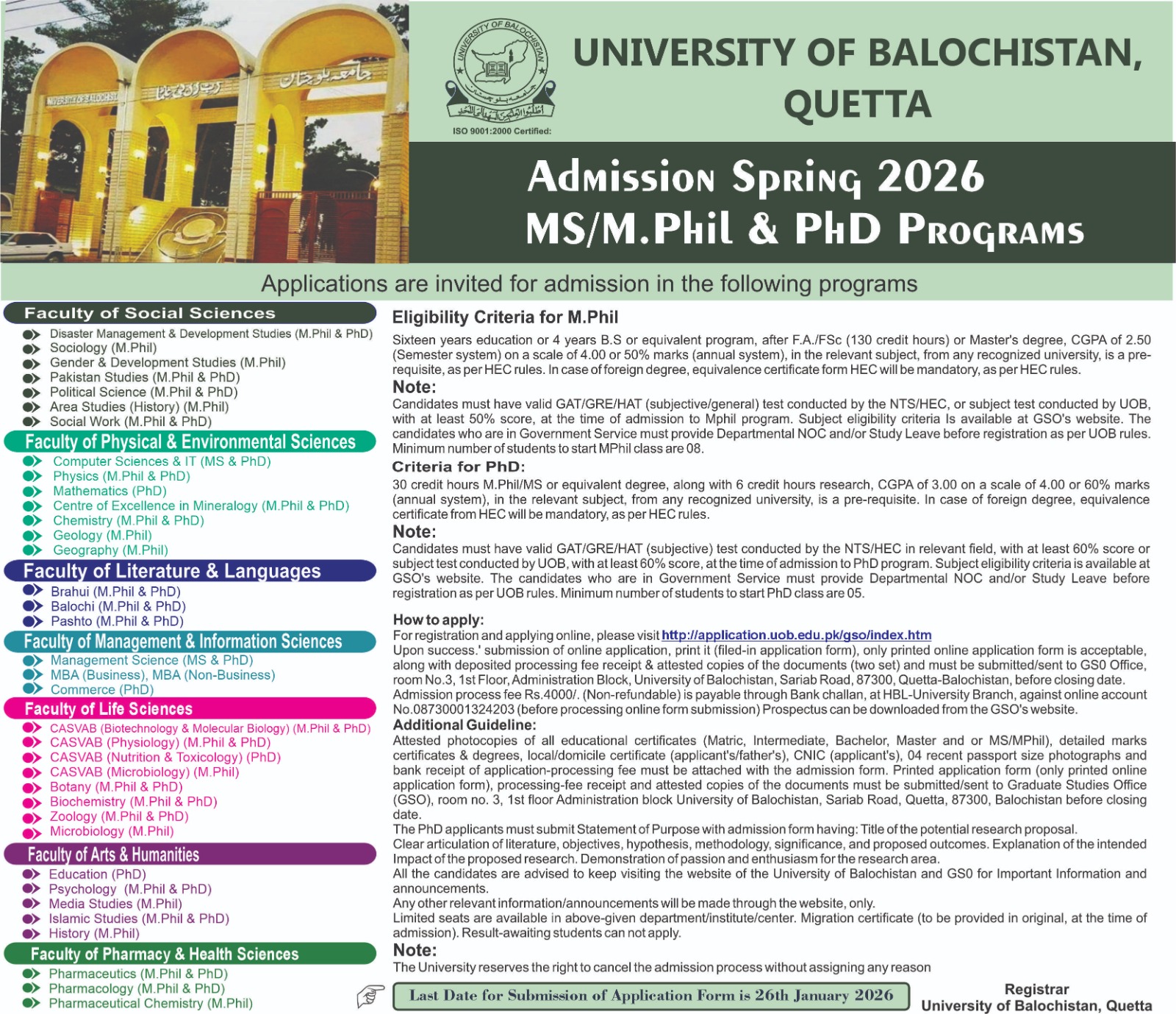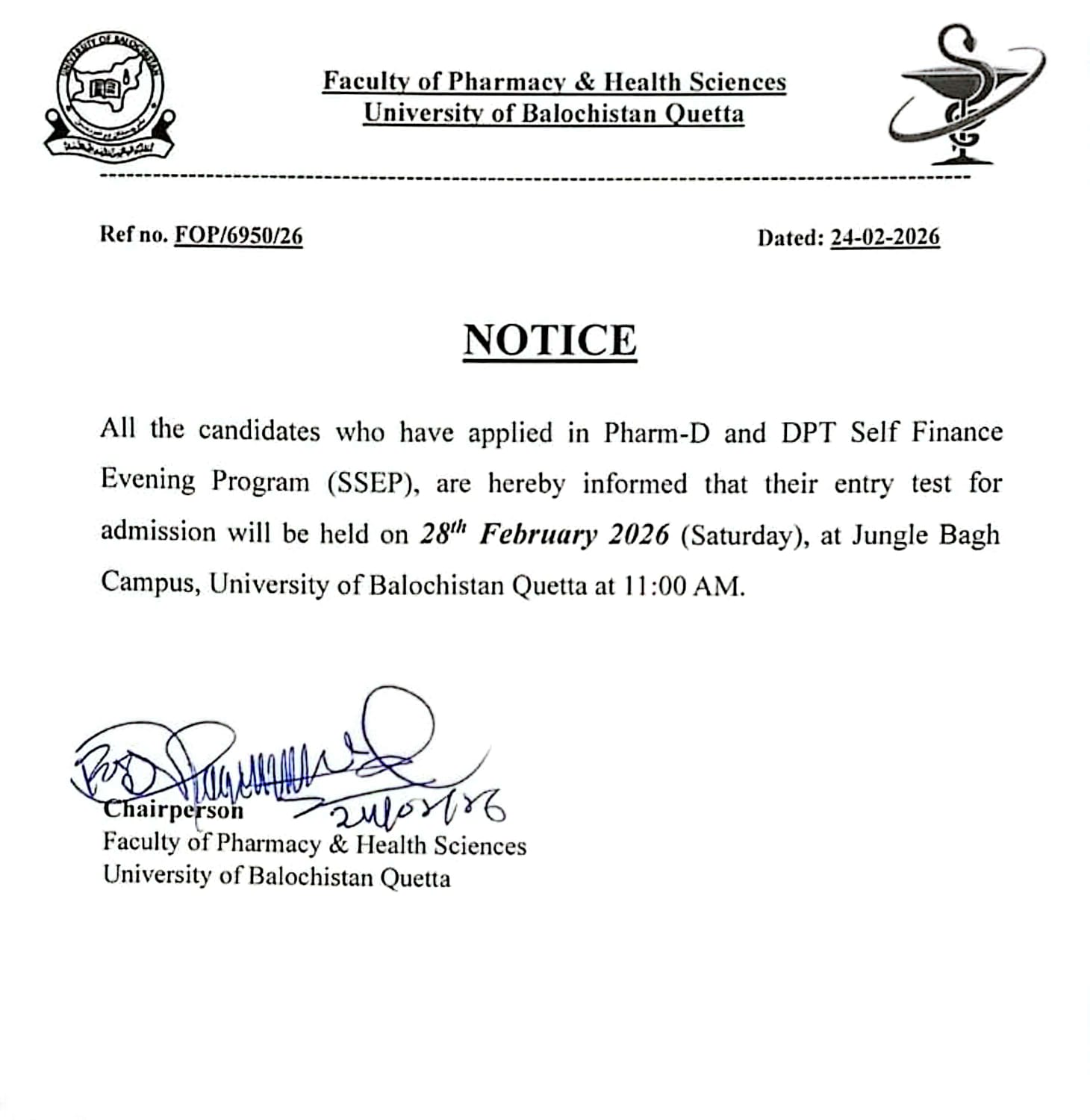 of Pharmacy (Main campus), Mastung Campus, Pishin Campus and Doctor of Physical