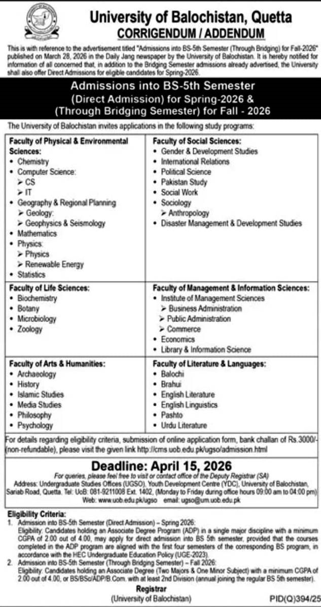 Admissions are open for 5th semester via Bridging Semester