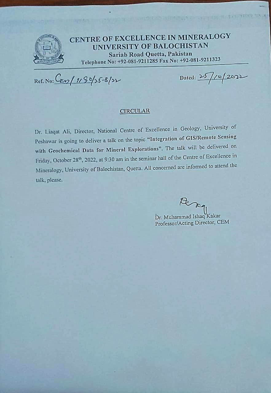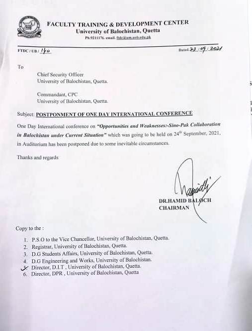 current situation" One Day International Conference on " Opportunities and Weaknesses:-Sino-Pak Collaboration in Balochistan under the current situation" on 24 sep 2021 at 10:00 AM to 03:00 PM (University Auditorium) |