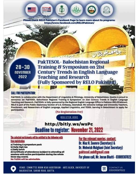 | PakTESOL - Balochistan Chapter "Two-Day Training & One-Day Symposium" on 21st Century Trends in English Language Teaching and Research |