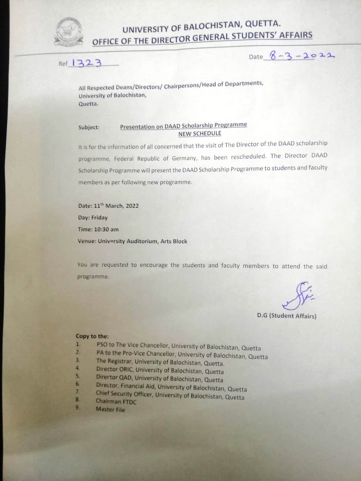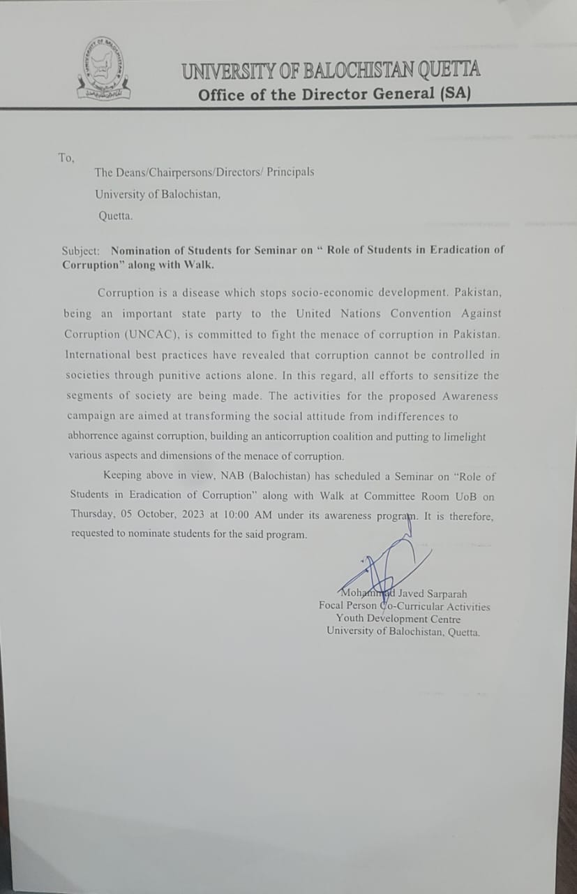 One hour Seminar on "Wafafaqi Mohtasib Office" will be held on 03-12-19 at 10:00 AM Till 11:00 AM in the Auditorium of UoB. |