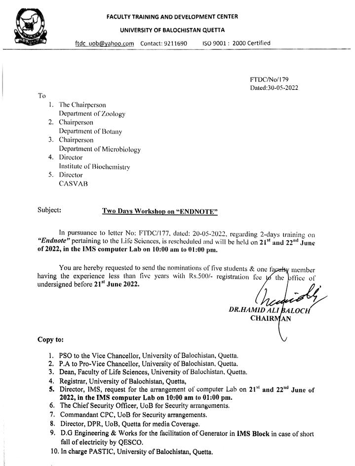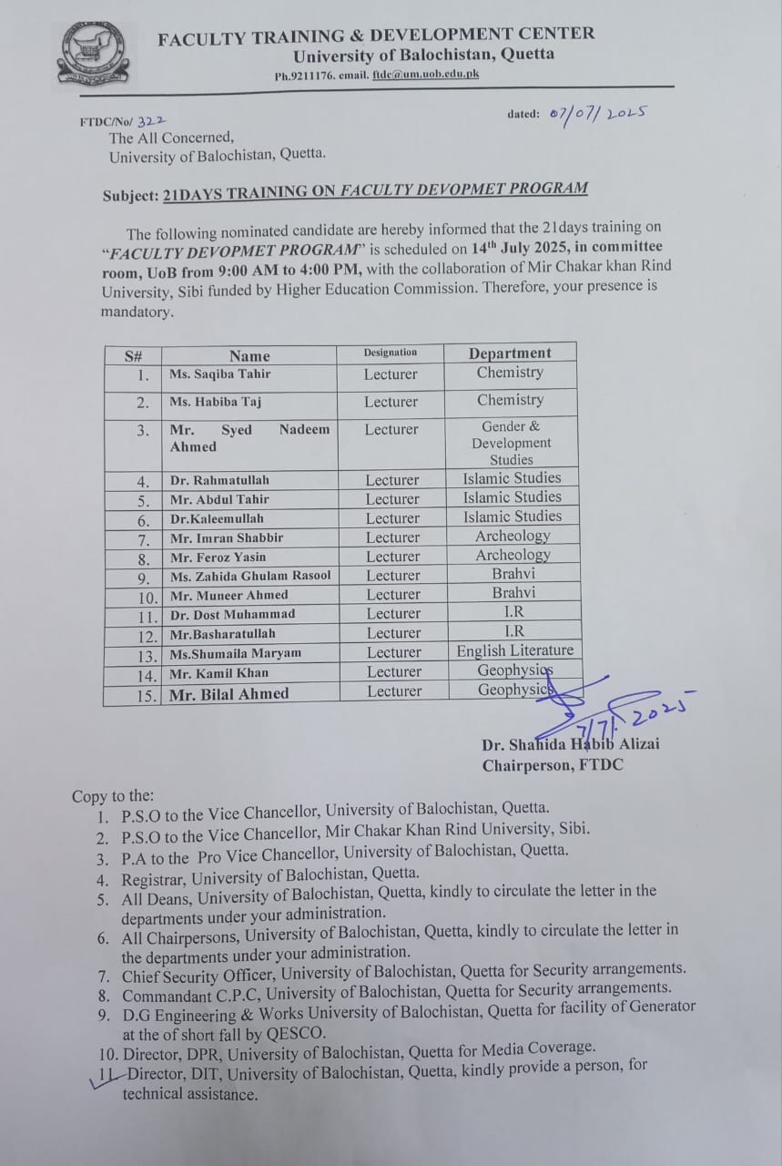 | 10 Days Professional Development Training for Upgraded Administrative staff University of Balochistan |
